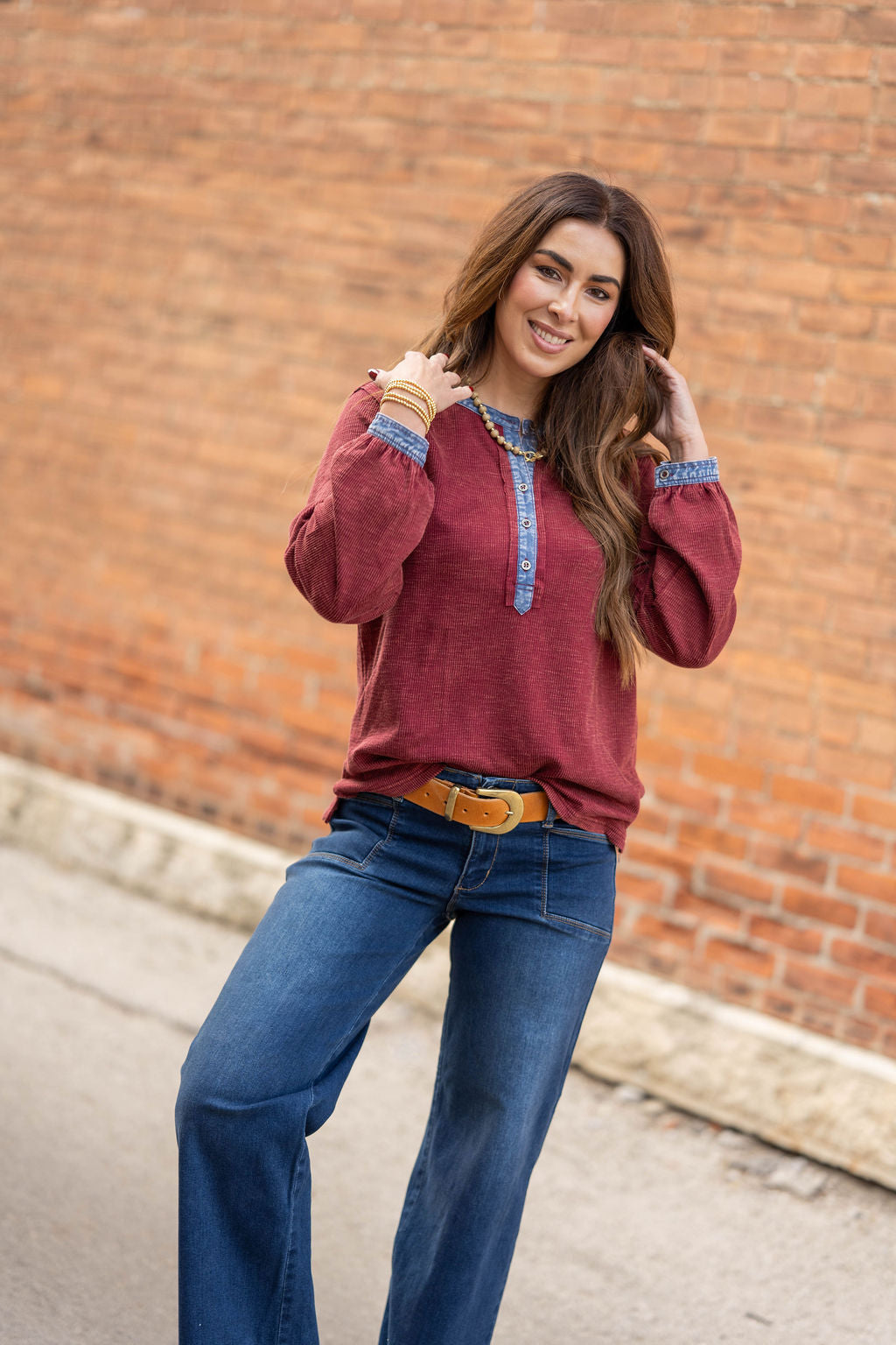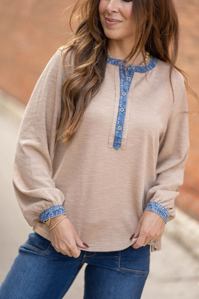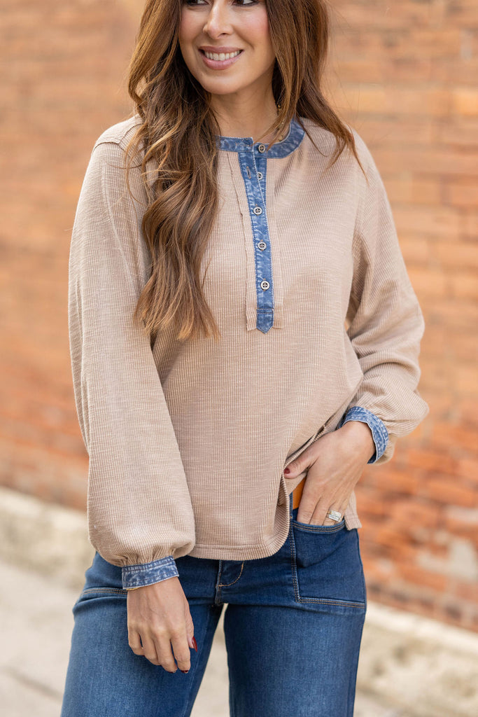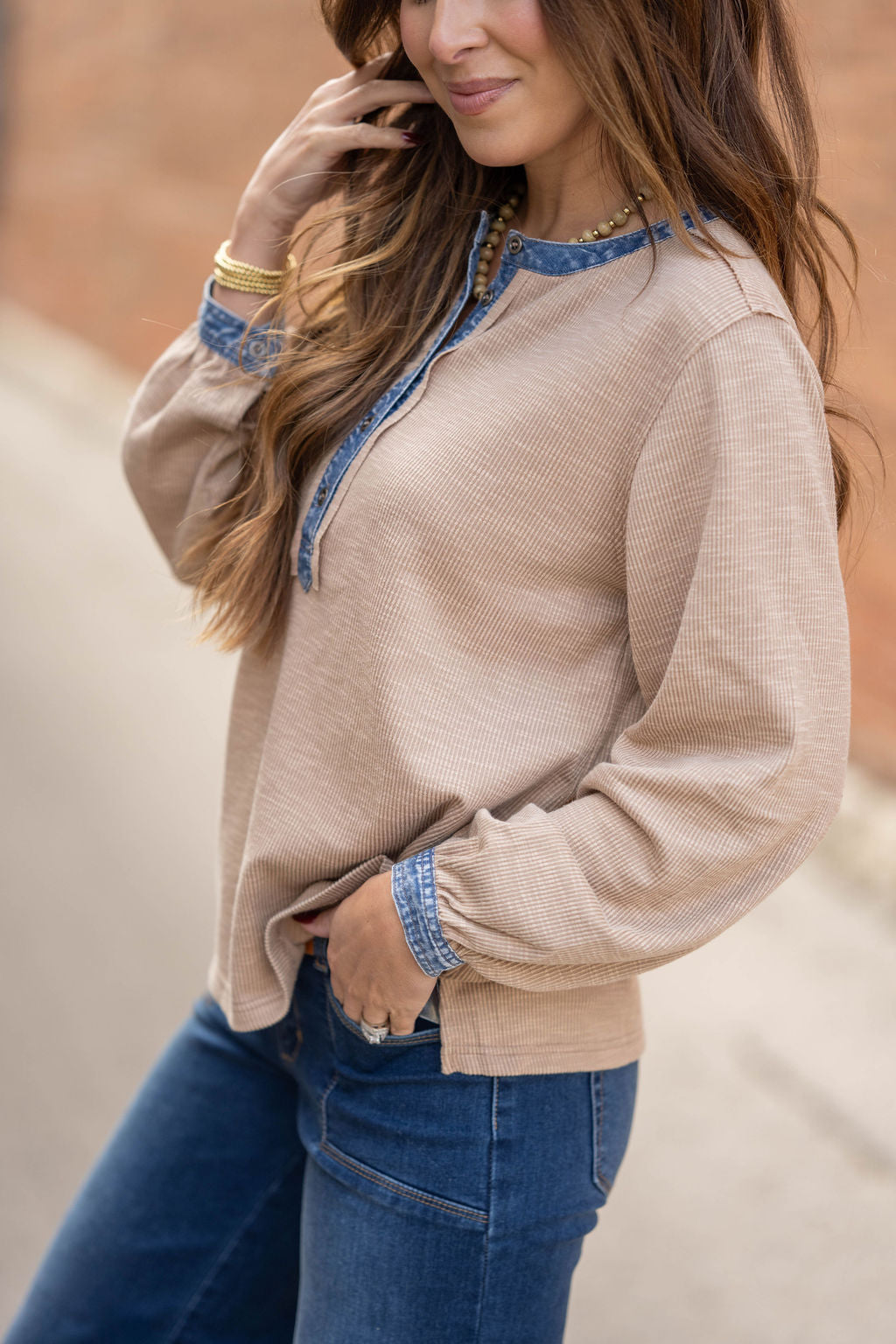 A cozy, laid-back top with a touch of rustic style. The soft-textured fabric and denim trim detailing make it a perfect pick for casual days with a polished edge.
