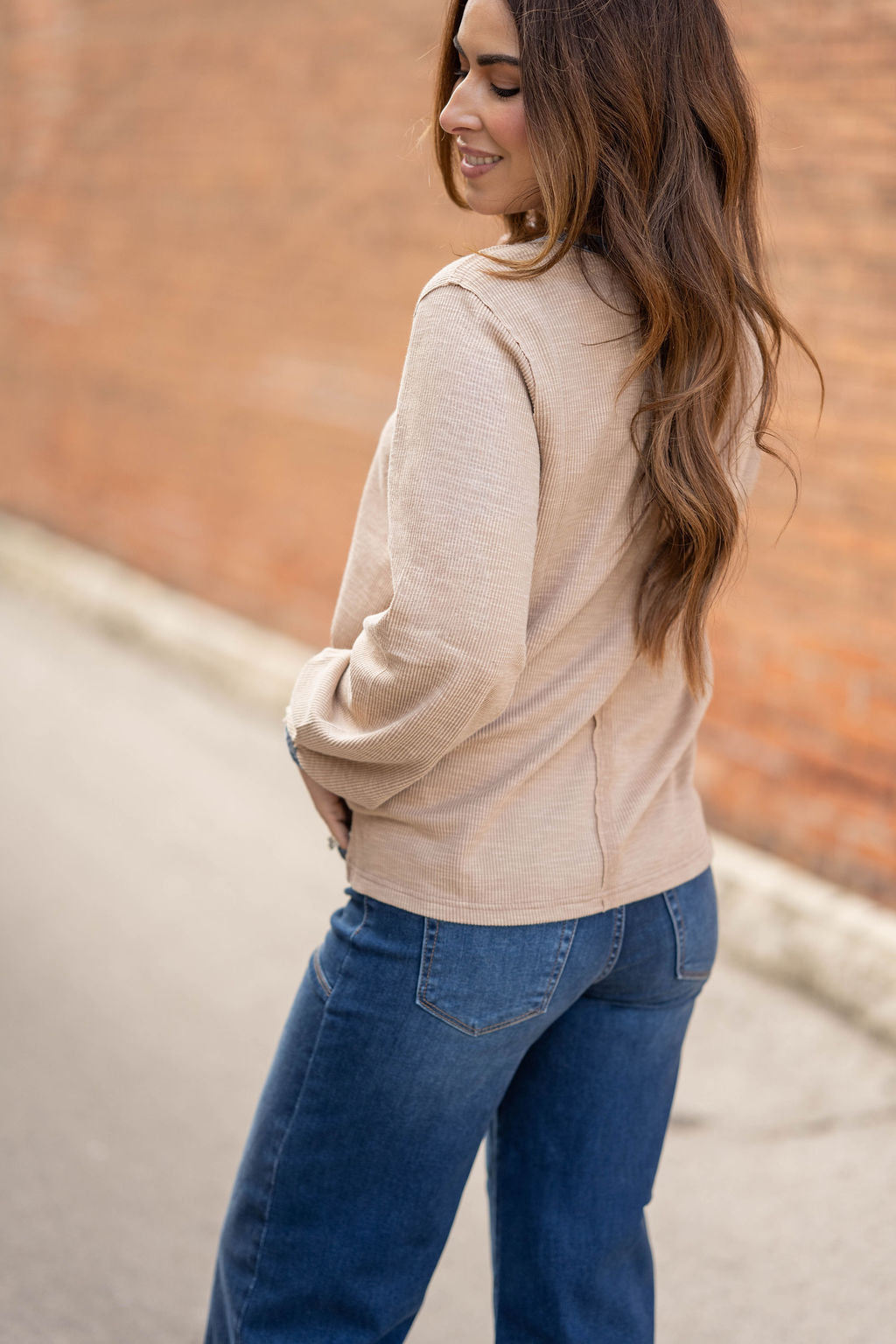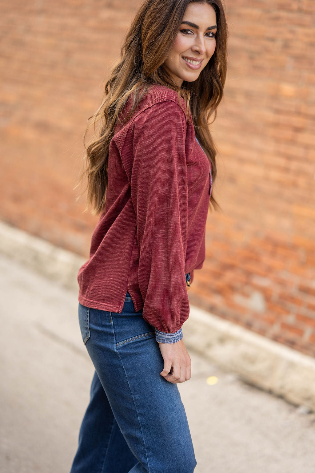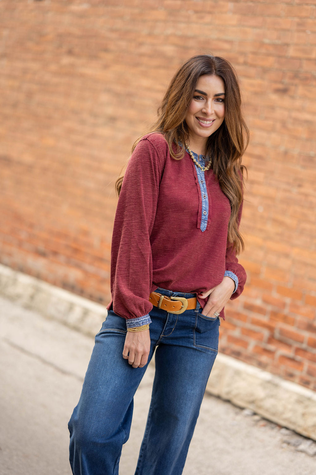 A cozy, laid-back top with a touch of rustic style. The soft-textured fabric and denim trim detailing make it a perfect pick for casual days with a polished edge.