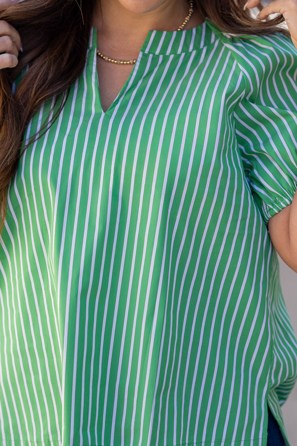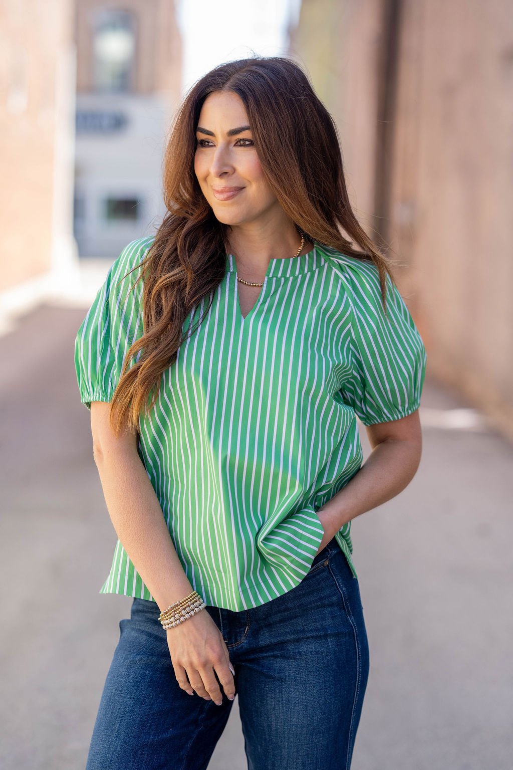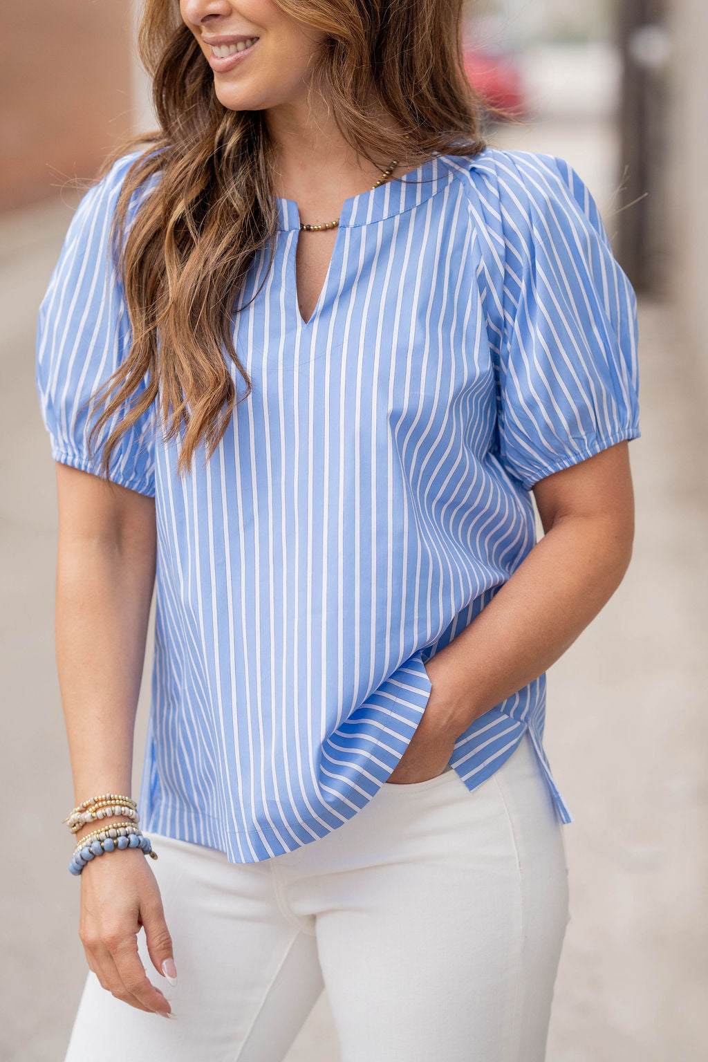 Bright, crisp, and effortlessly put-together—this striped top is your go-to for easy everyday style. Featuring classic pinstripes, it brings just the right pop of color while still feeling timeless. The relaxed fit, split neckline, and subtle puff sleeves add a feminine touch that pairs perfectly with denim for a polished yet casual look.
