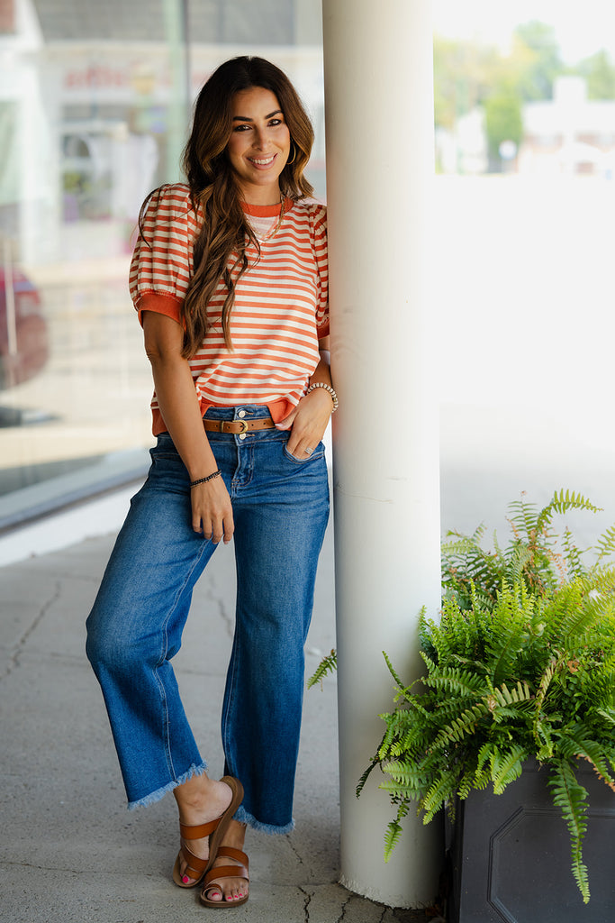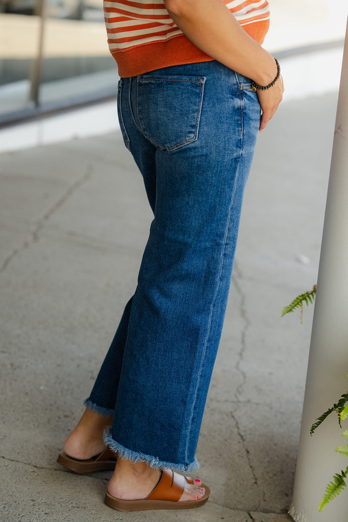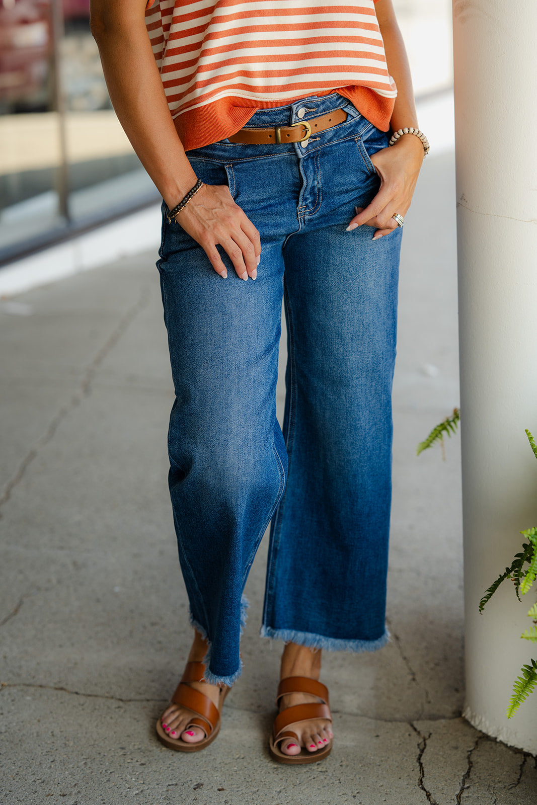 These high-rise cropped jeans feature a wide leg and wide band detailing to set them apart from the rest! Dress these up or down with ease for everyday wear.
