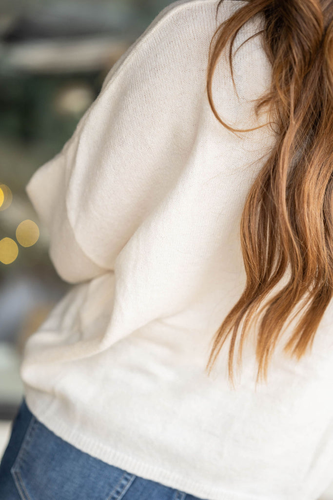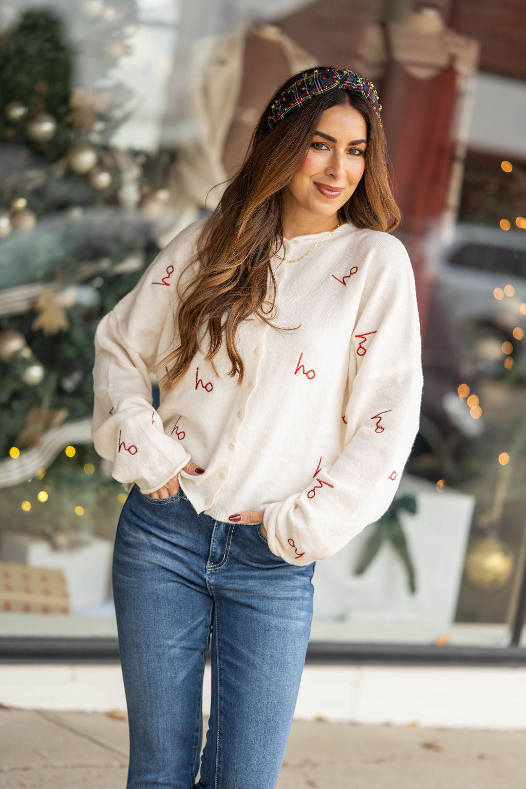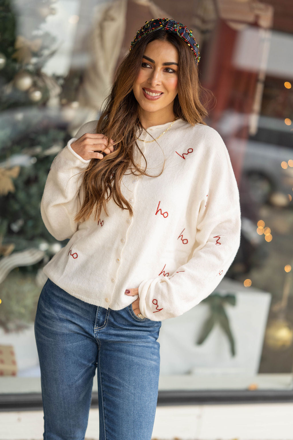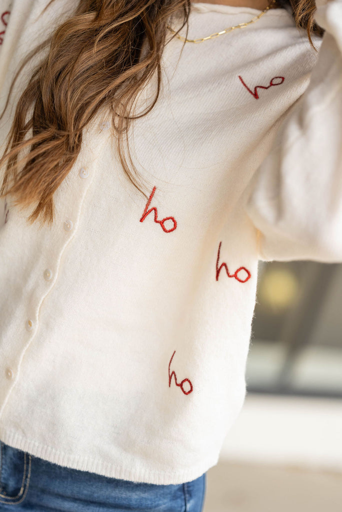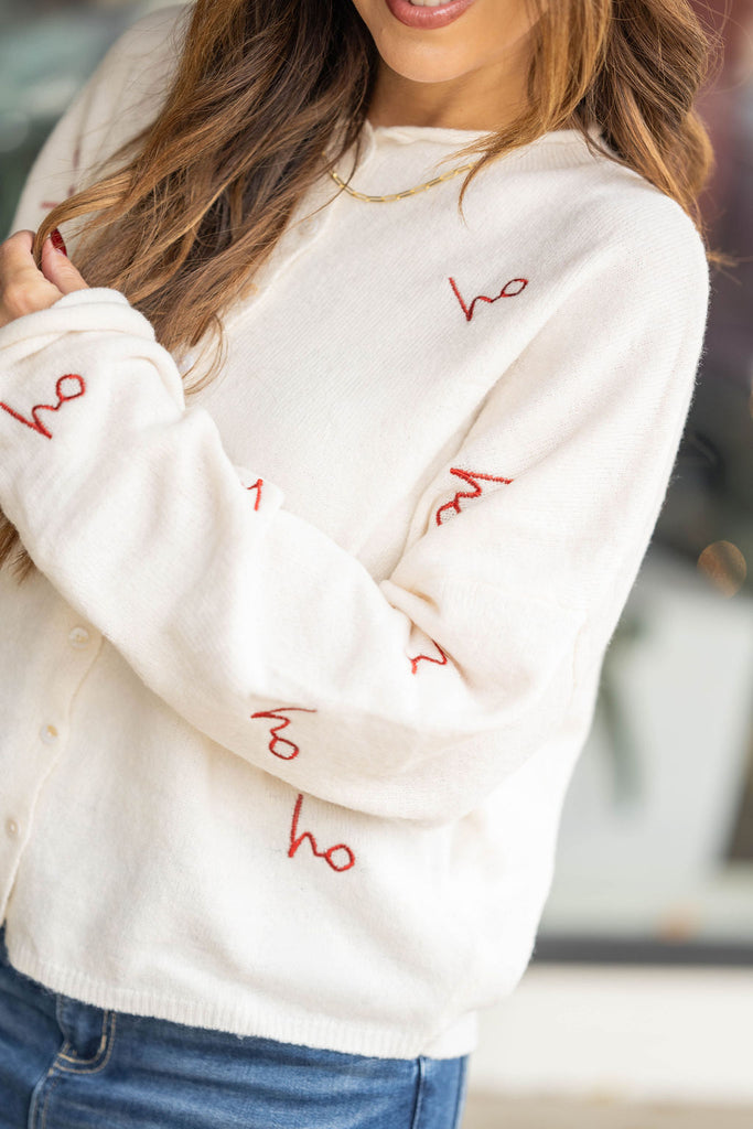 Add a playful touch of holiday cheer with this charming embroidered cardigan. Designed in a soft, creamy knit and sprinkled with delicate red “ho ho” stitching across the sleeves and front, it’s festive without feeling over-the-top.