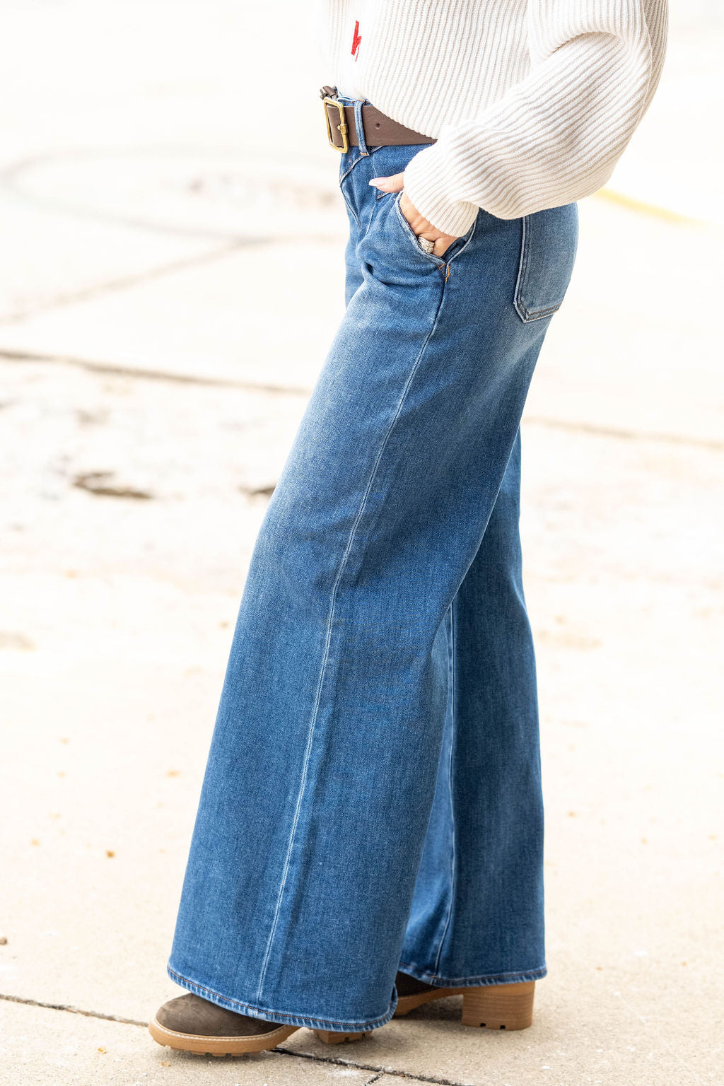 These wide-leg jeans bring a fresh, modern twist to classic denim. Designed with subtle front pleats and a smooth high-rise waistband, they create a flattering shape that drapes beautifully through the leg. The medium blue wash adds a timeless feel, making them easy to dress up with sweaters or keep casual with everyday basics.