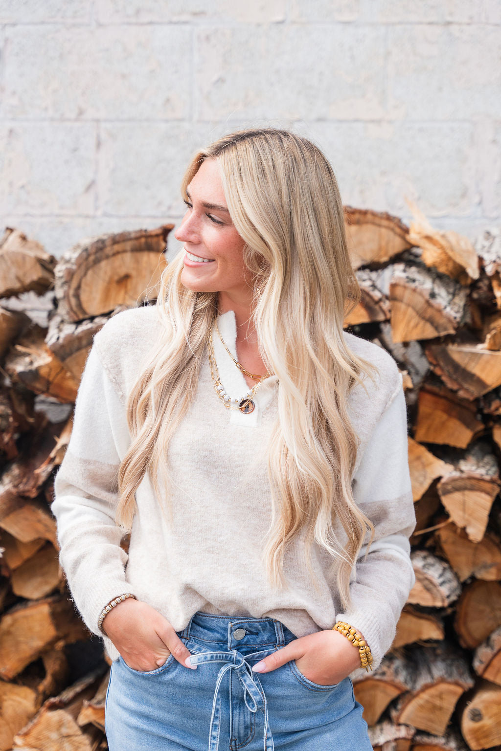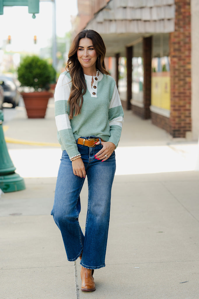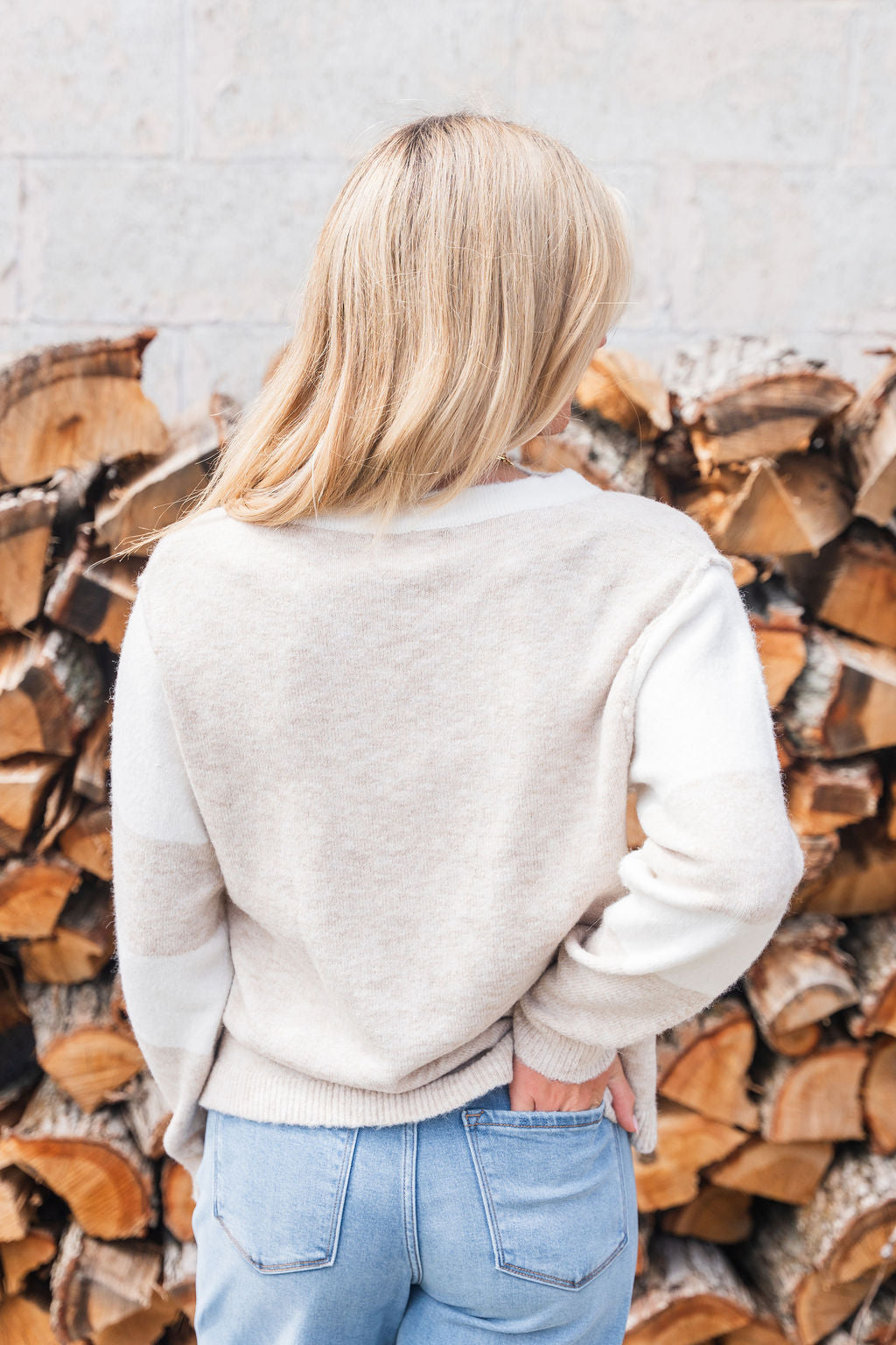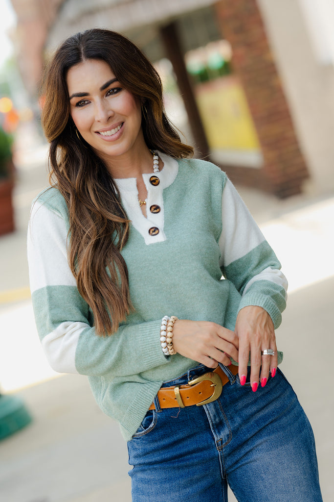 This unique sweater is going to have you receiving compliments all day long! The fun blocked sleeves with the button accents and soft material gives this a chic vibe! Pair with your favorite denim or jeggings for a more elevated feel or with joggers or leggings for a casual look.