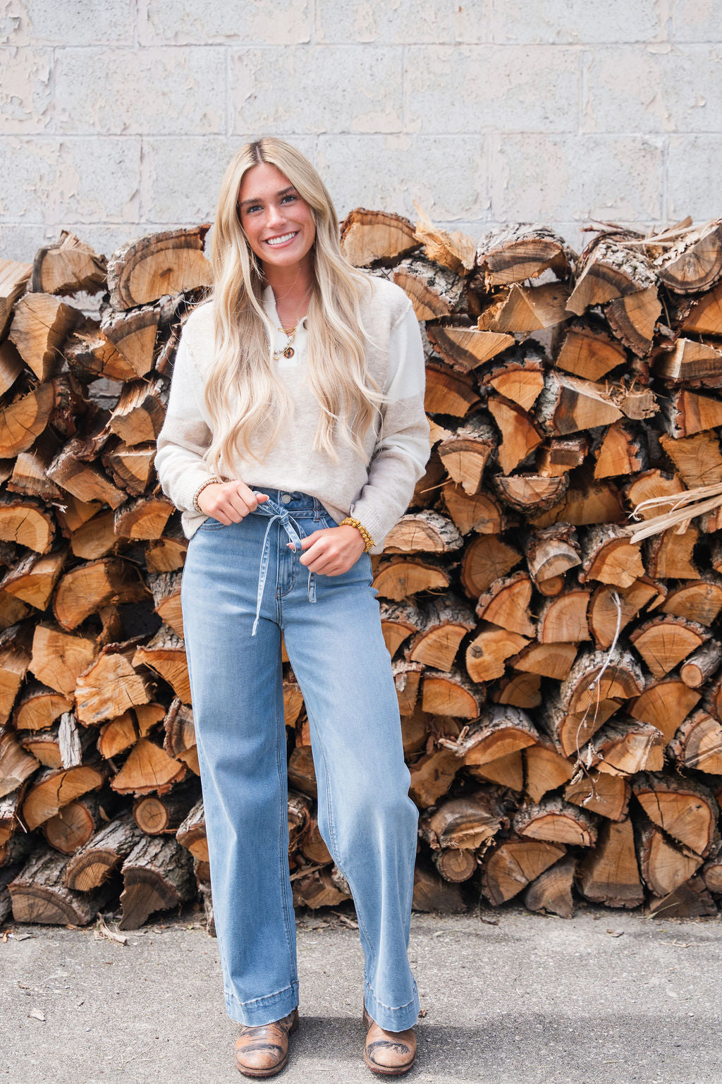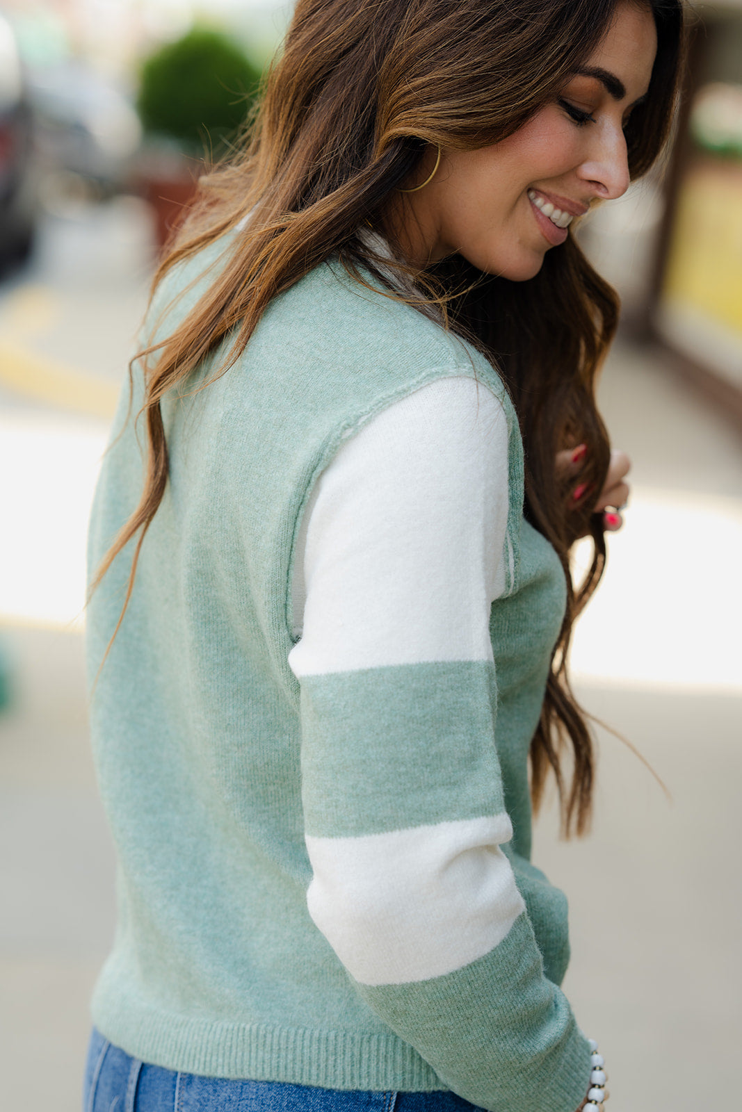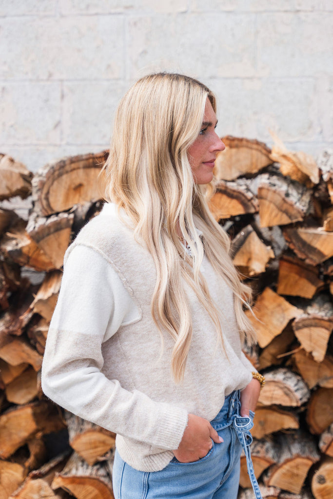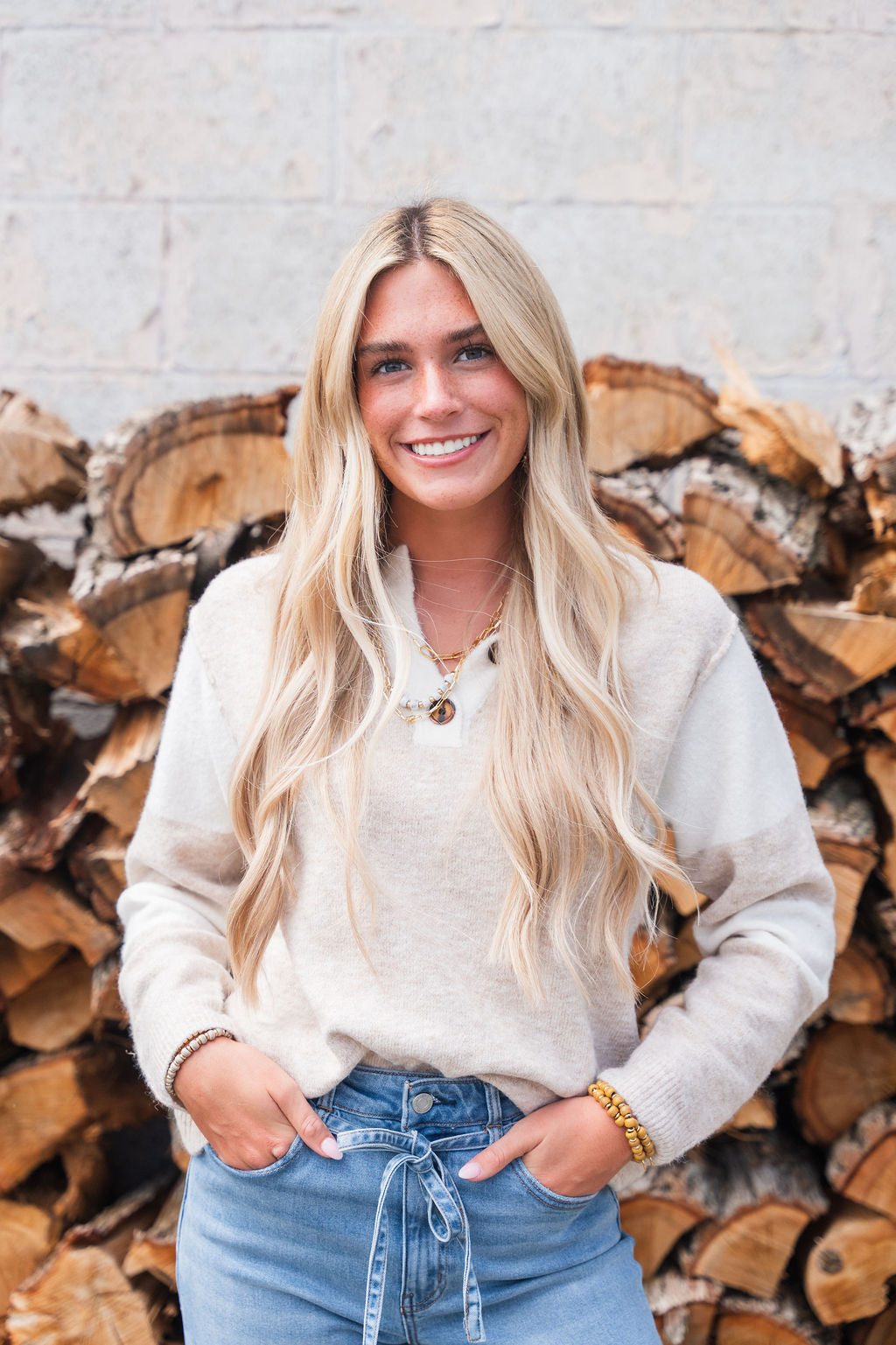 This unique sweater is going to have you receiving compliments all day long! The fun blocked sleeves with the button accents and soft material gives this a chic vibe! Pair with your favorite denim or jeggings for a more elevated feel or with joggers or leggings for a casual look.