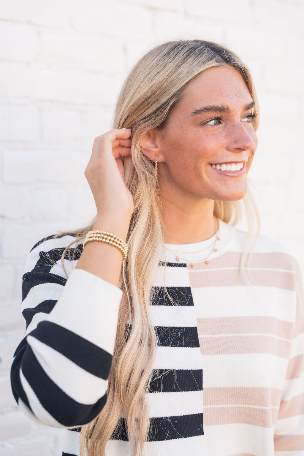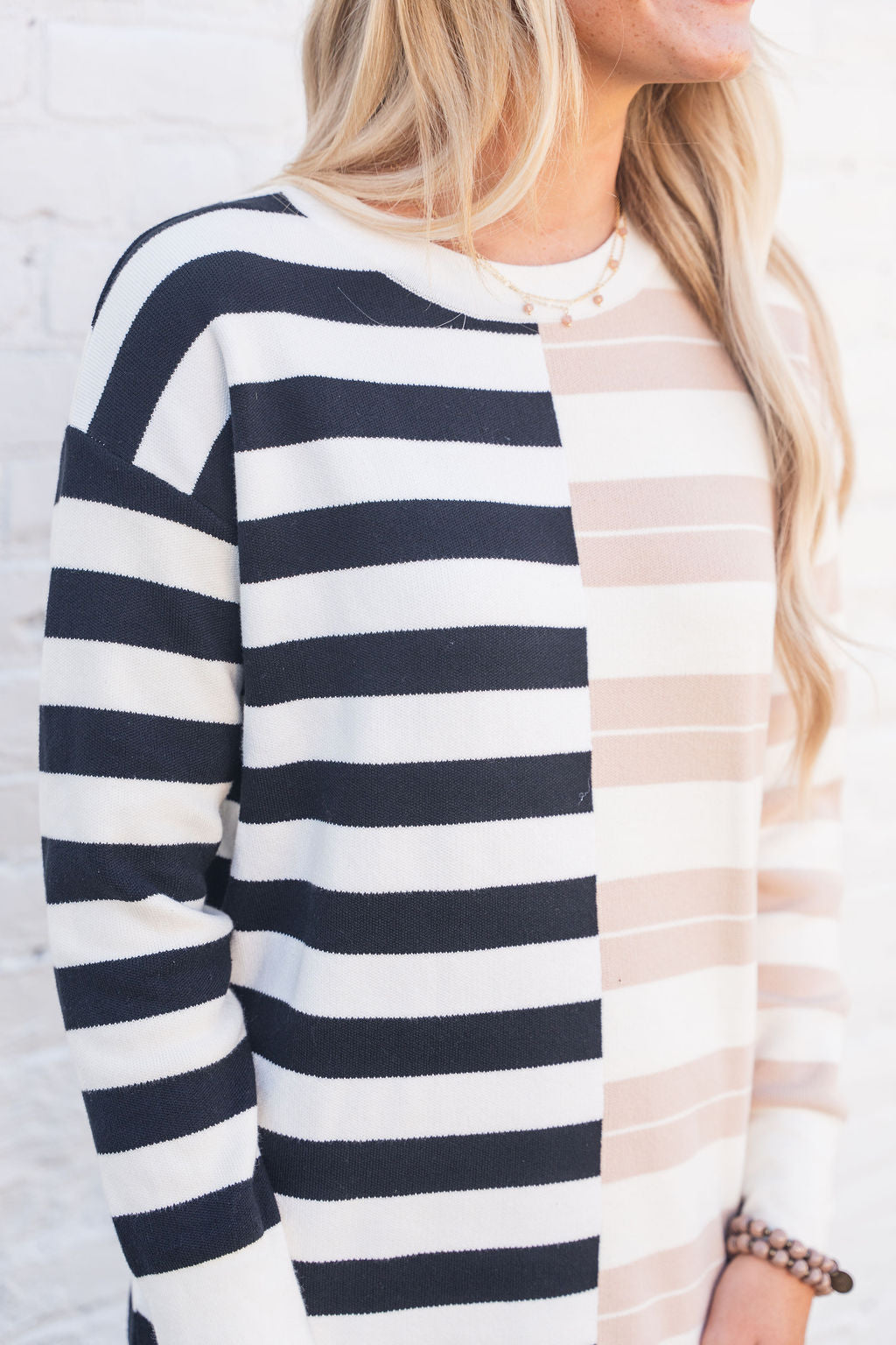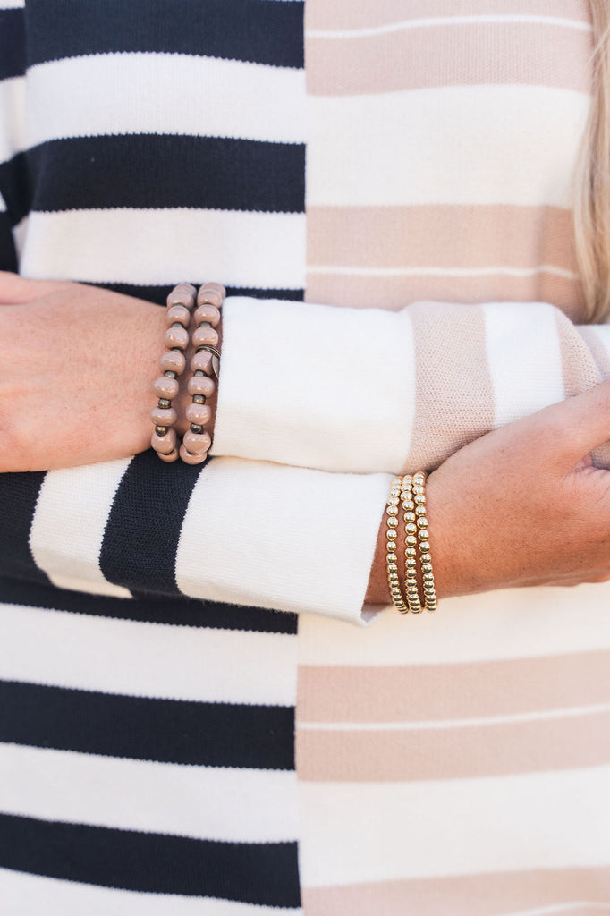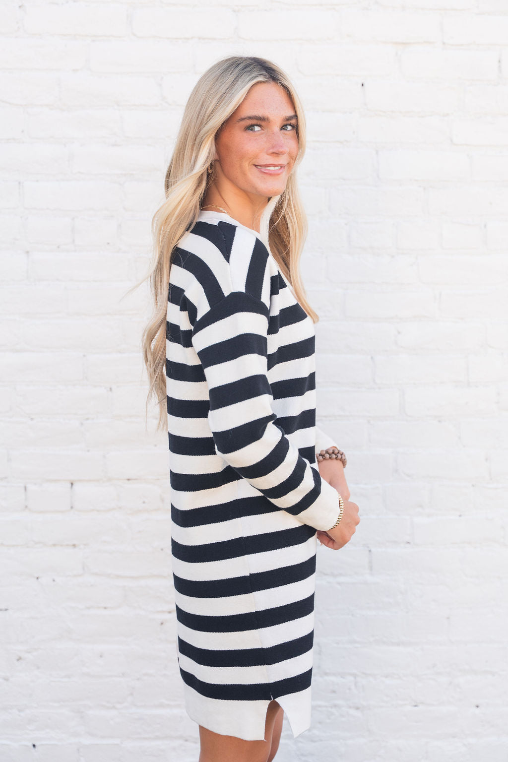 This stunning sweater dress is perfect for transitioning you through seasons! The split stripes give this such a chic and unique look! We suggest pairing this with a belt and boots or a long pendant necklace and flats! Chilly? Add a vest or jacket for extra warmth!