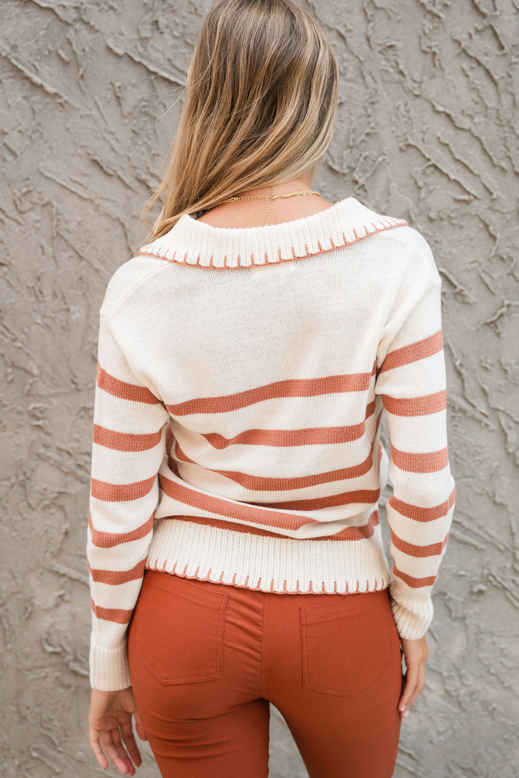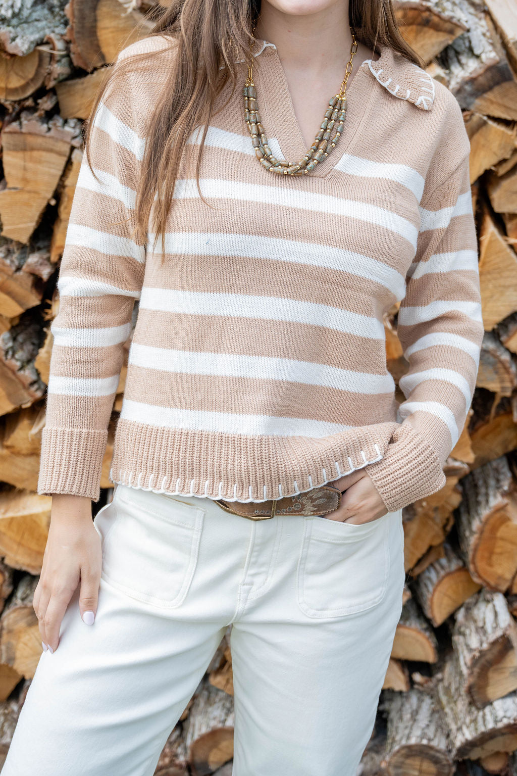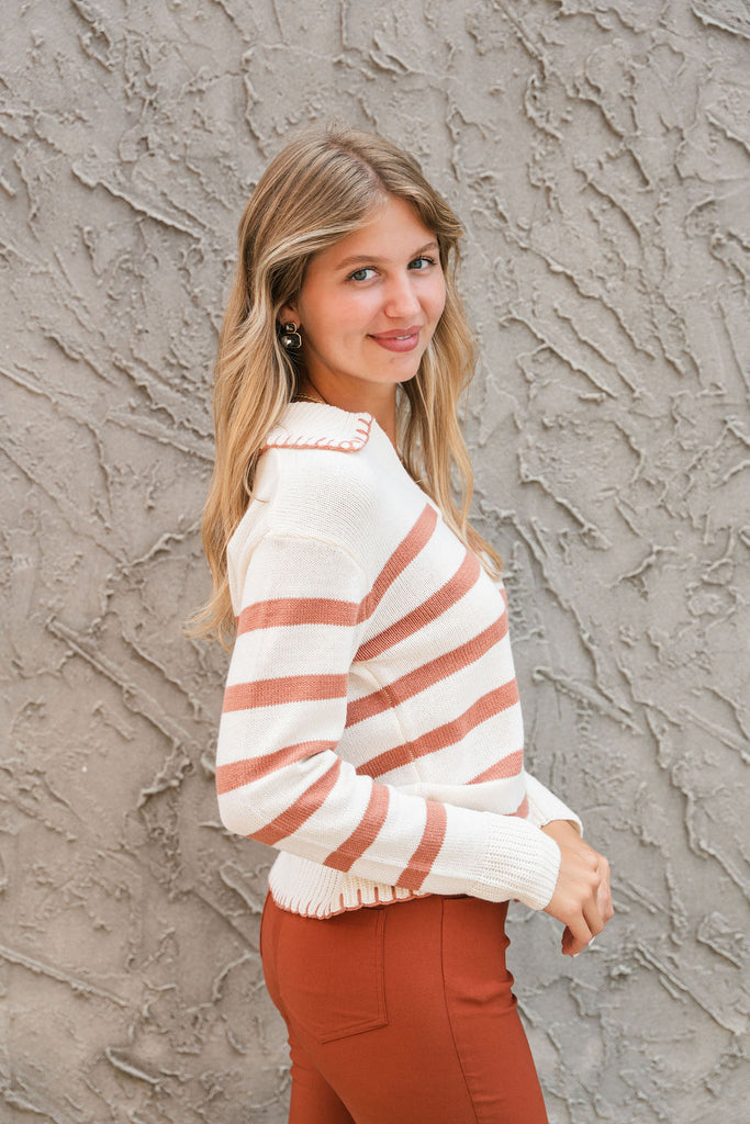 Sweater weather is upon us and we're in love with this one! The classic stripes, stitched trim, and the added collar are so simple yet so chic! Pair this sweater with jeans, accessorize and add your favorite pair of shoes for a quick, stylish look! Chilly? Add a vest or jacket with ease!!