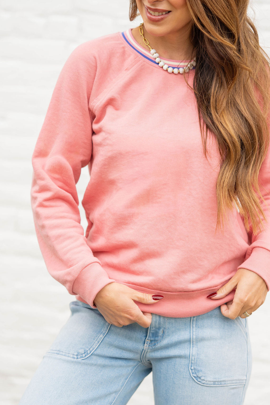 • Subtle contrast trim at the neck
