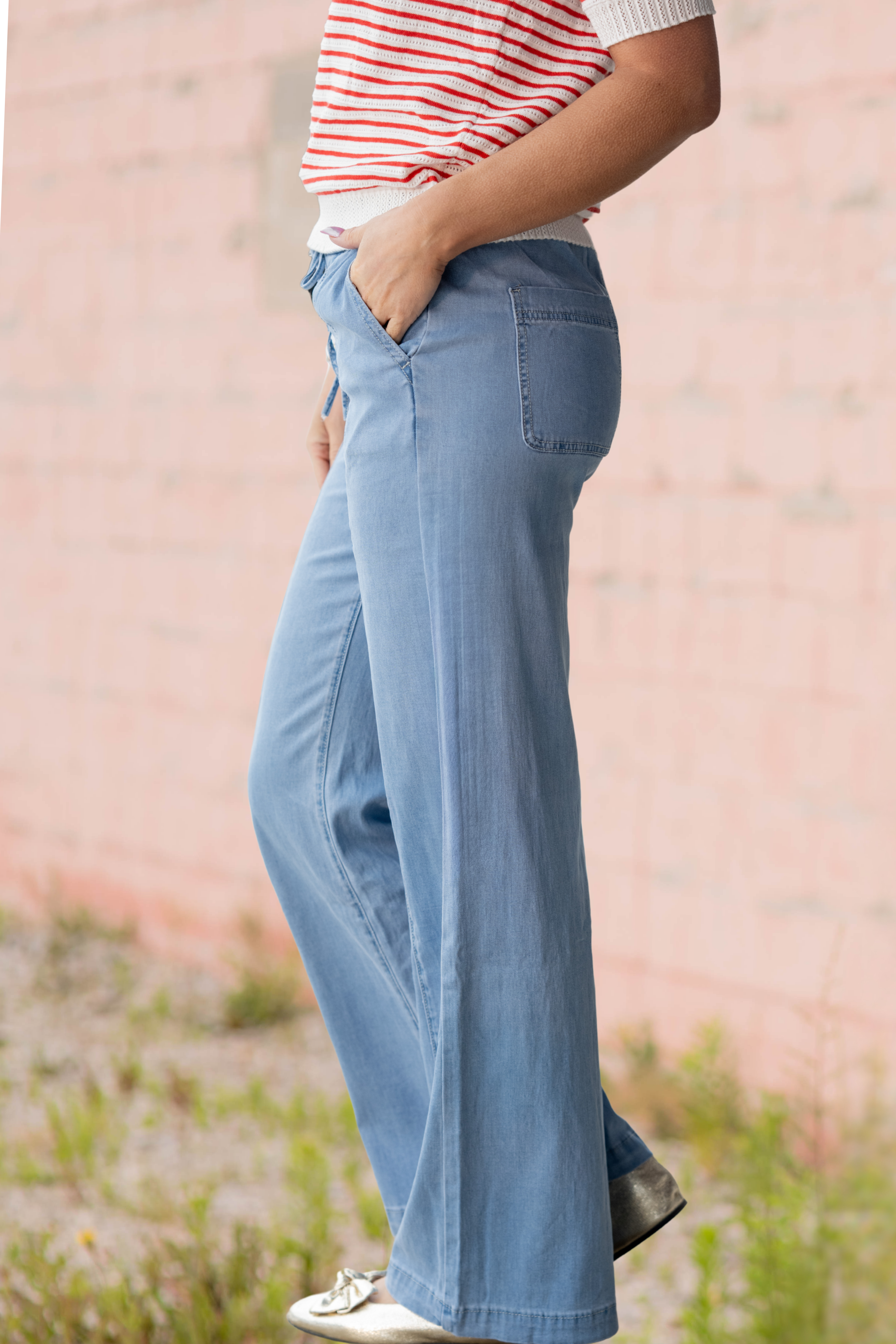 Where comfort meets effortless style. These lightweight denim pants feature a relaxed wide leg silhouette with a soft, flowy drape that moves beautifully with you. The elastic waistband with adjustable drawstring gives you that easy, pull-on comfort while still keeping a polished look.