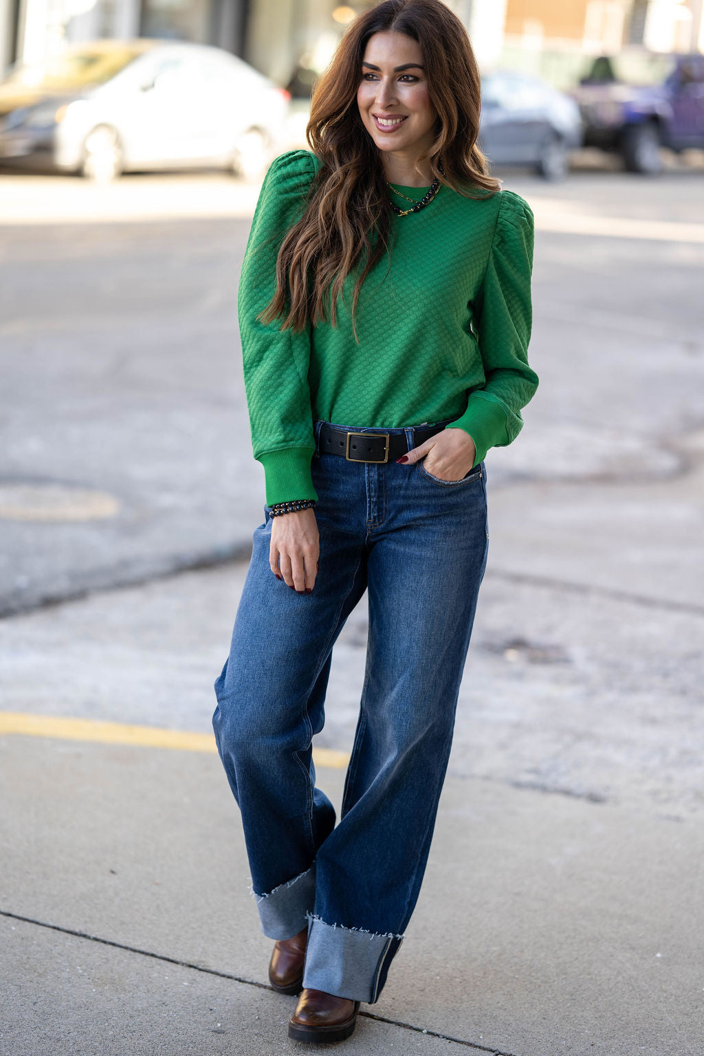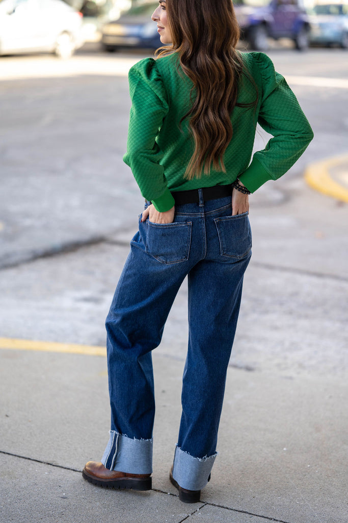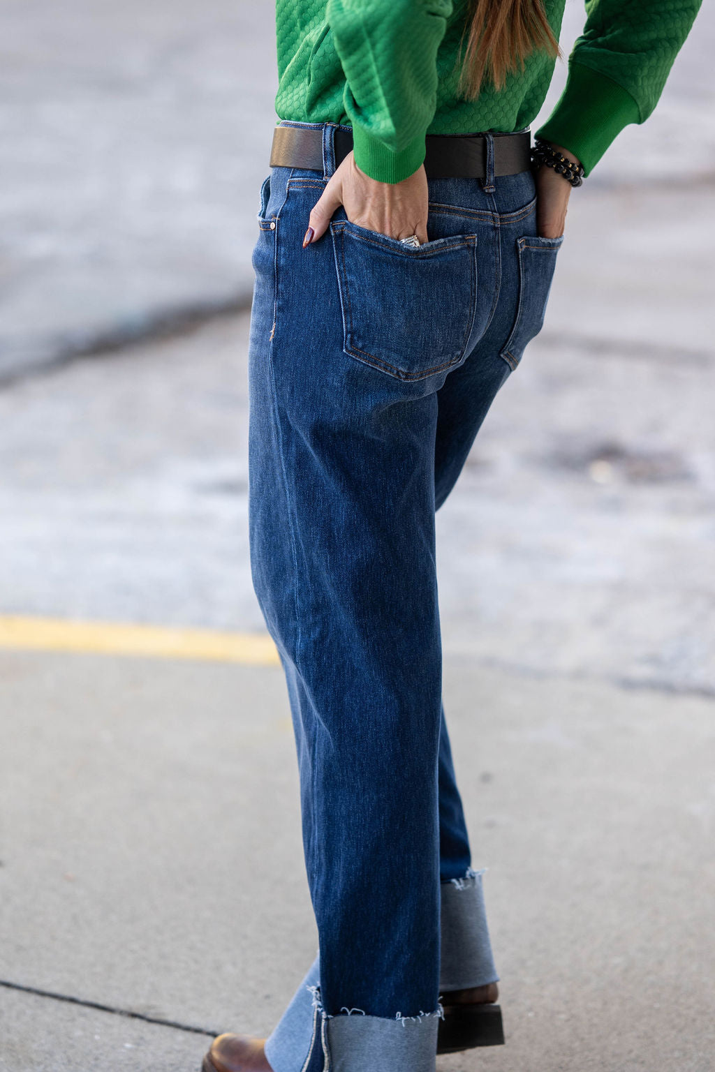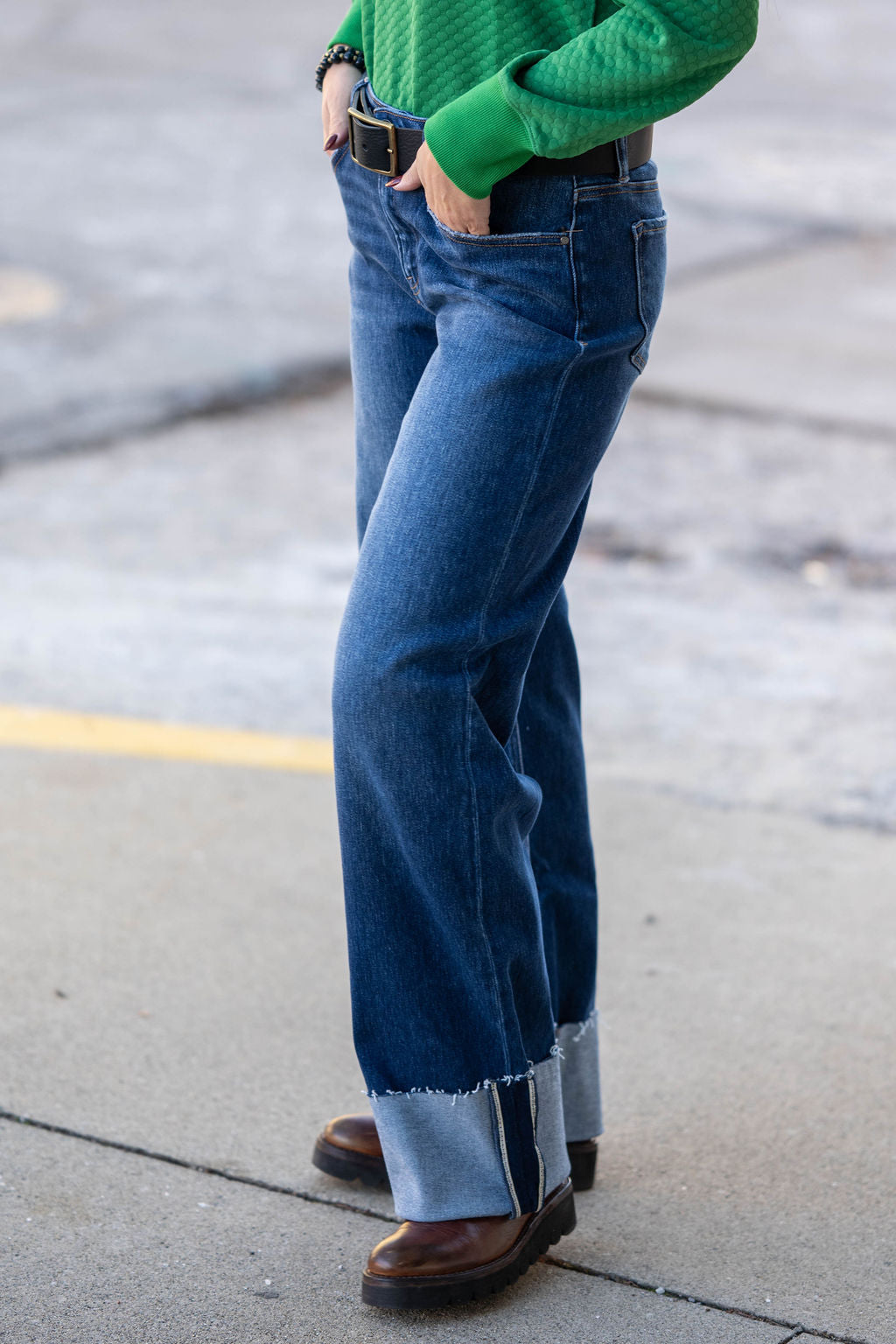 Make a statement with denim that stands out. These Contrast Cuff Wide Leg Jeans feature a rich deep wash and an eye-catching two-tone cuff that instantly elevates your outfit.