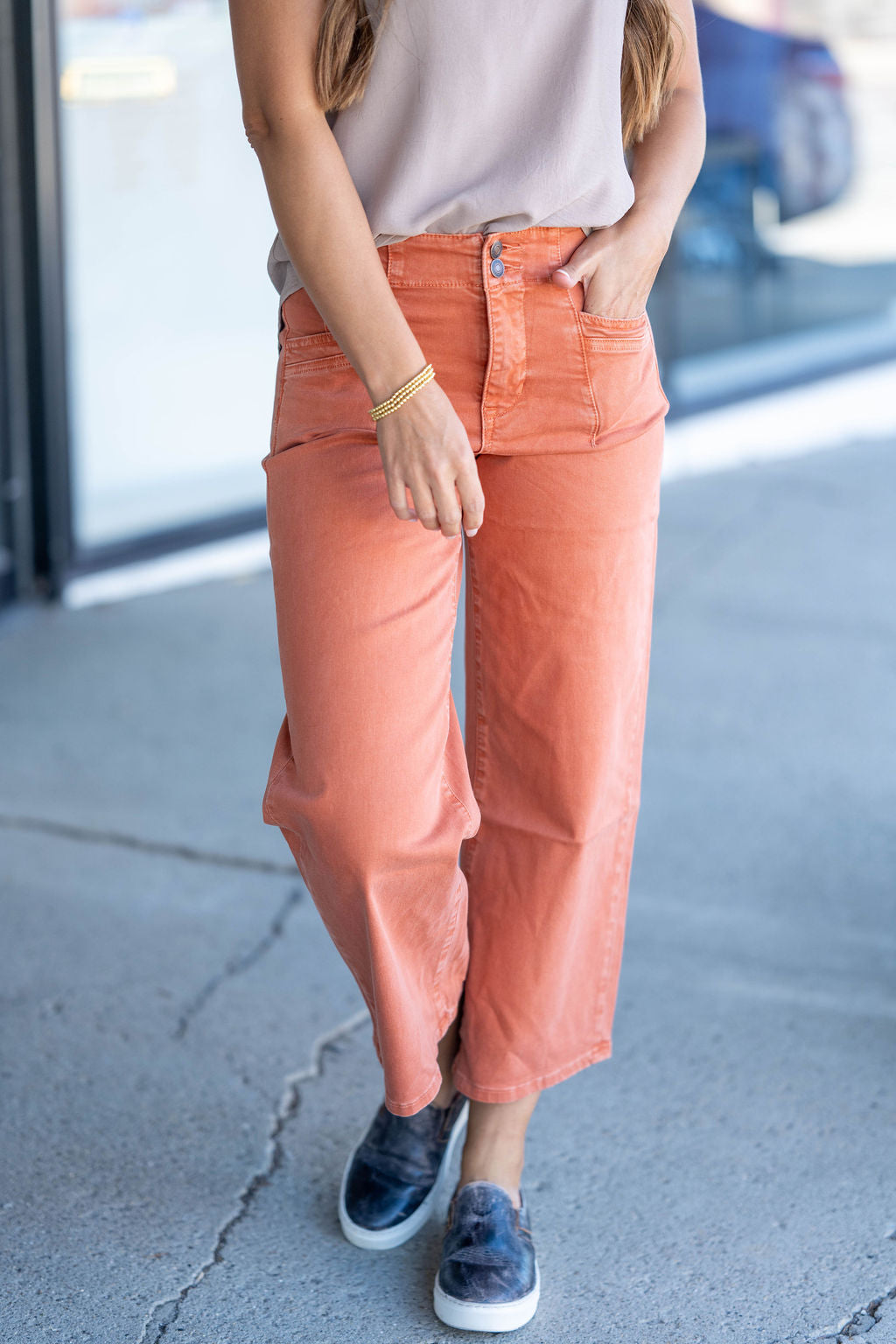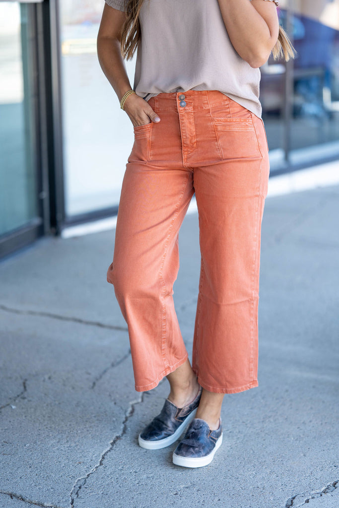 These super high-rise wide leg jeans feature an ankle crop and a double button detailing to set them apart from the rest! The color provides the perfect pop to elevate even the simplest of looks!