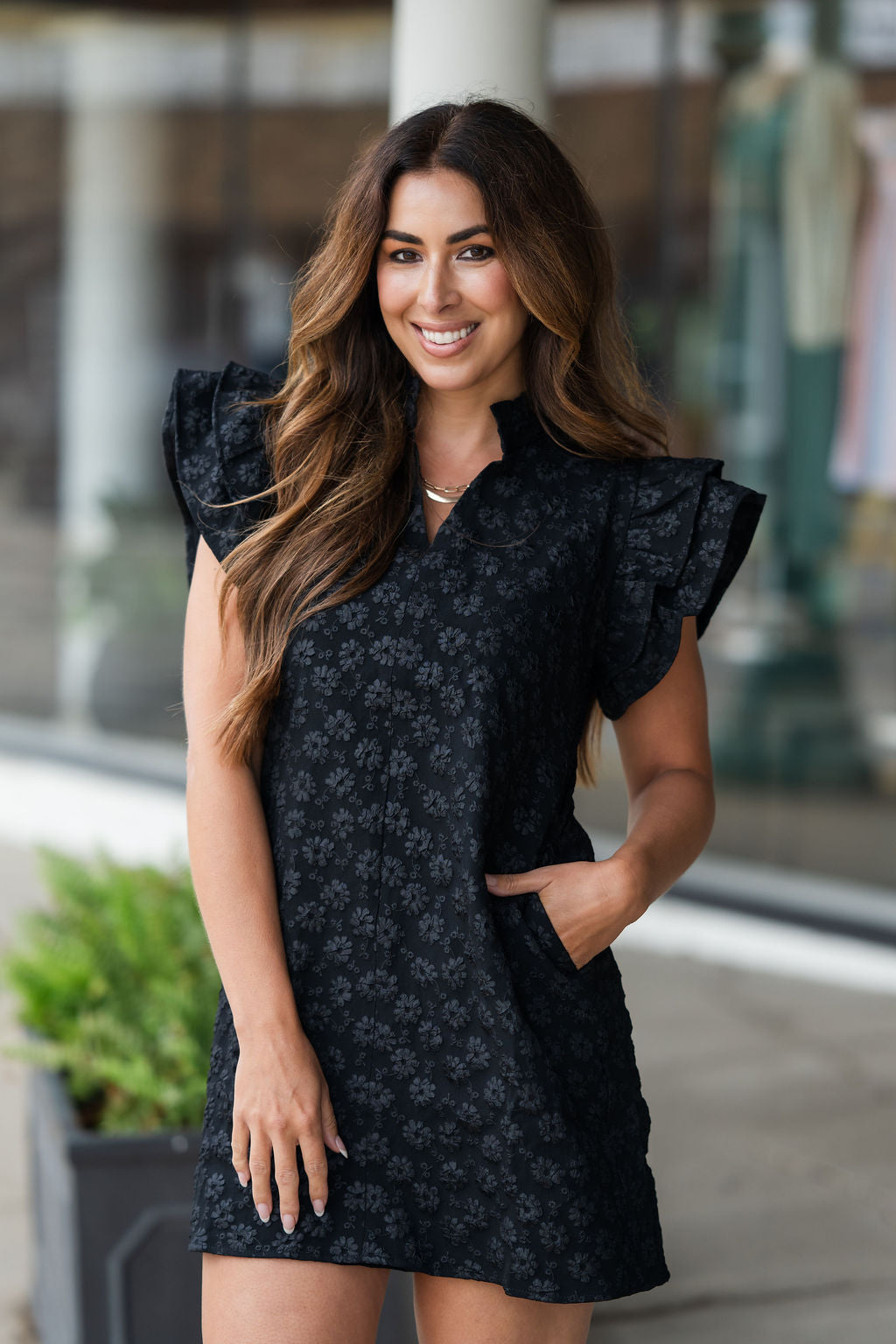 Just in time for Spring! This dress screams sunshine! The embroidered floral print really pops against the pastel background and the double flutter trim gives it even more of a feminine and flirty look! Pair with sandals or flats for the warm days or add a cardigan, blazer, or jacket to transition you from the cooler ones! Complete the look with your favorite accessories.