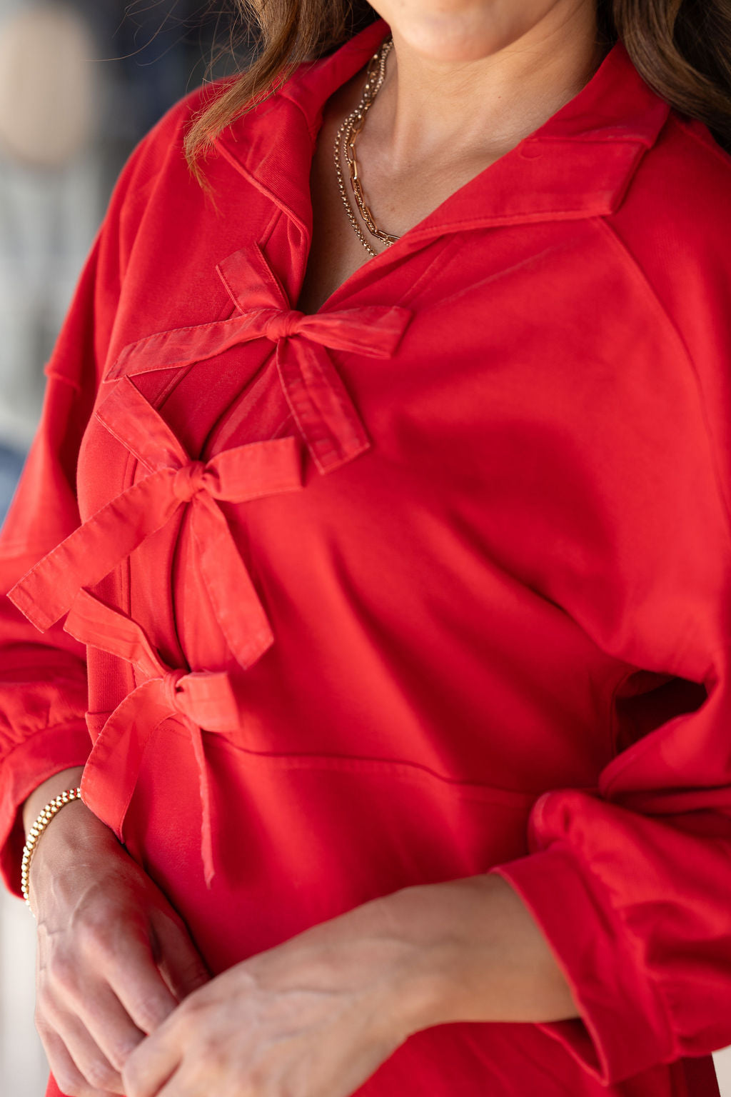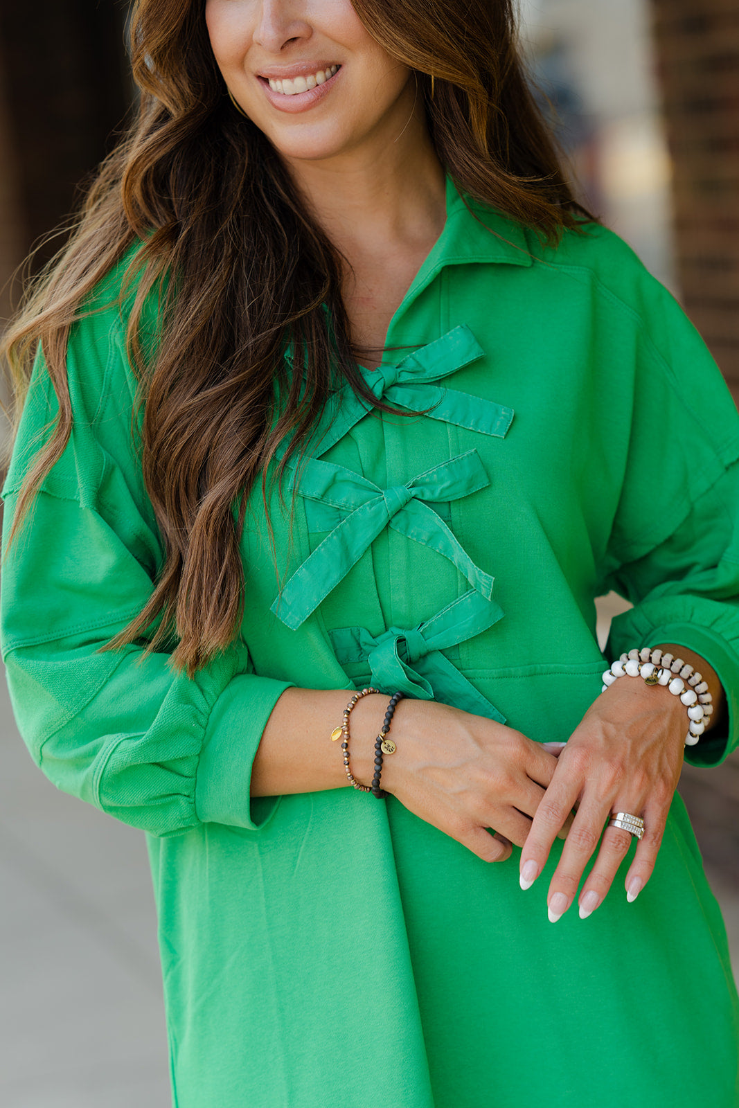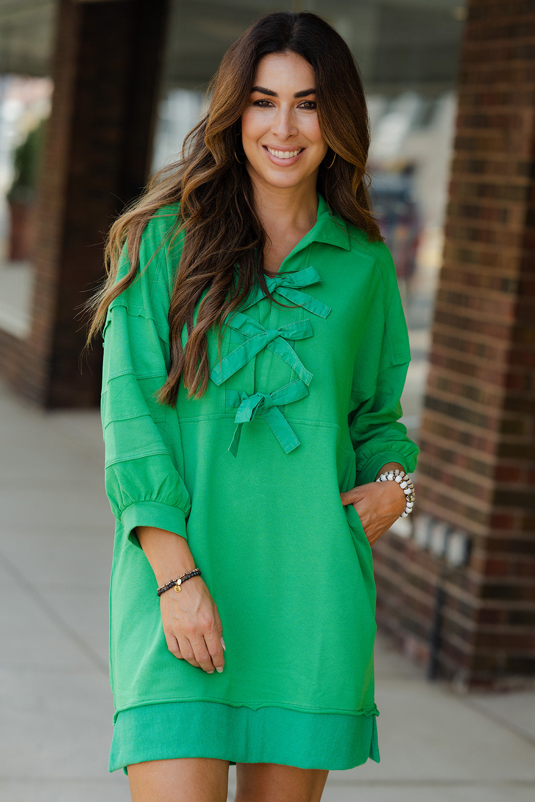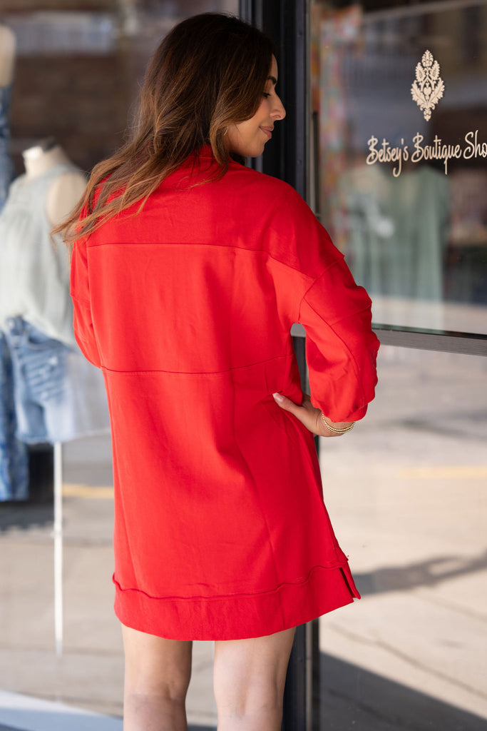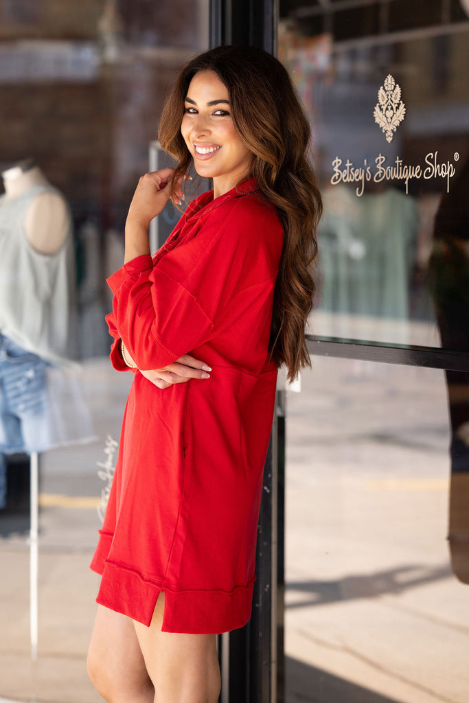 A fun and unique dress that is sure to have you turning heads! The raw edge detailing and bow accents give this a more elevated look! This will definitely be a go-to for all of your events or occasions!