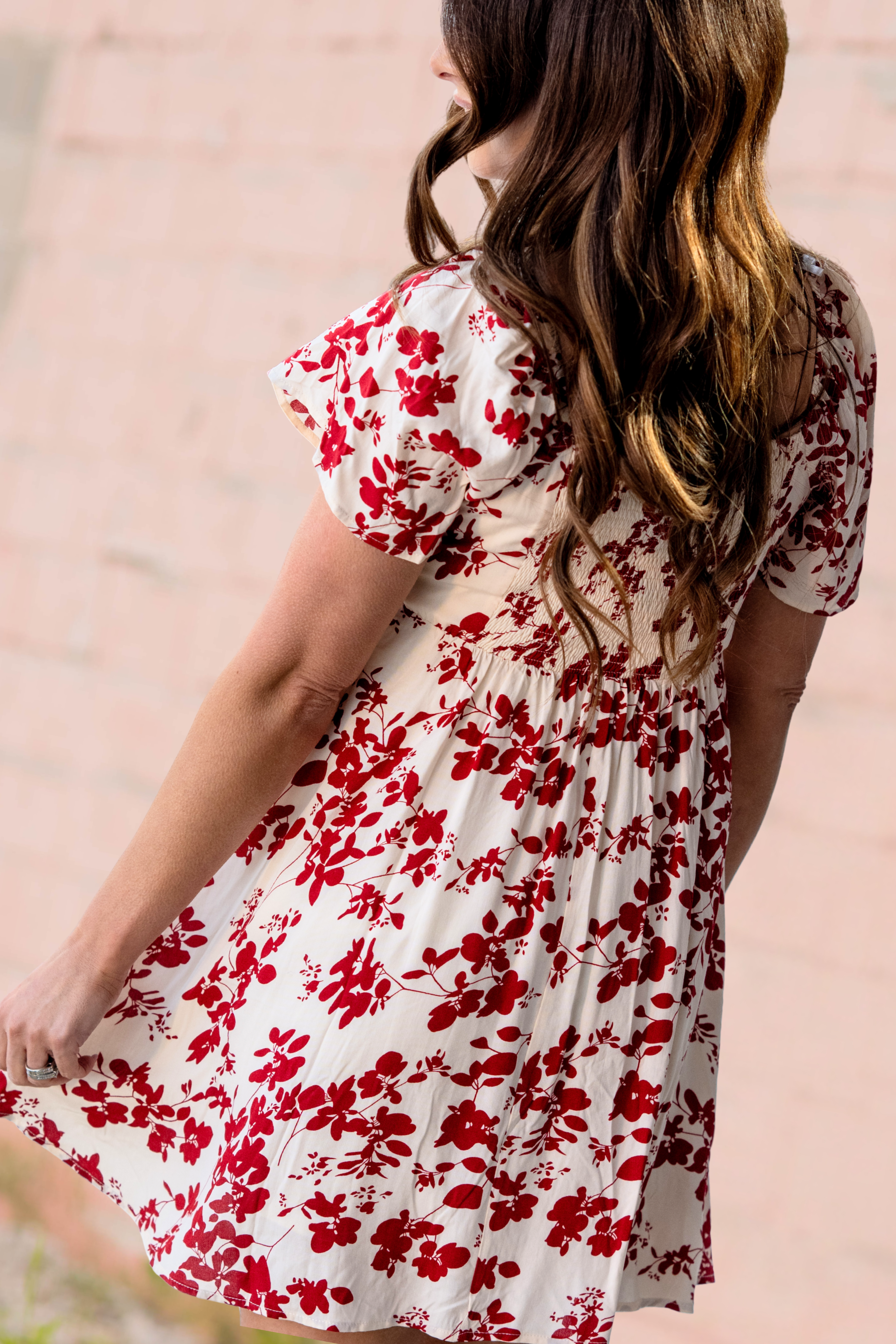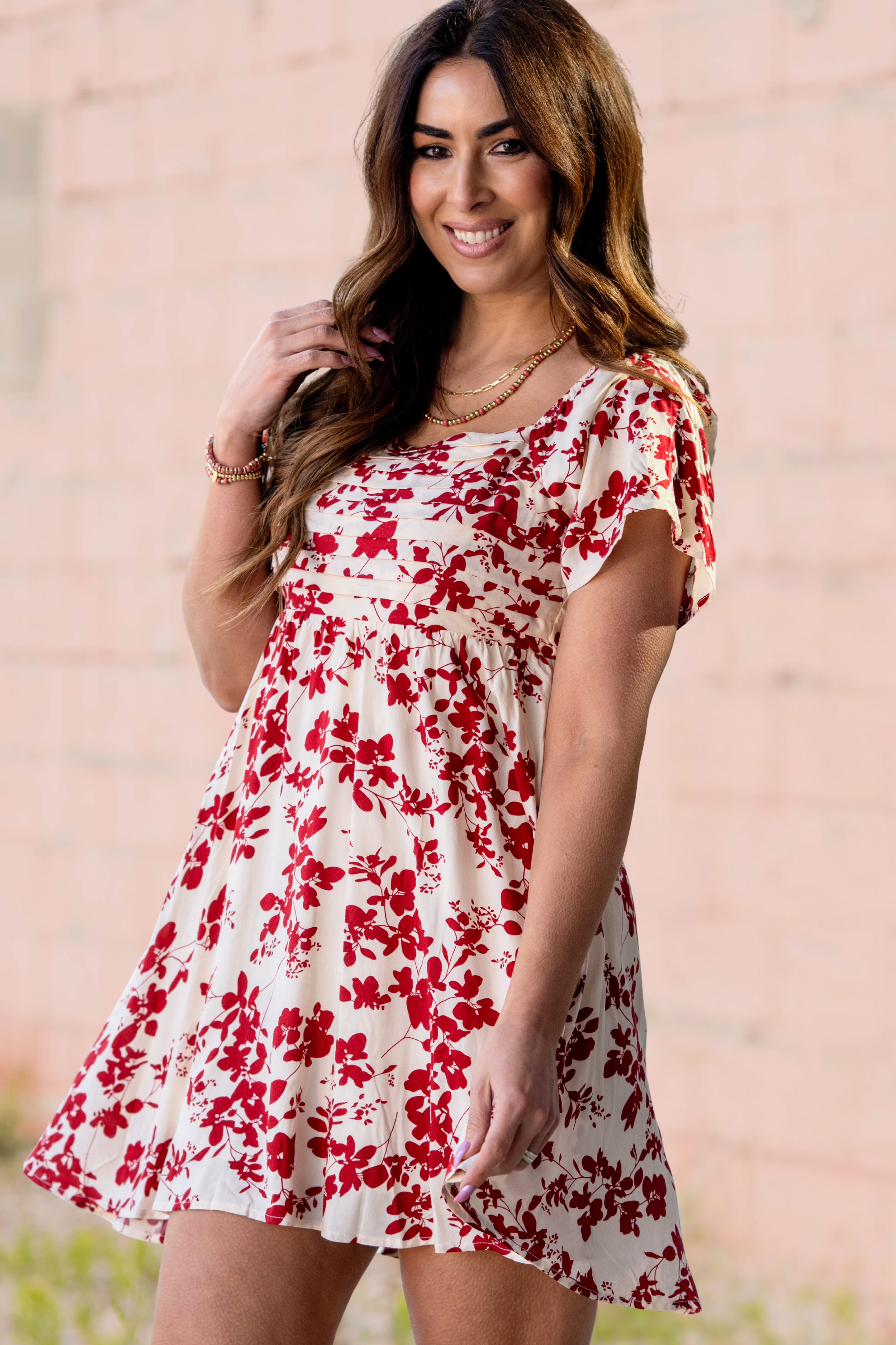 Sweet, flirty, and effortlessly feminine — this floral babydoll dress is a standout. Designed with a soft ivory backdrop and bold red floral print, it features delicate pleated detailing across the bodice that adds subtle texture and charm.