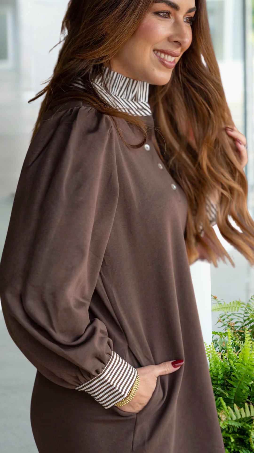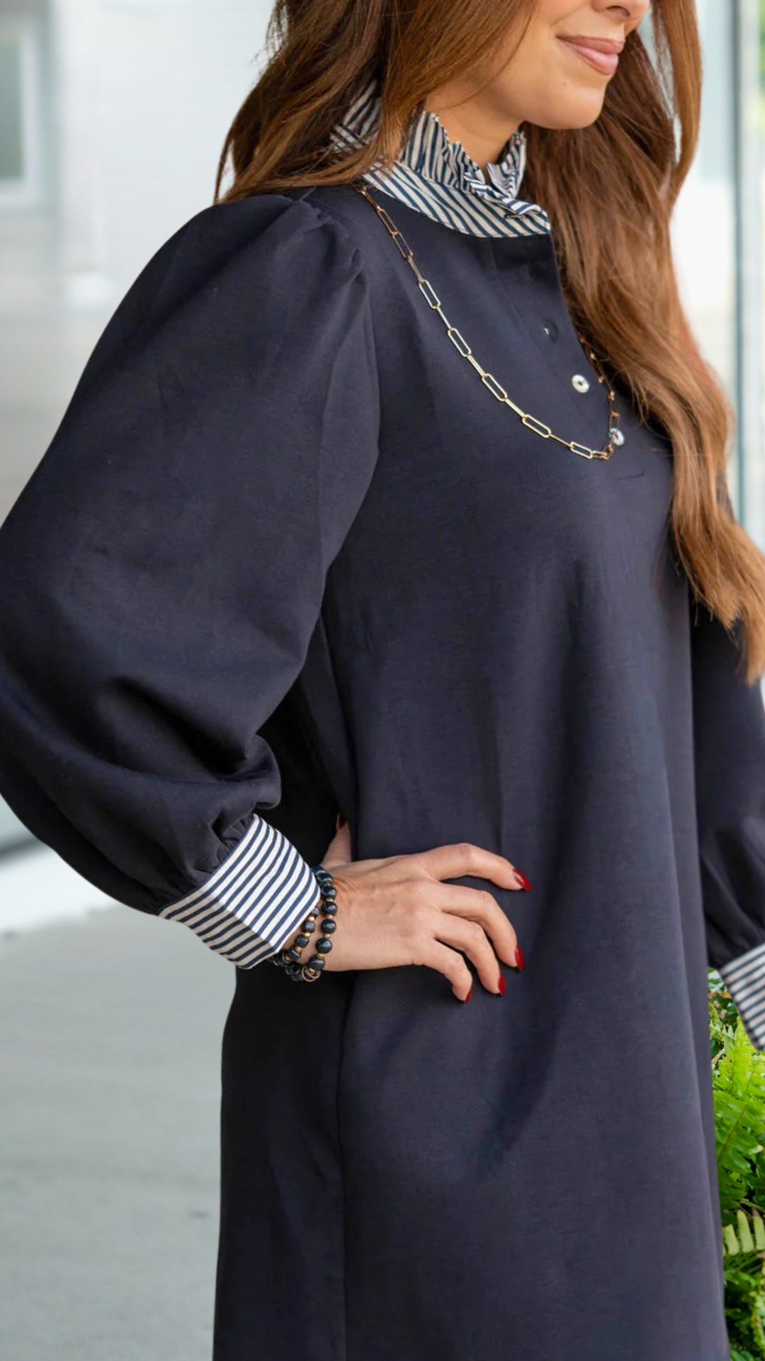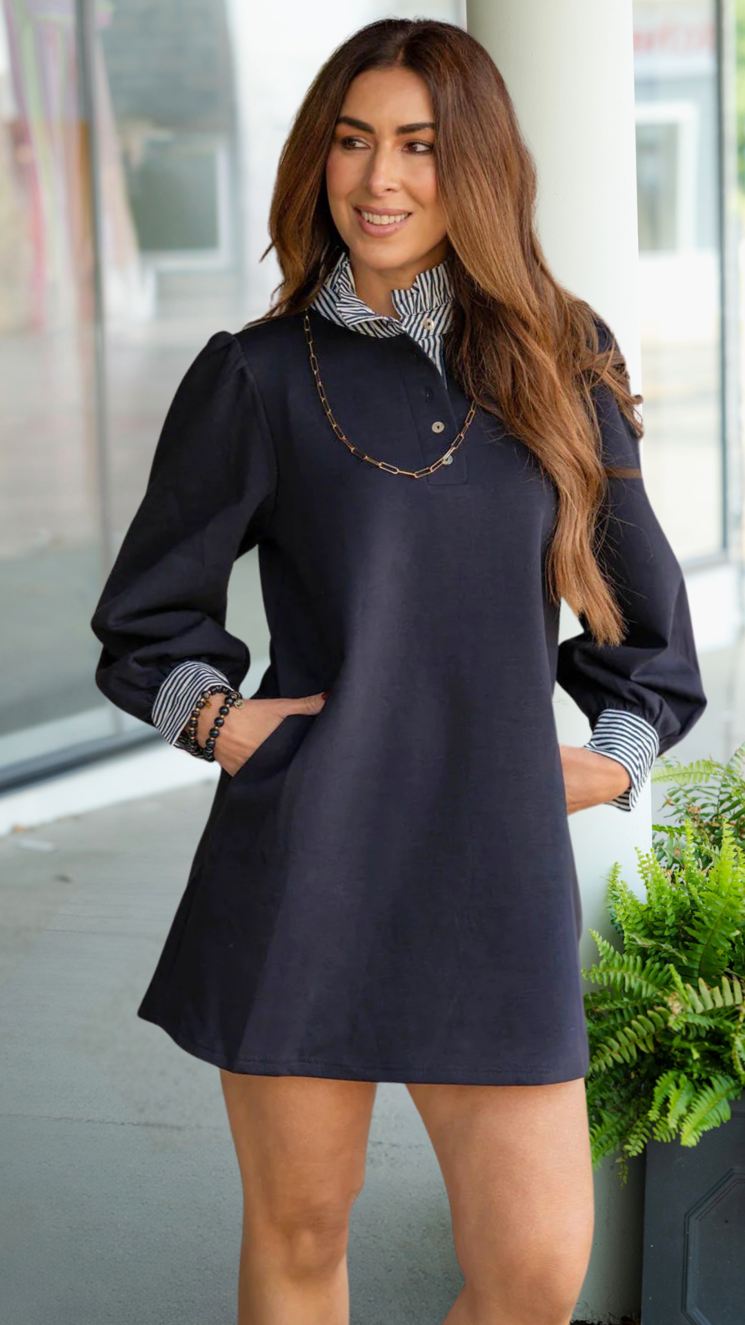 Effortless and polished, this collared dress brings classic prep style to modern everyday wear. The contrast striped collar and cuffs give it that elevated, layered look without the extra bulk.