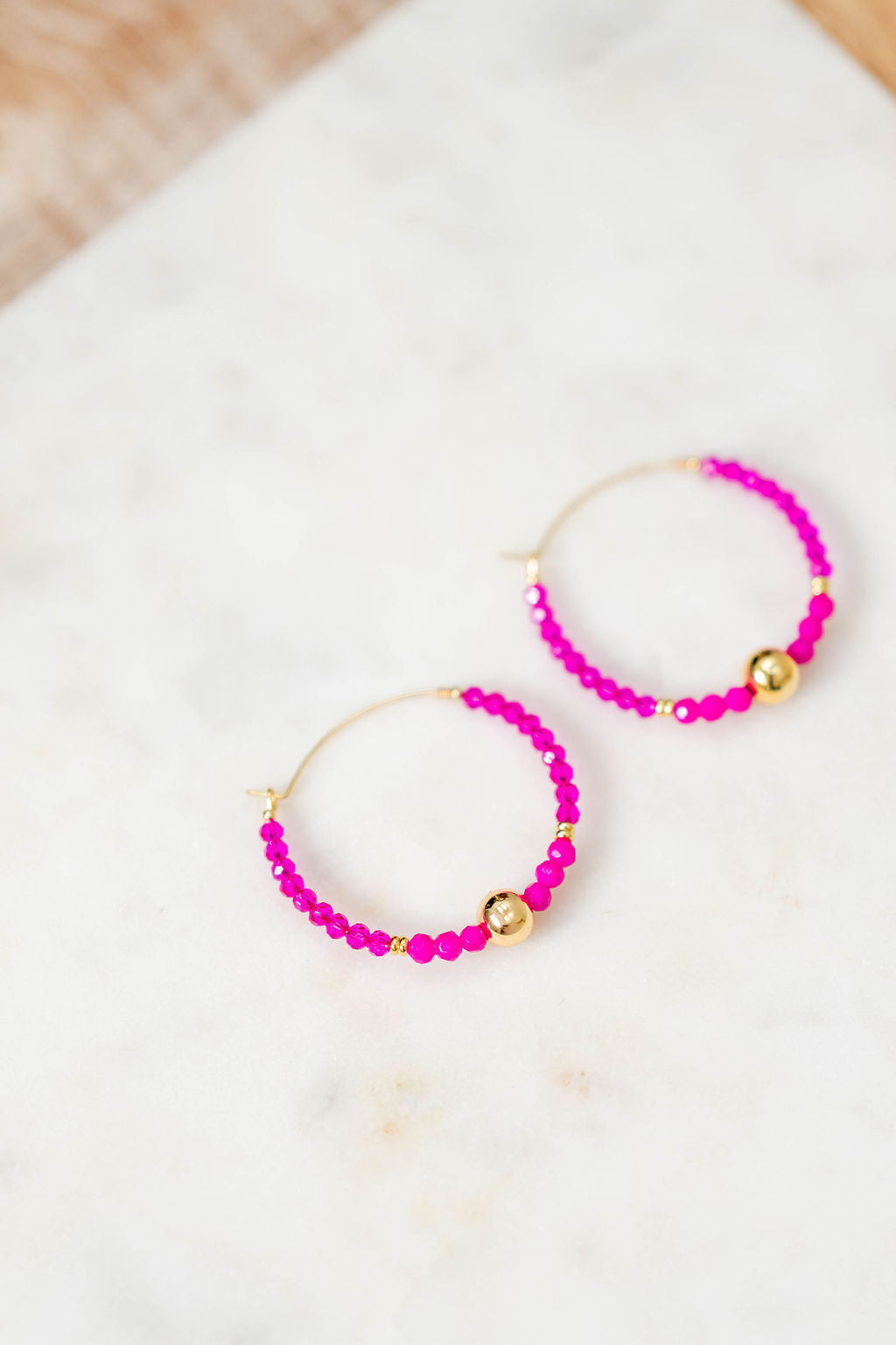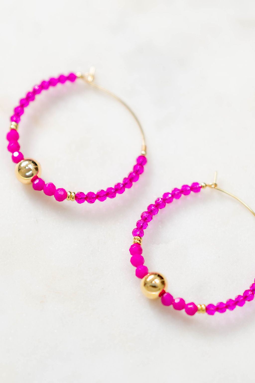 Bright fuchsia beads meet sleek gold accents in a hoop that’s equal parts playful and chic. Whether you’re headed to brunch with the girls or dancing all night, these earrings bring the main character energy.