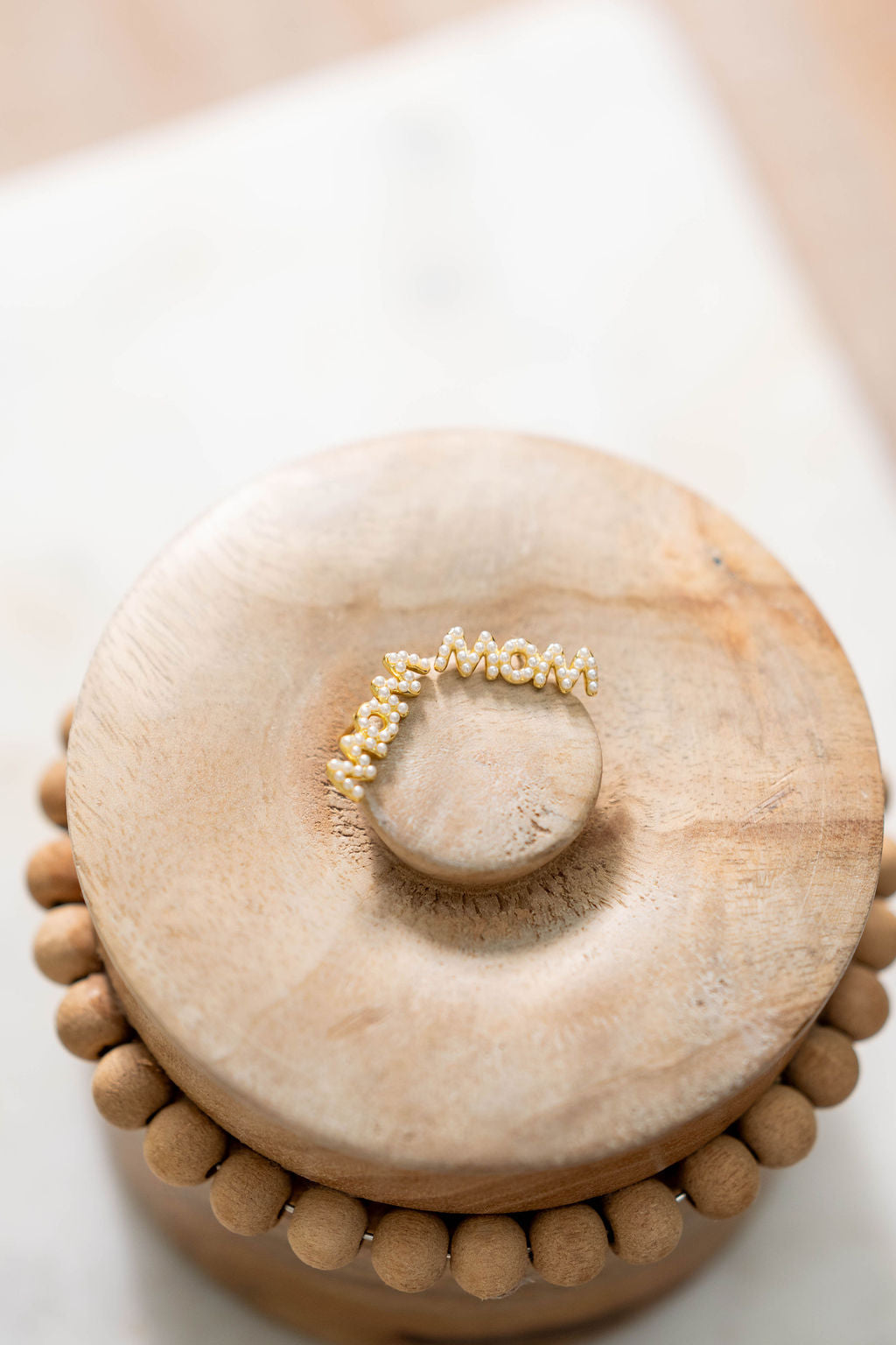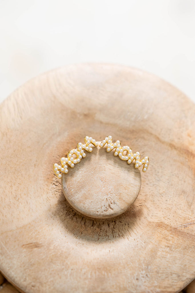 Sentimental and stylish. This gold-toned ring spells out “MOM” in petite pearl beading, making it the ultimate keepsake for everyday wear or a thoughtful gift. Its playful yet elegant design captures love, gratitude, and timeless style in one little piece that speaks volumes.