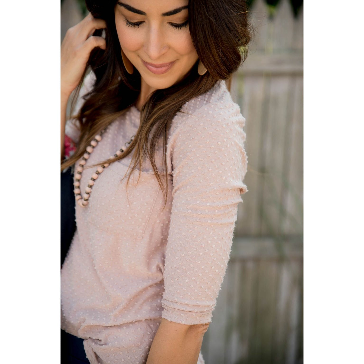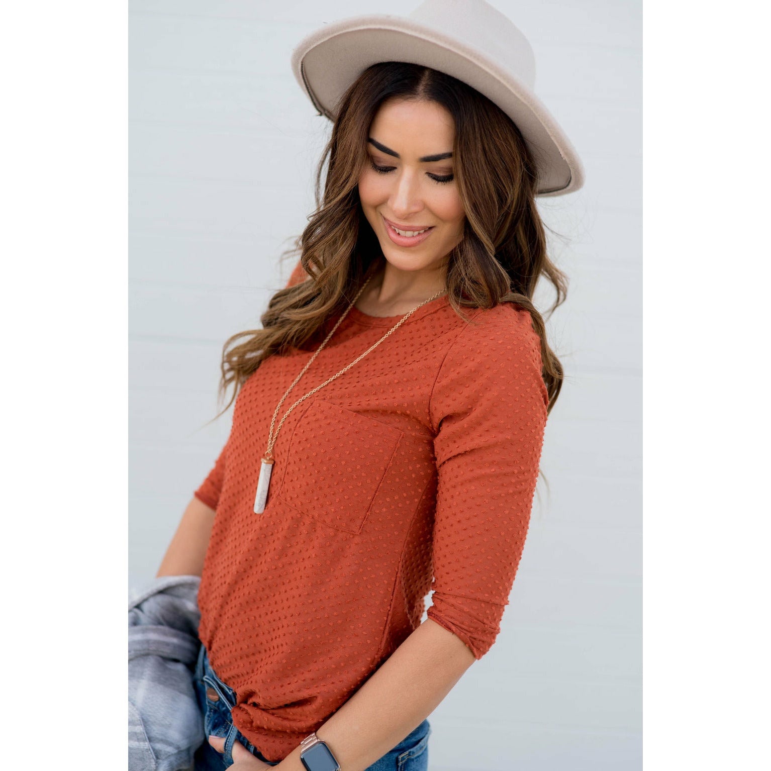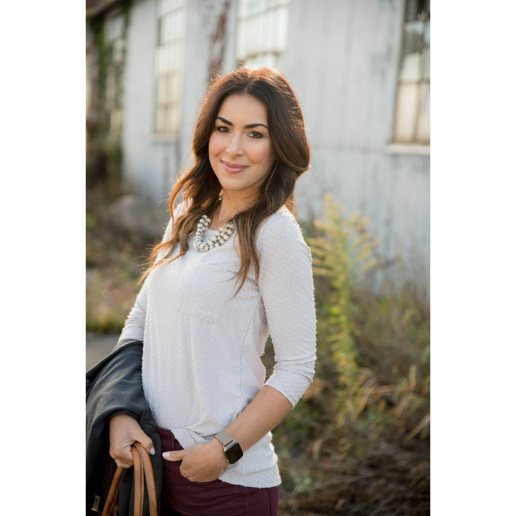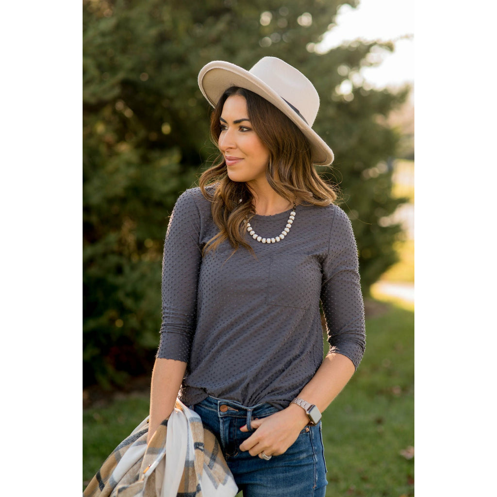 Add this 3/4 Sleeve Textured Pocket Tee to your collection! This textured tee is incredibly soft. Pair with jeggings and a cardigan for that perfect look! This is a tee you will want in every available color!