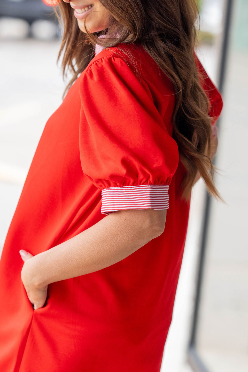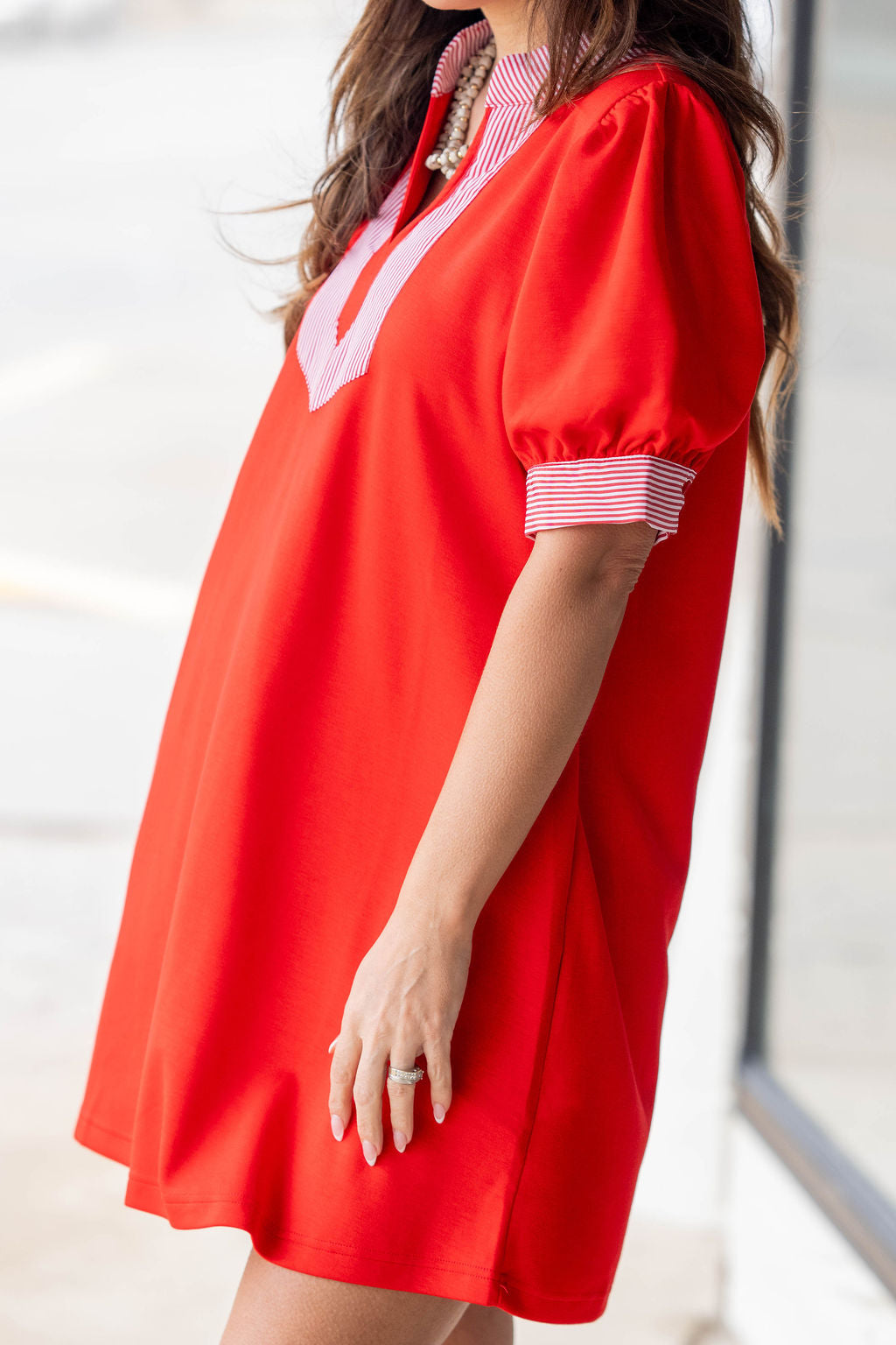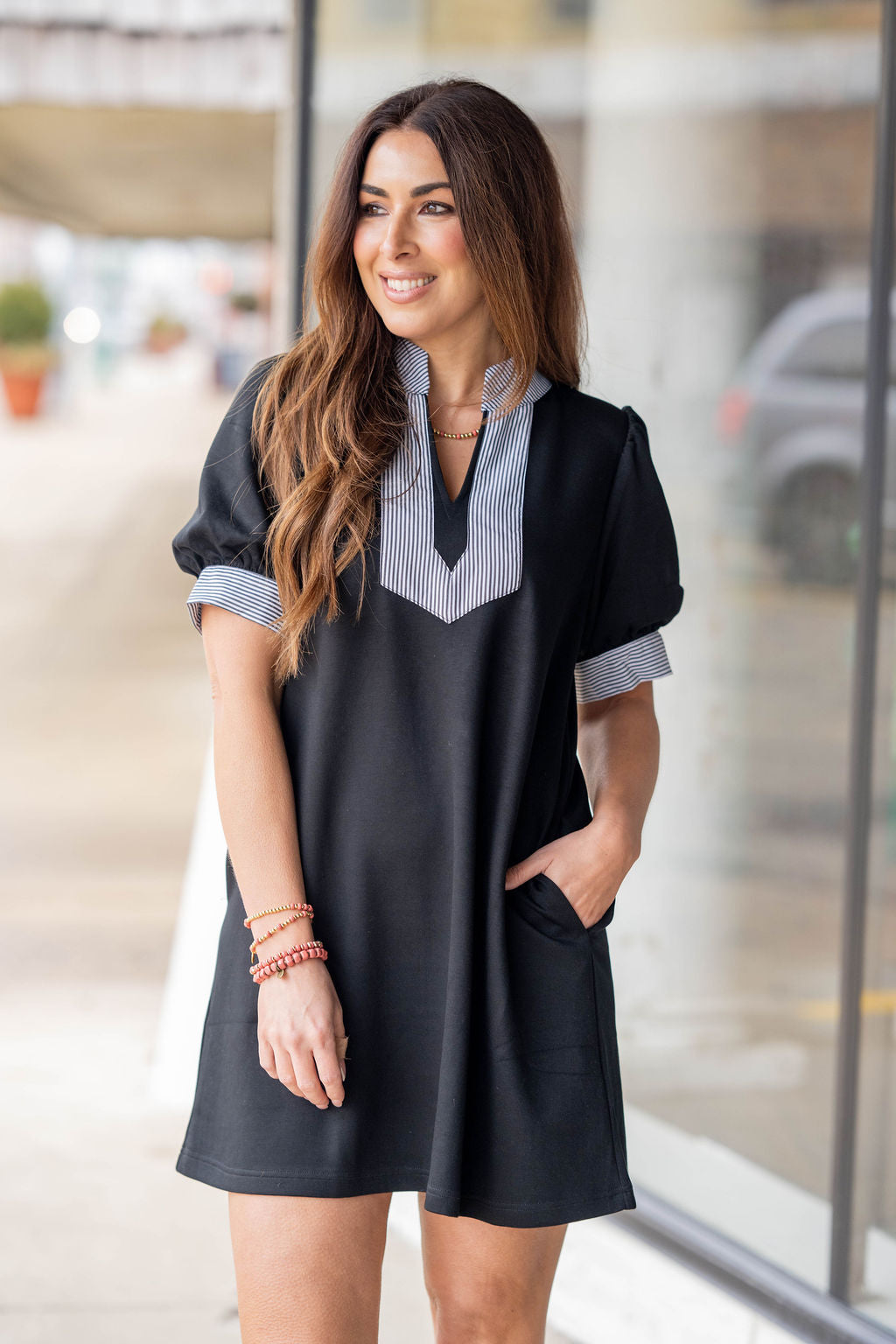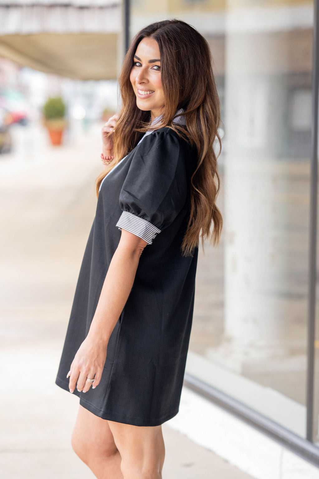A fresh, feel-good dress designed for days when you want style without the effort. This easy shift silhouette pairs perfectly with a contrasting striped neckline and cuff detail—adding just the right amount of personality while keeping it polished.