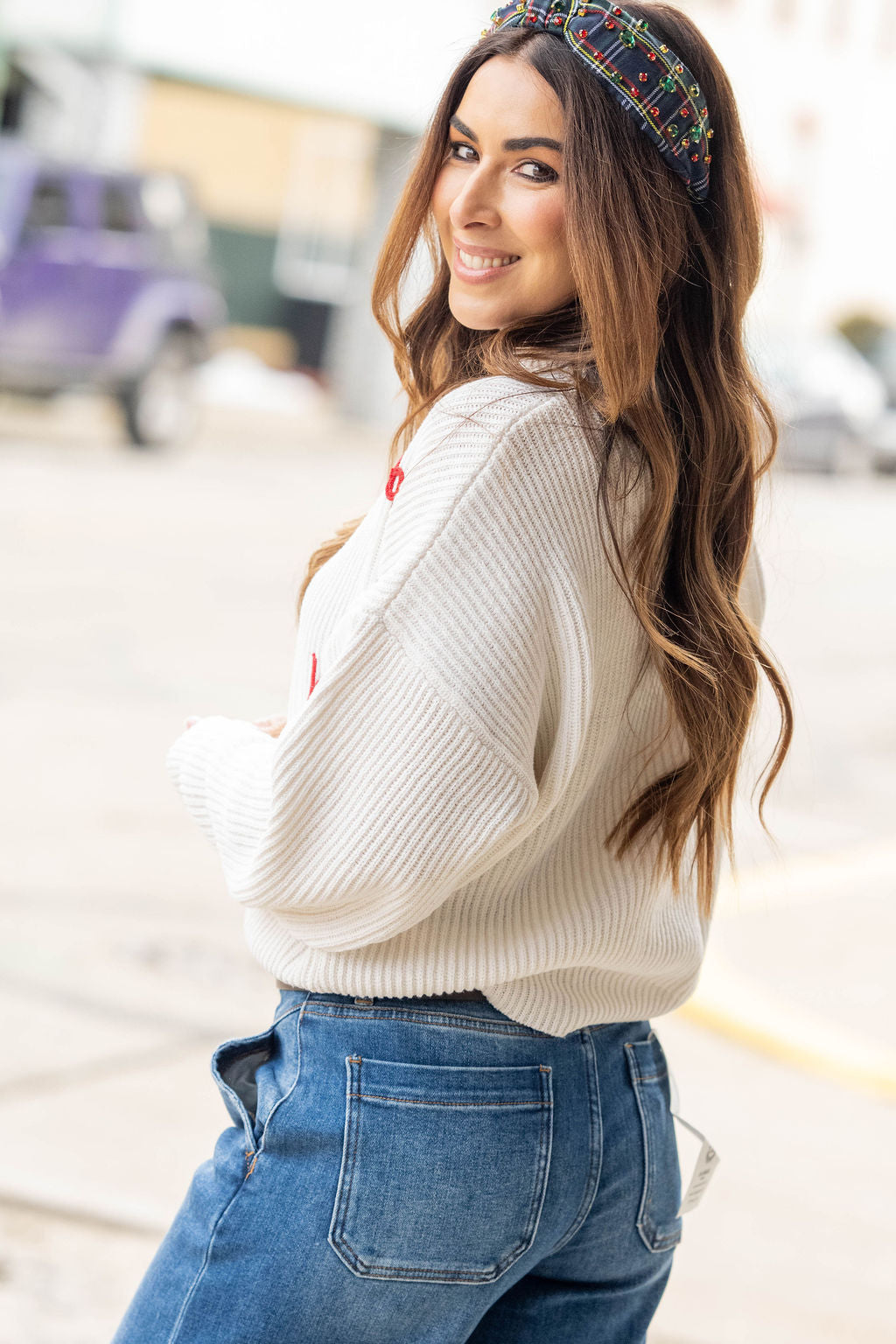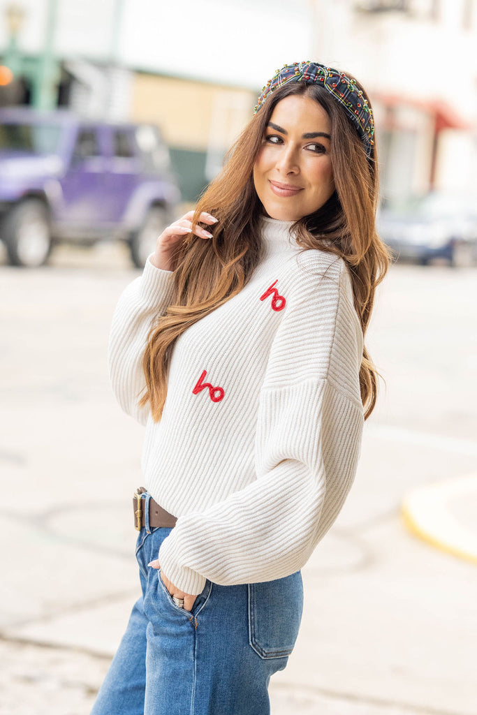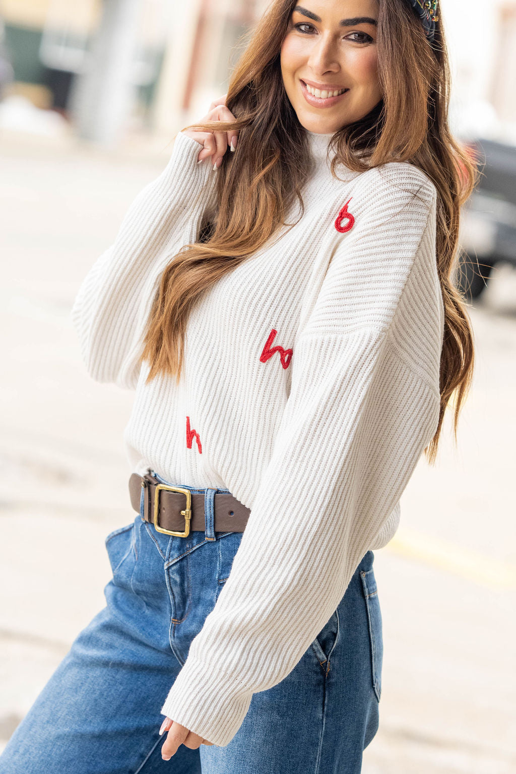 Spread joy all season long in this cozy knit sweater embroidered with playful “ho ho” details. Its relaxed fit and soft texture make it the perfect festive favorite for all your merry moments.