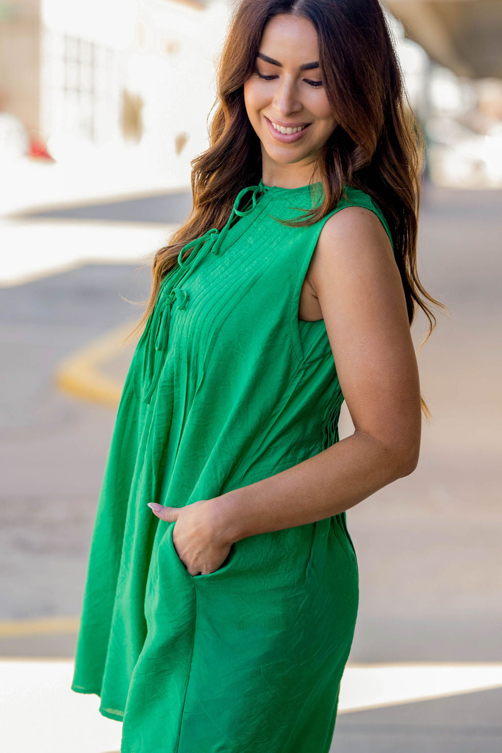 Bright, breezy, and effortlessly flattering—this dress is the kind of piece you’ll reach for all season long. Designed with soft pleated detailing and delicate tie accents at the neckline, this flowy silhouette creates a relaxed yet polished look that’s perfect for warm days ahead.