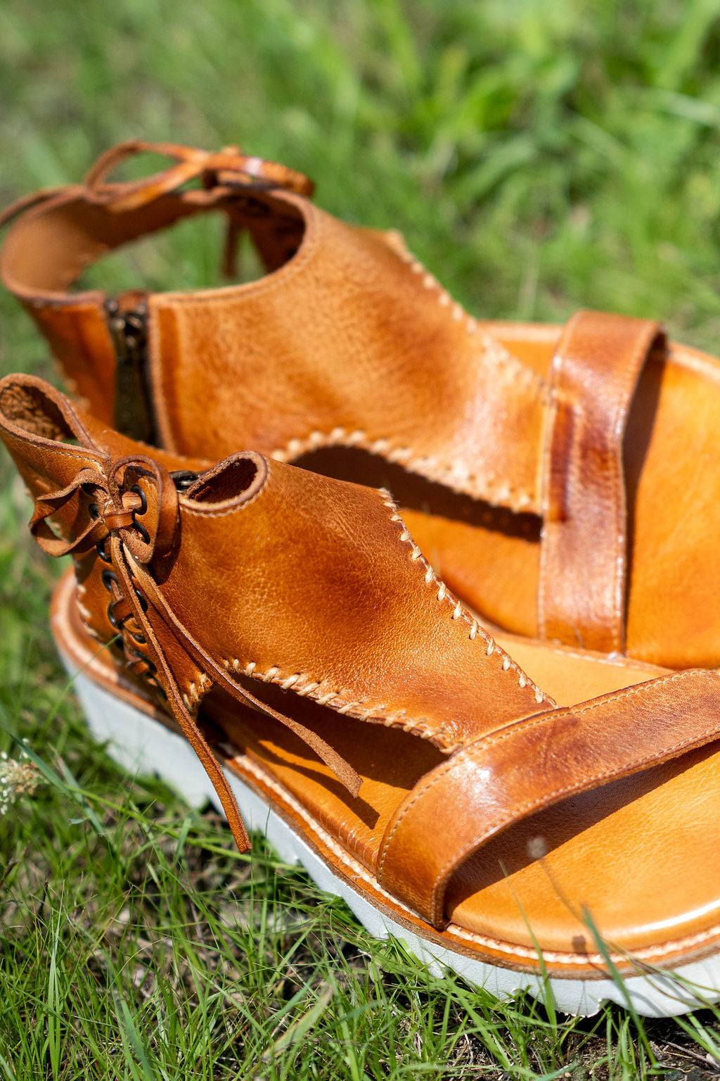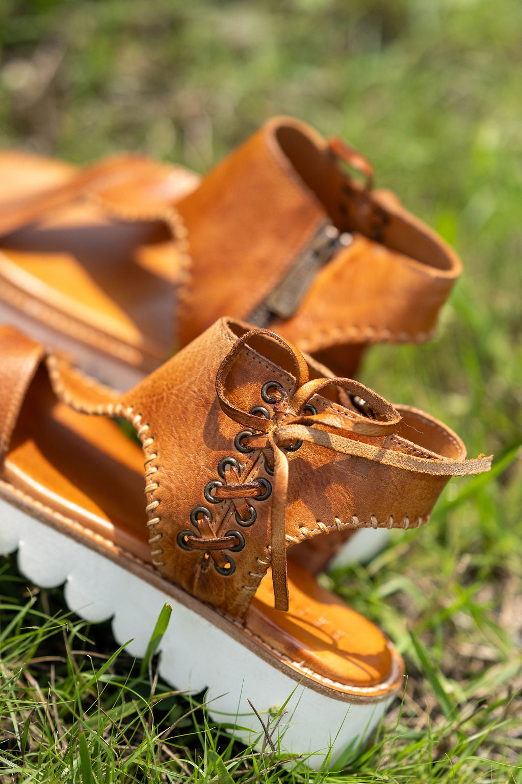 - Blunt open toe, decorative tie-up side, whipstitch details
