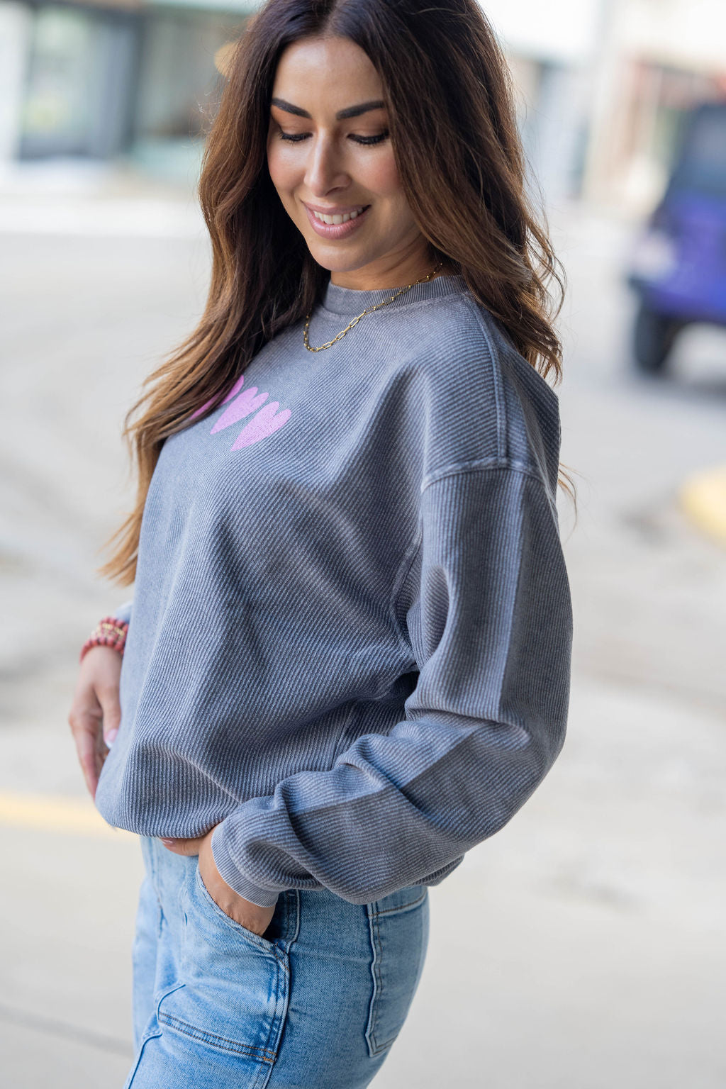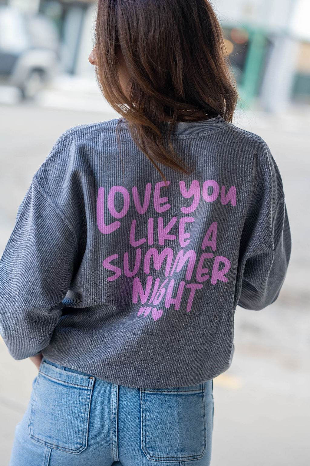 Cozy, cute, and made for all your everyday moments—this lightweight waffle-knit pullover features a trio of sweet pink hearts across the front and a bold hand-drawn message on the back that reads “Love You Like a Summer Night.”