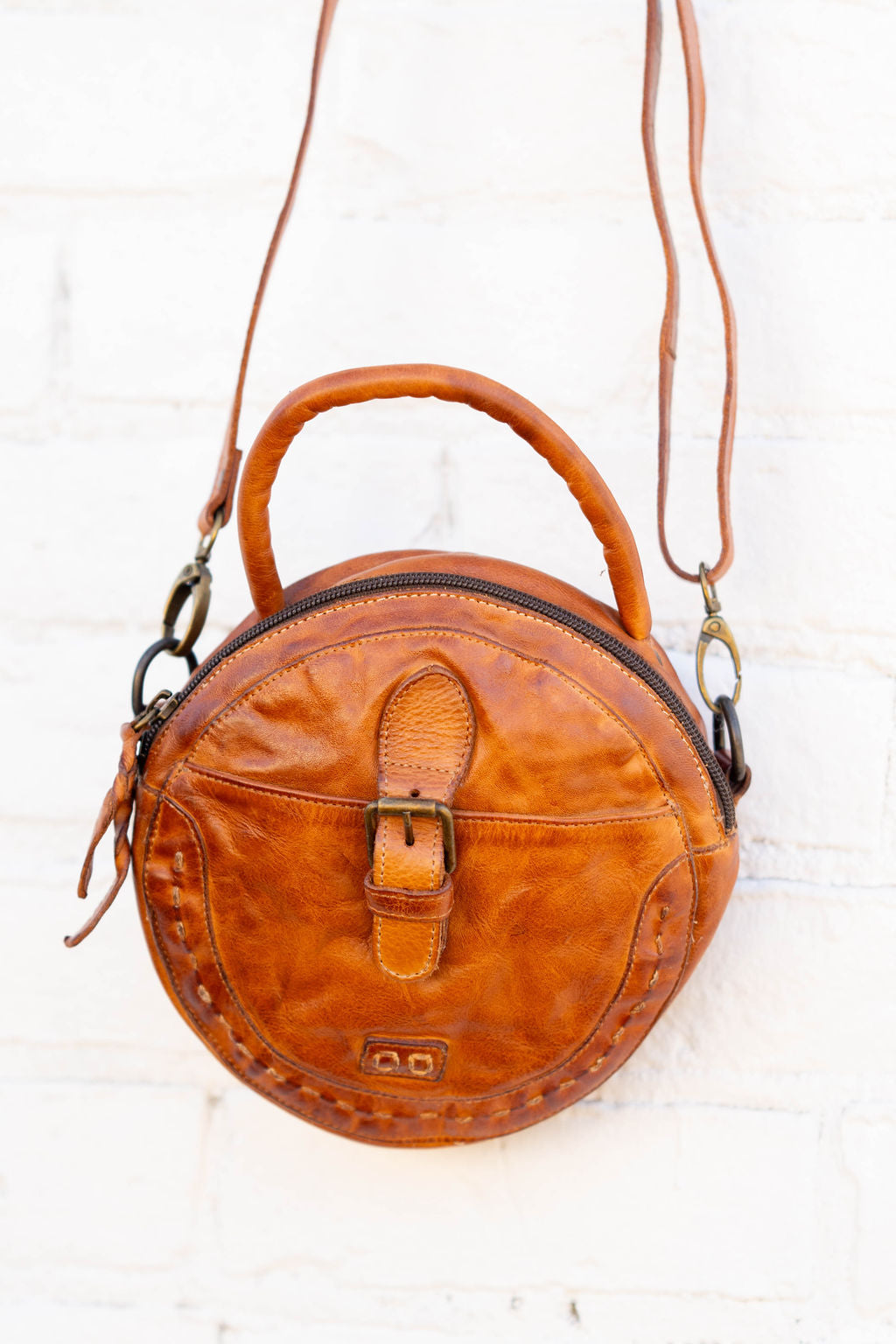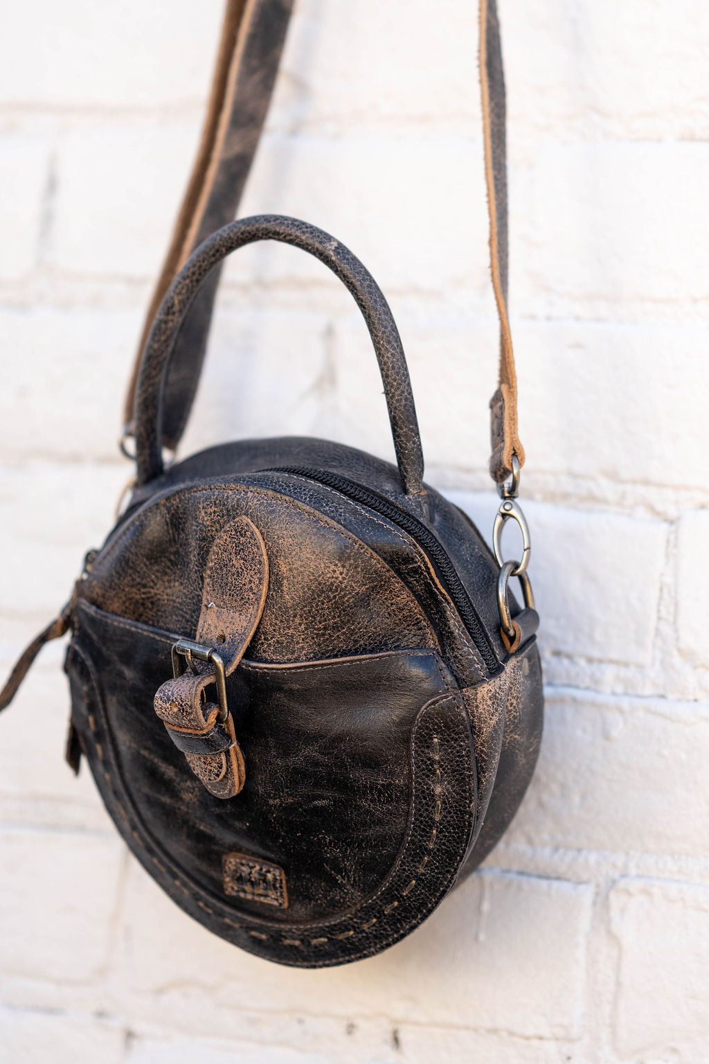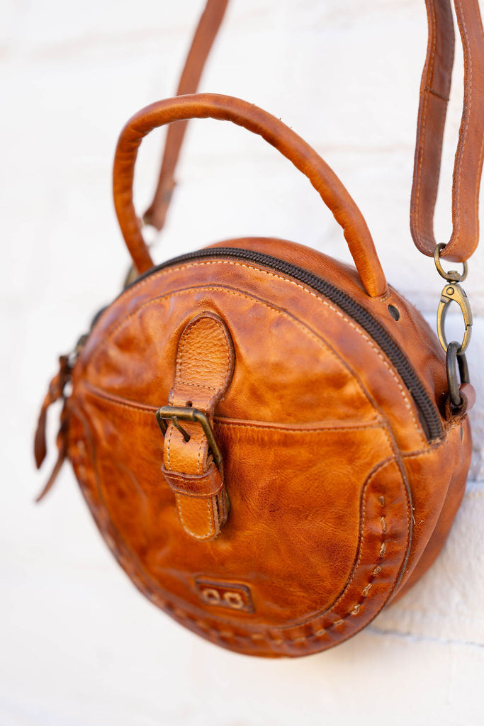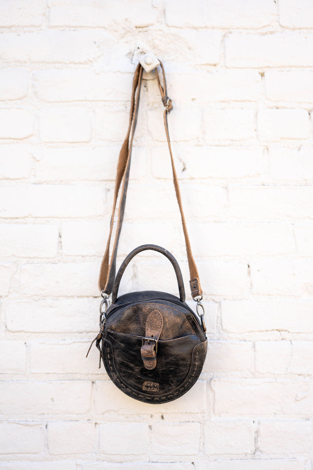 Arenfield is a unique round compact crossbody that has a small front exterior pocket with a magnet close, and a small slip one on the back that make it not just cute, but functional. It has a padded handle, zip-top close and a removable, and adjustable crossbody strap to switch up your look. Circle all things complete with Arenfield.