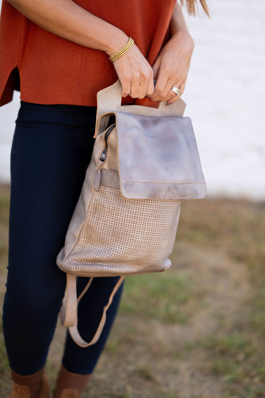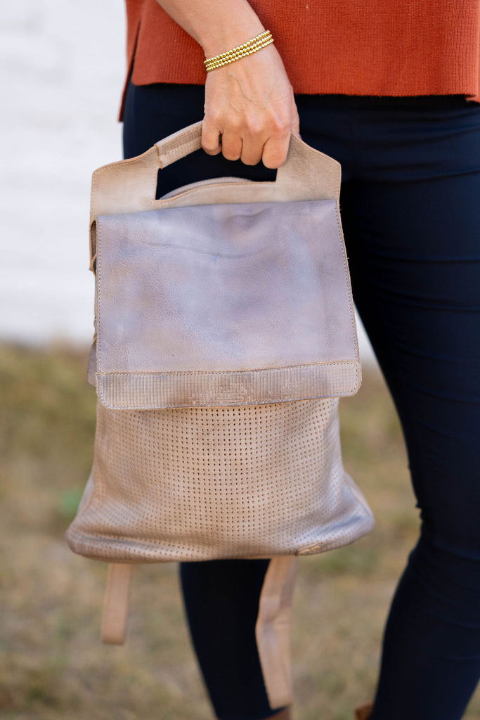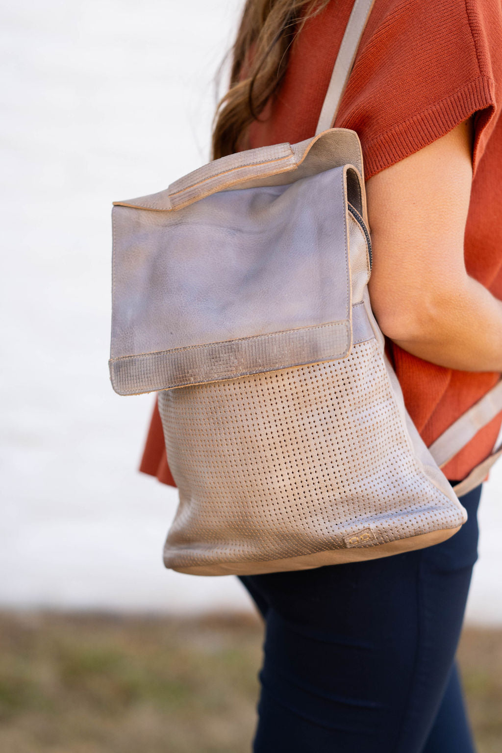 Carry by hand, on your shoulder or upon your back, PATSY is a fun, cutesy addition with so many wearable options. Zip top closure to keep all things safe, large front pocket and back zipper pocket makes this bag a win-win on all fronts. PATSY shows off her veg tanned leather with diamond shaped cutouts and hand stamped details.