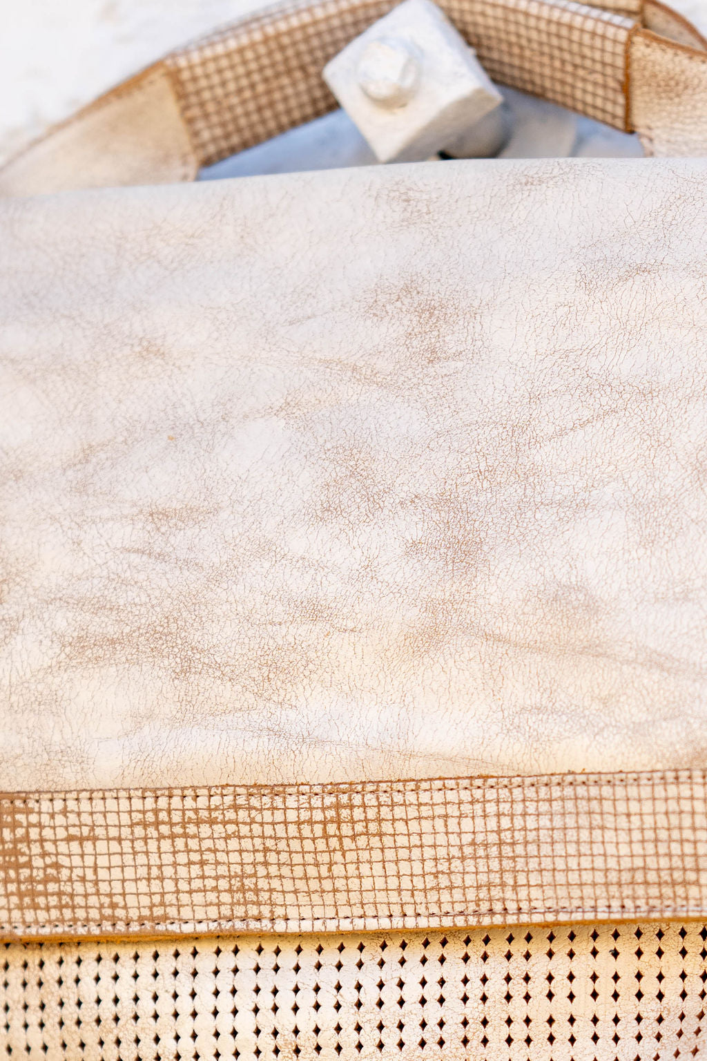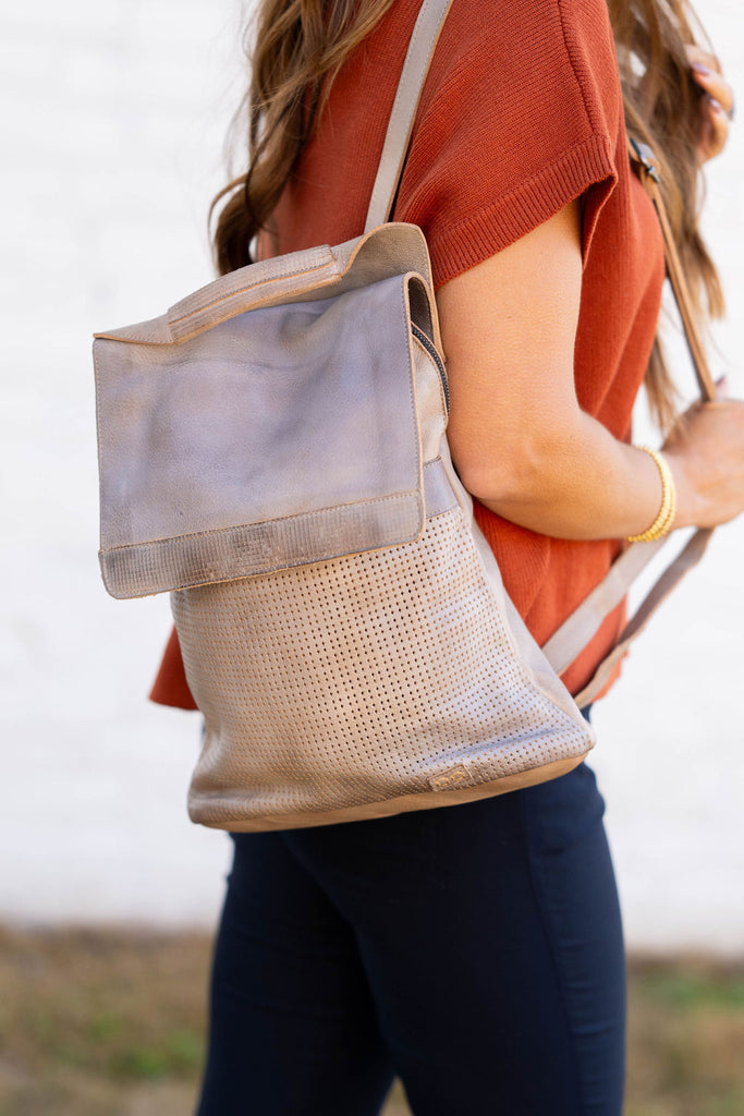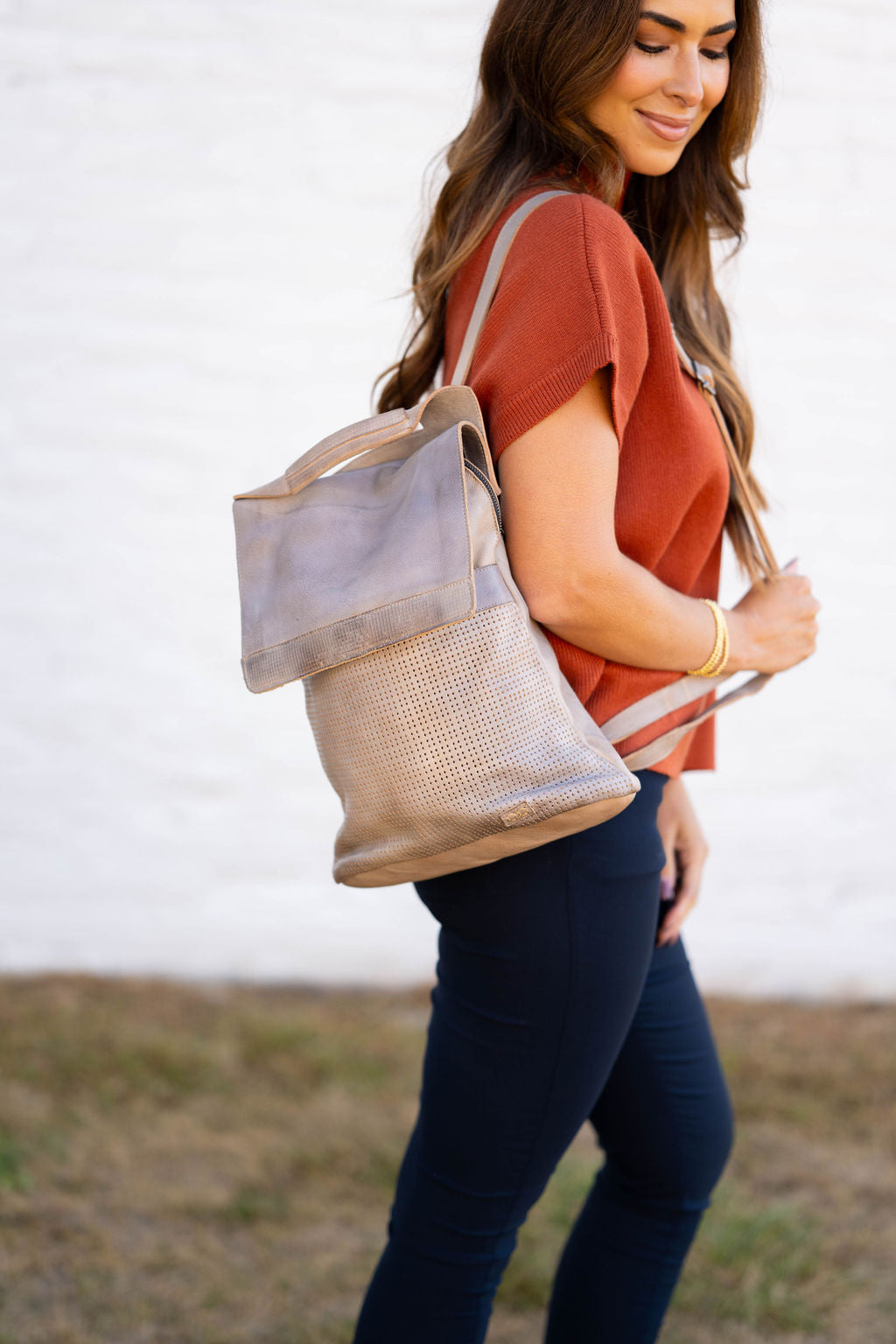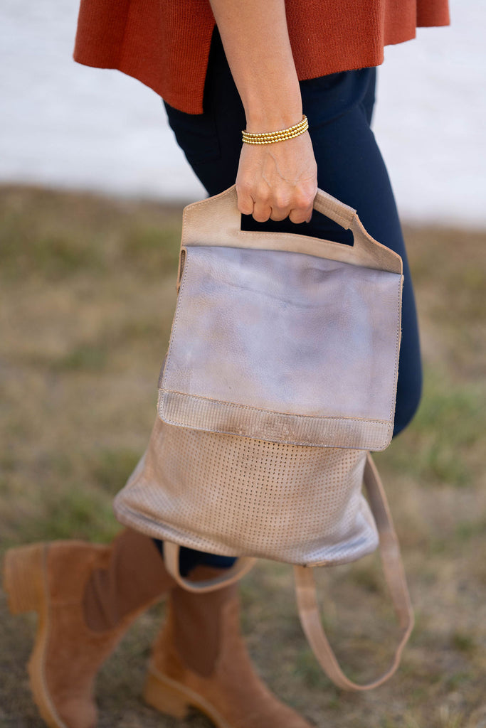 Carry by hand, on your shoulder or upon your back, PATSY is a fun, cutesy addition with so many wearable options. Zip top closure to keep all things safe, large front pocket and back zipper pocket makes this bag a win-win on all fronts. PATSY shows off her veg tanned leather with diamond shaped cutouts and hand stamped details.