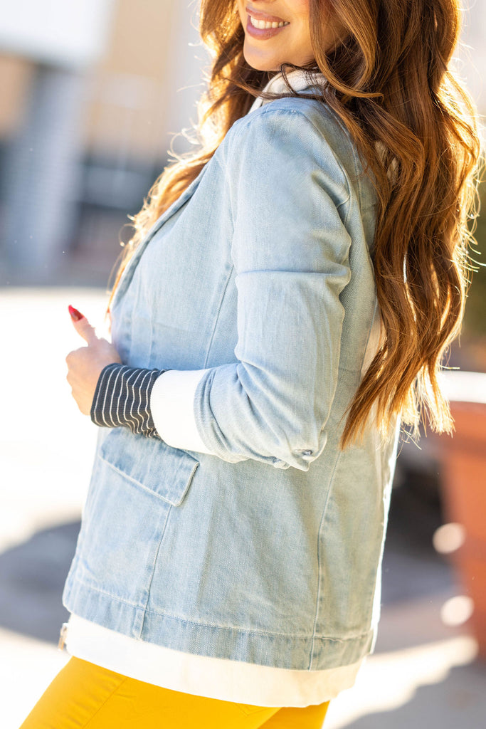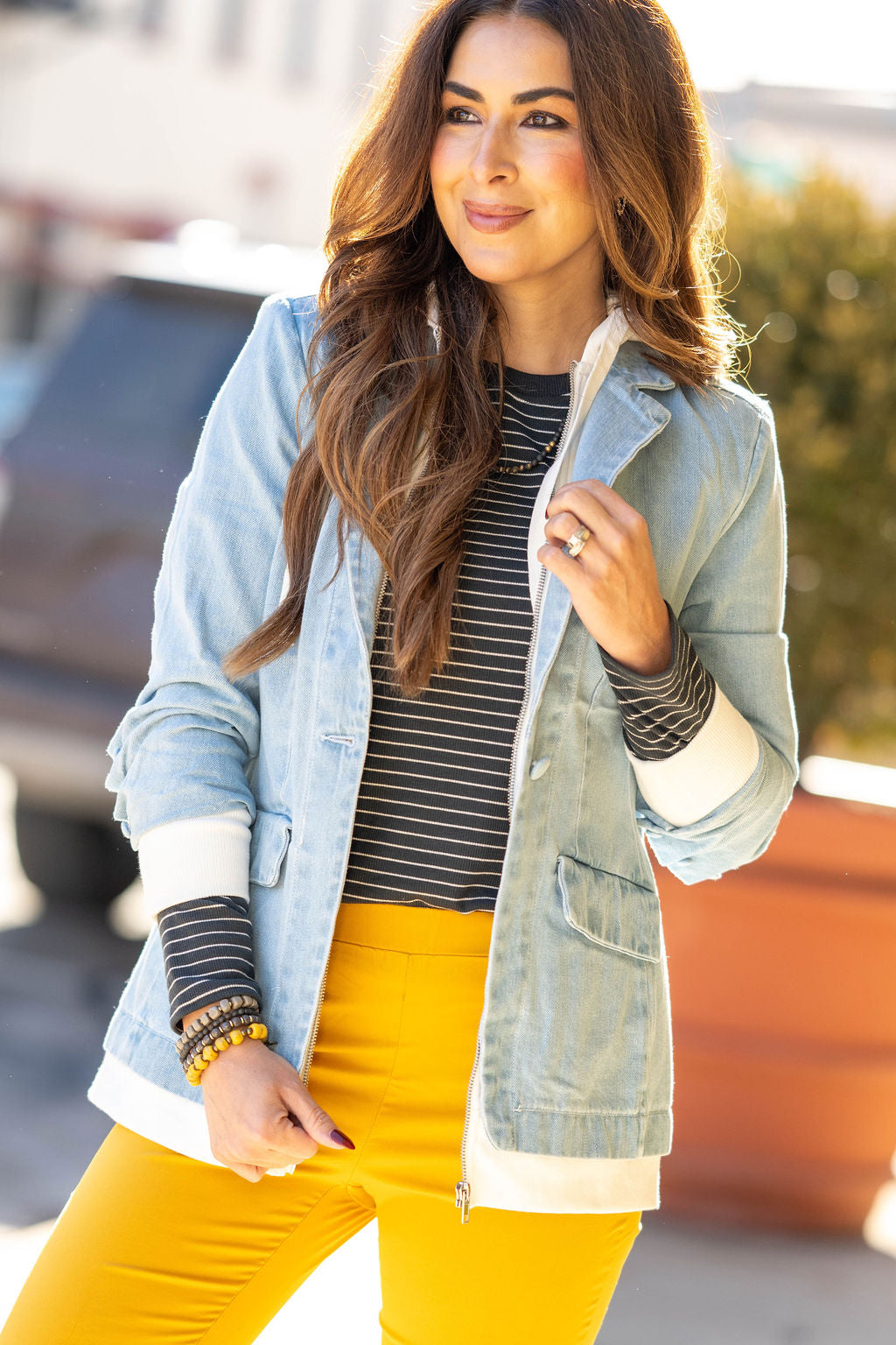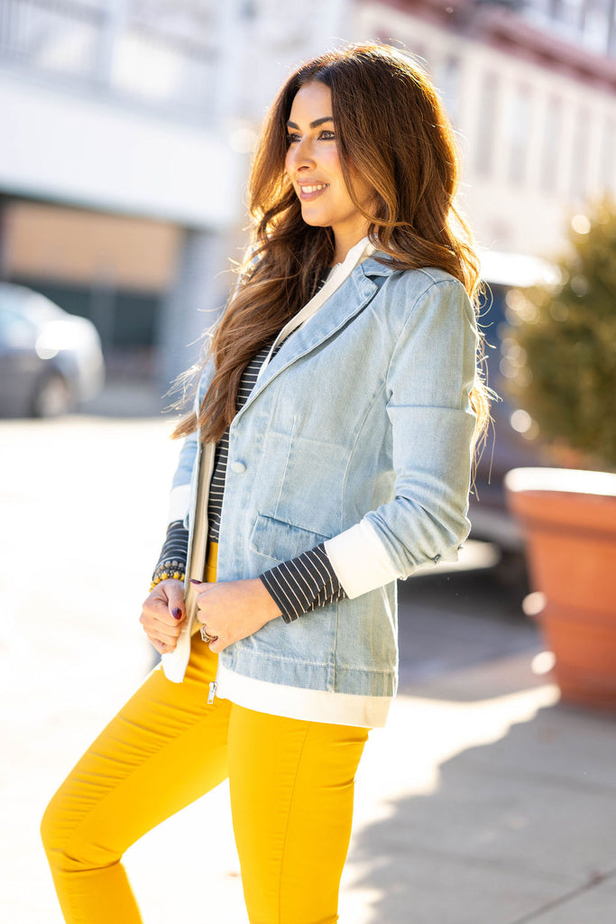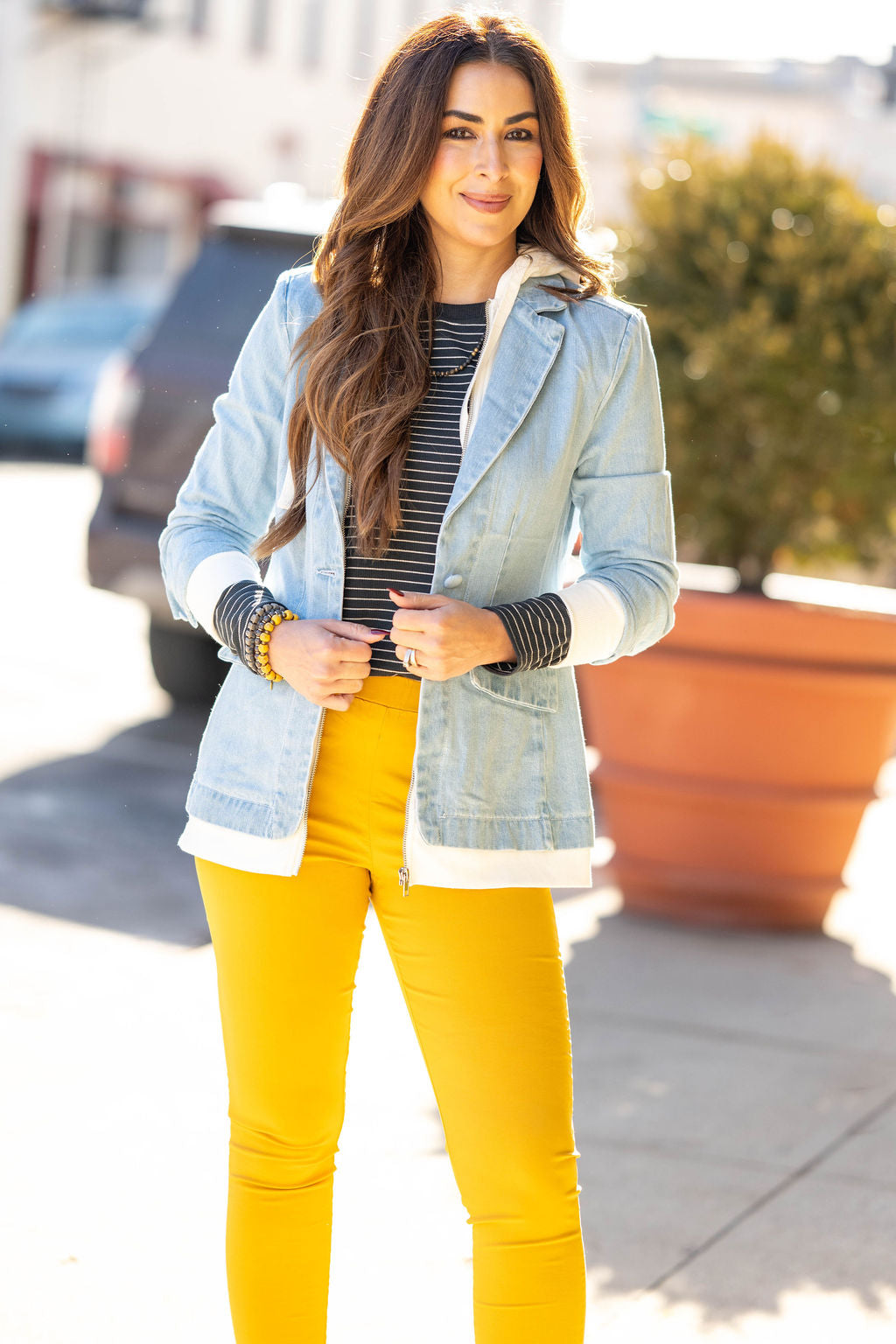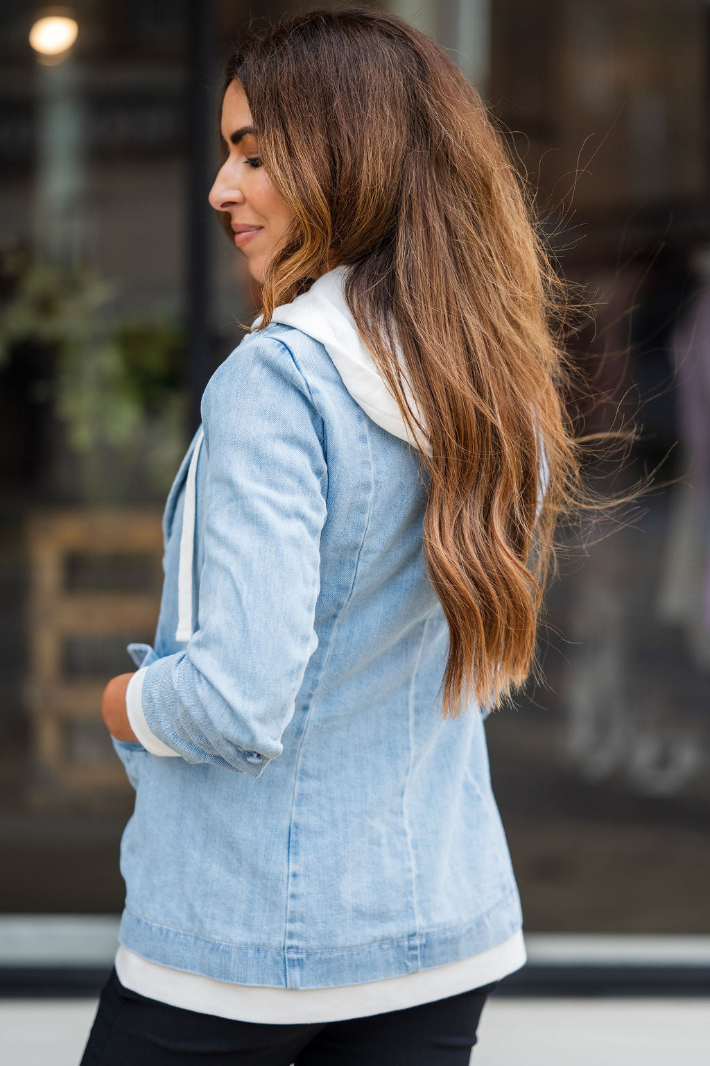 The perfect mash-up of a hoodie, a blazer, and a denim jacket! The denim blazer is lined with a hooded sweatshirt, making this such a unique piece! Dress this up or down for everyday wear!