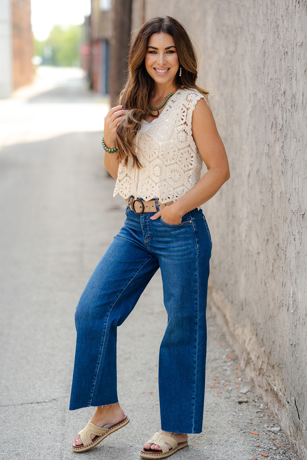 The detailed crocheted look and tie front detailing of this vest have us swooning! Pair with a blouse, dress, basic tee or tank, long sleeve, anything! This is easy to dress up or down for everyday wear!