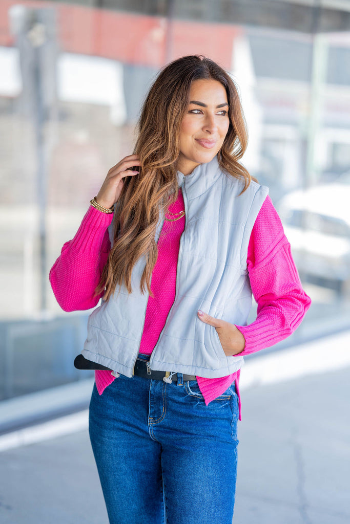 Stay warm without losing your cool—this light gray vest is the perfect finishing layer for everyday looks. Effortless and versatile, it’s made to throw on and head out the door in style.