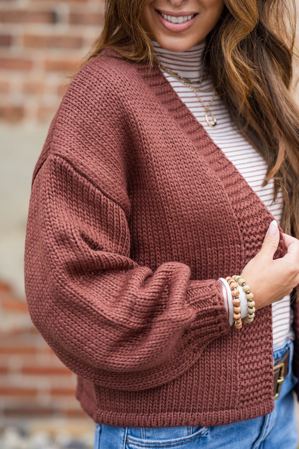 Ribbed Trim Balloon Sleeve Knit Cardigan