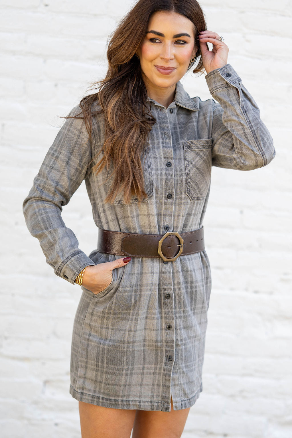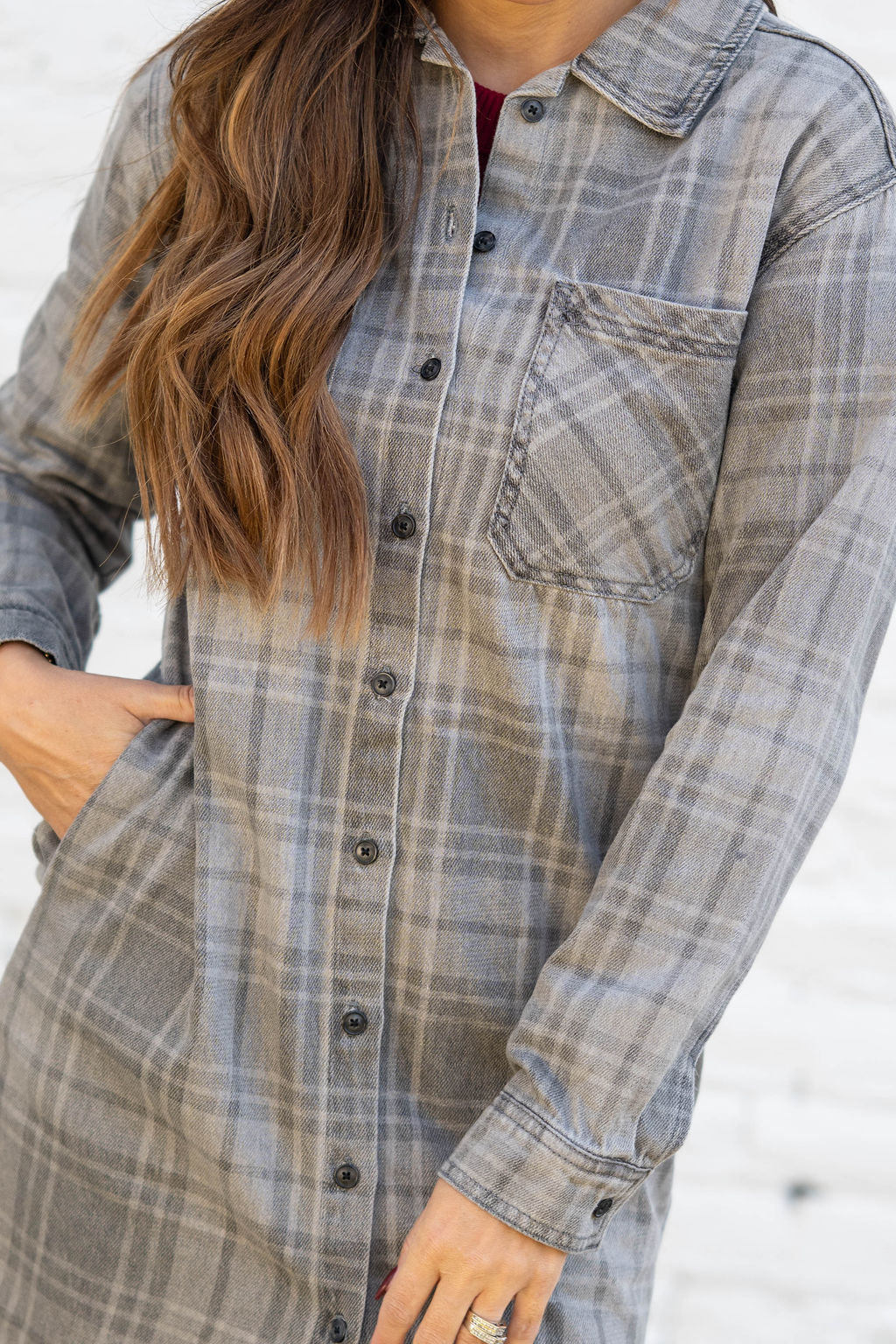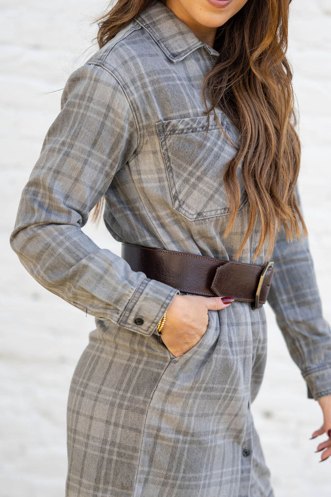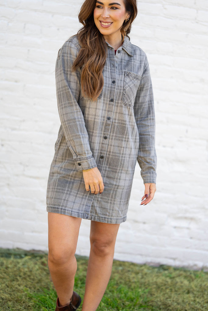 Classic, comfy, and endlessly versatile — this plaid shirt dress brings that charming feel to your fall wardrobe. Made from a soft, brushed fabric in muted gray tones, it offers the perfect blend of warmth and ease.