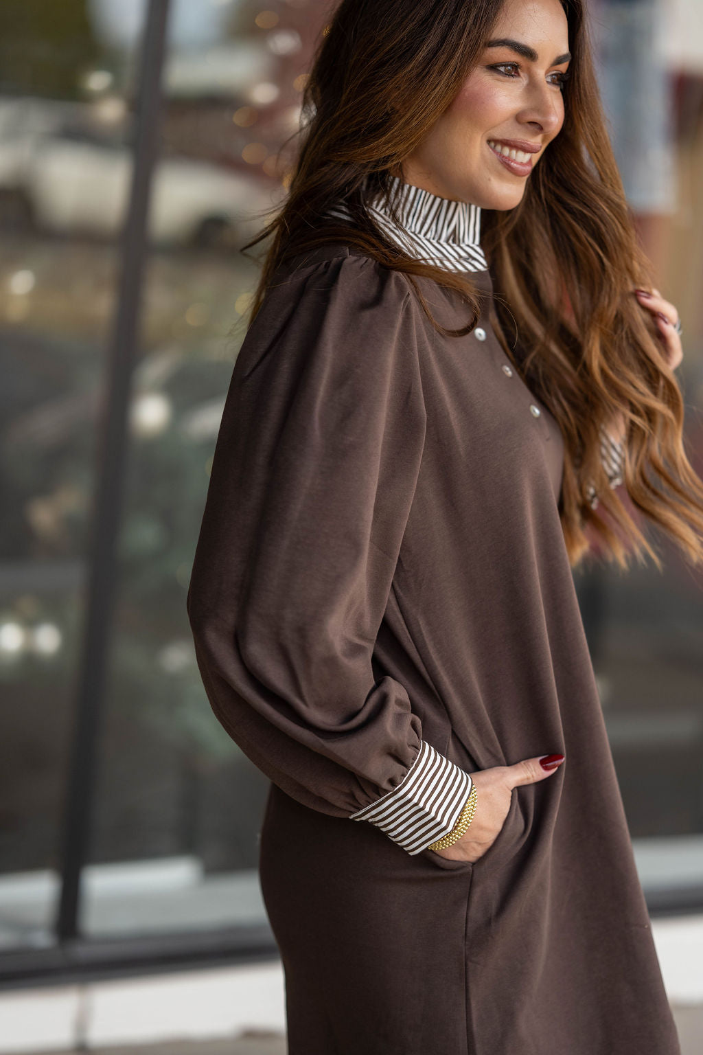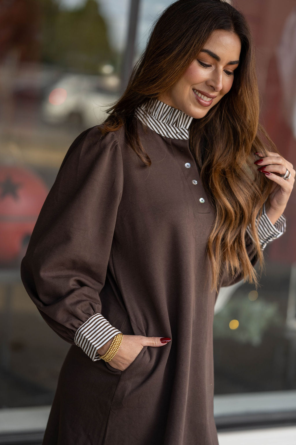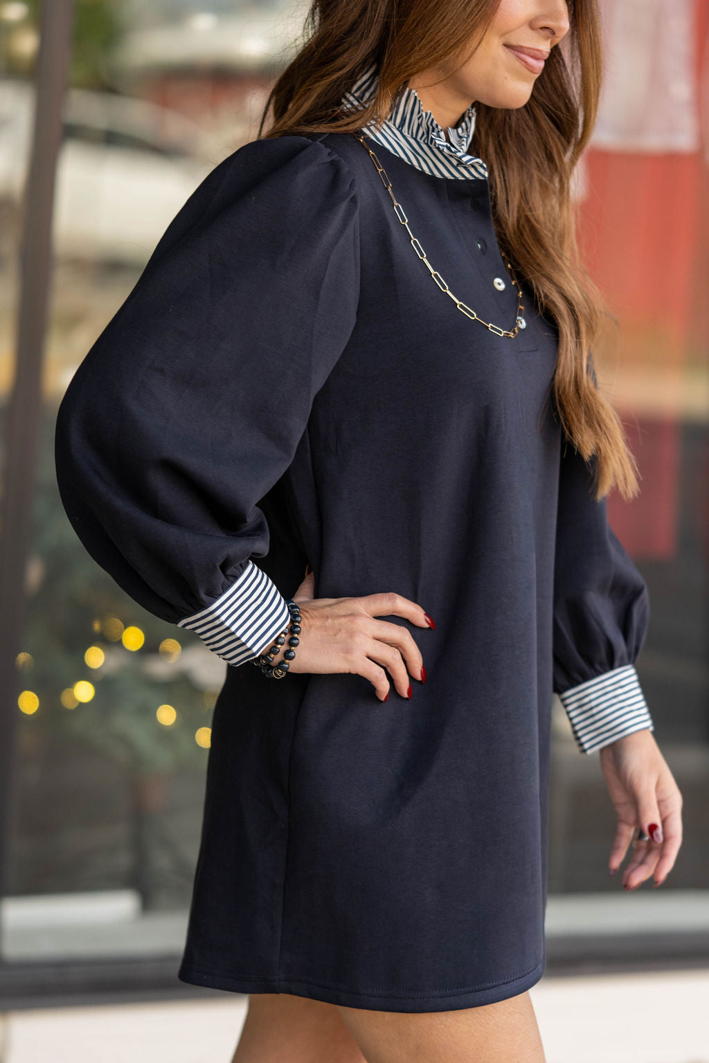 Effortless and polished, this collared dress brings classic prep style to modern everyday wear. The contrast striped collar and cuffs give it that elevated, layered look without the extra bulk.