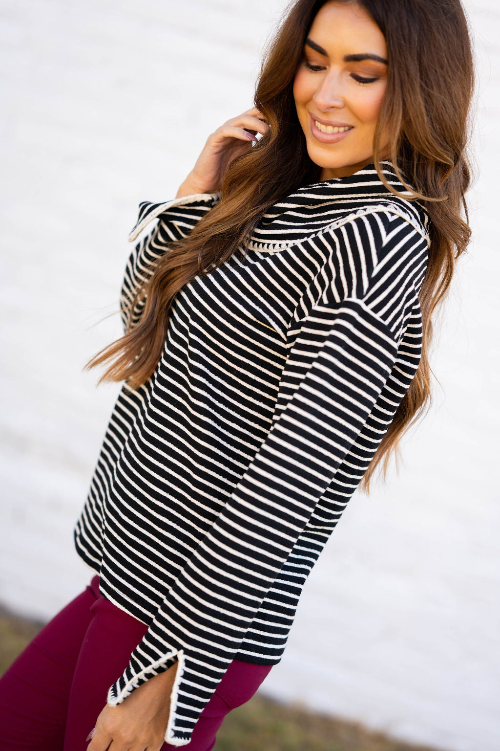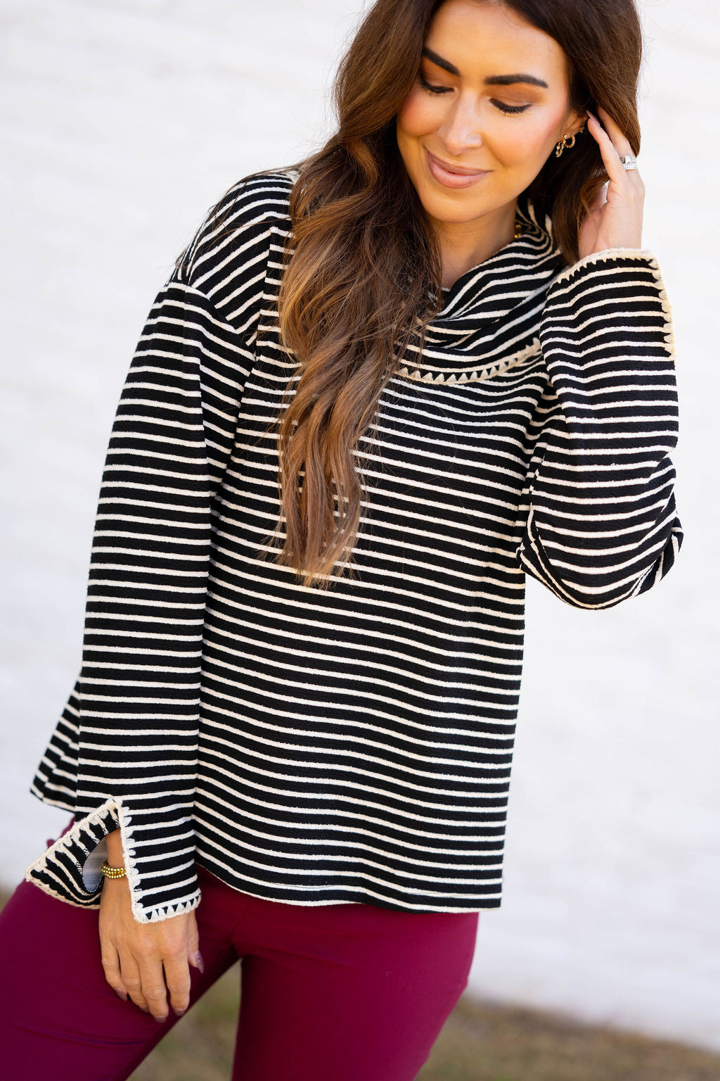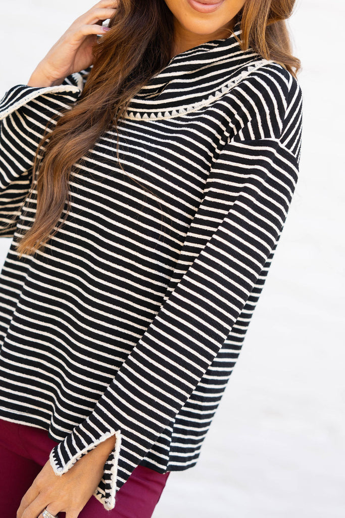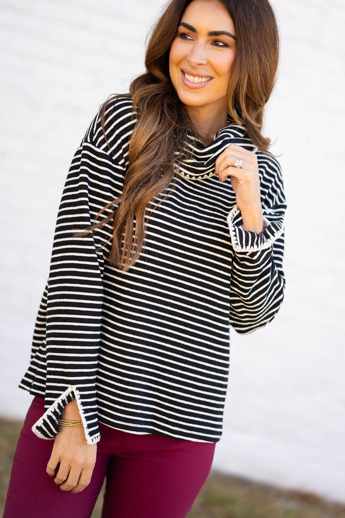 Chic stripes meet timeless charm in this cozy cowl-neck top. Whether you’re headed to brunch or strolling downtown, it’s the perfect mix of effortless and elevated.