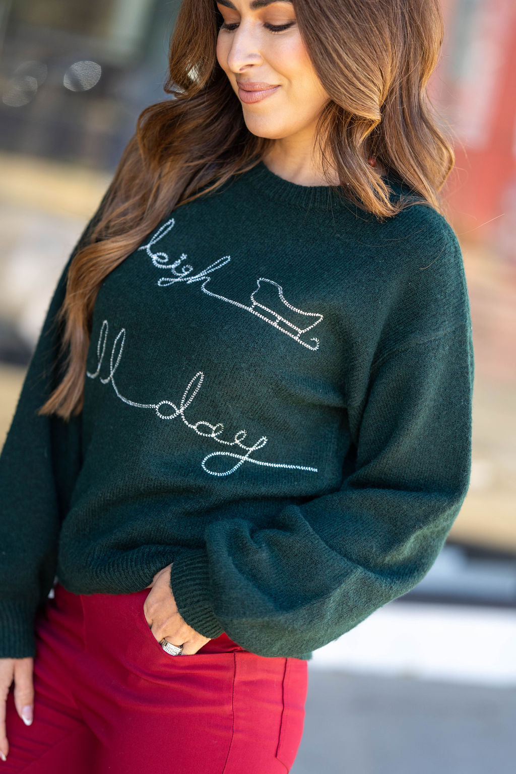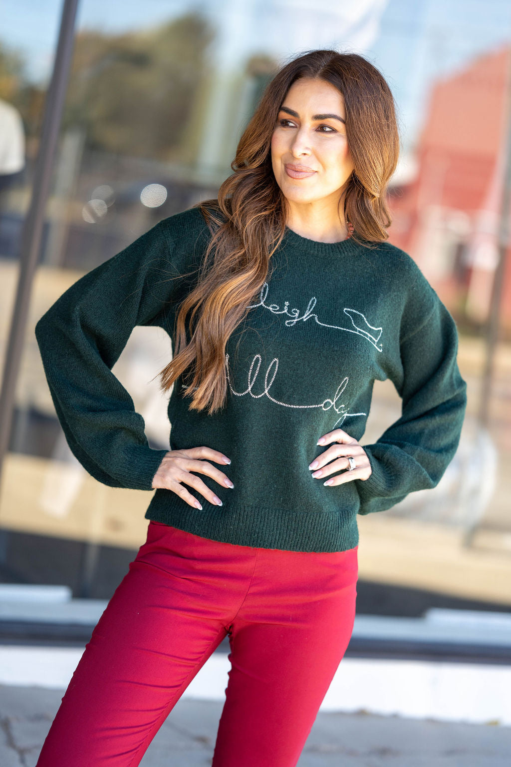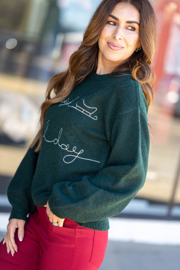 Festive spirit meets everyday comfort in this playful knit. With rhinestone script detailing and a classic crew neckline, it’s the perfect sweater to sparkle through the season.