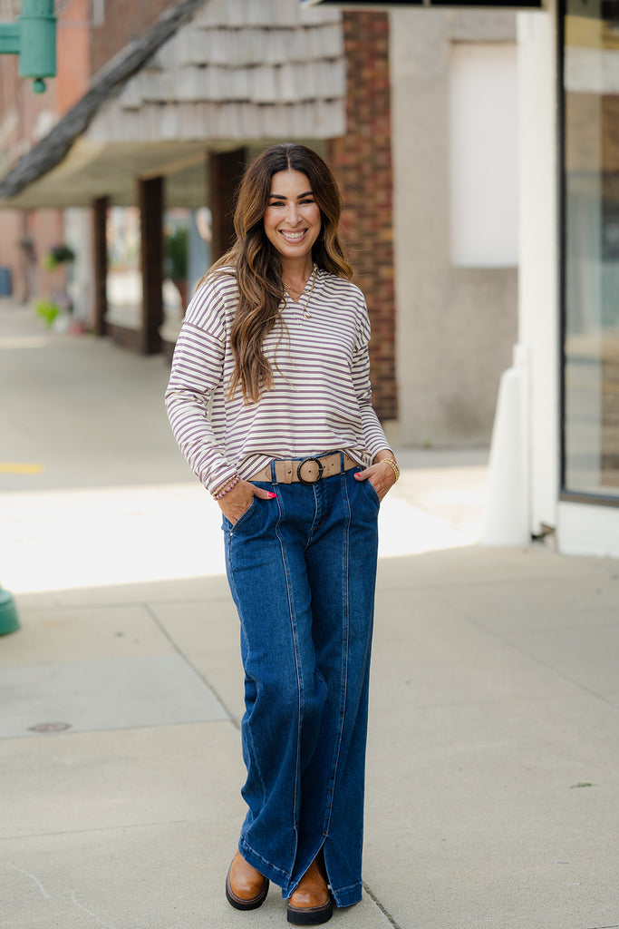 A relaxed long-sleeve v-neck tee elevated with classic dual stripes! Wear this alone or use this as a layering piece for all of your vests, shackets, or cardigans! We suggest adding a pop of color with our Betsey's Jeggings and a statement necklace for an easy yet super cute look!