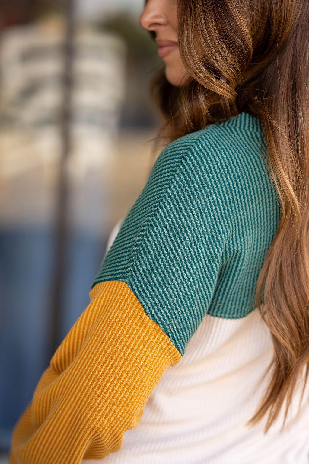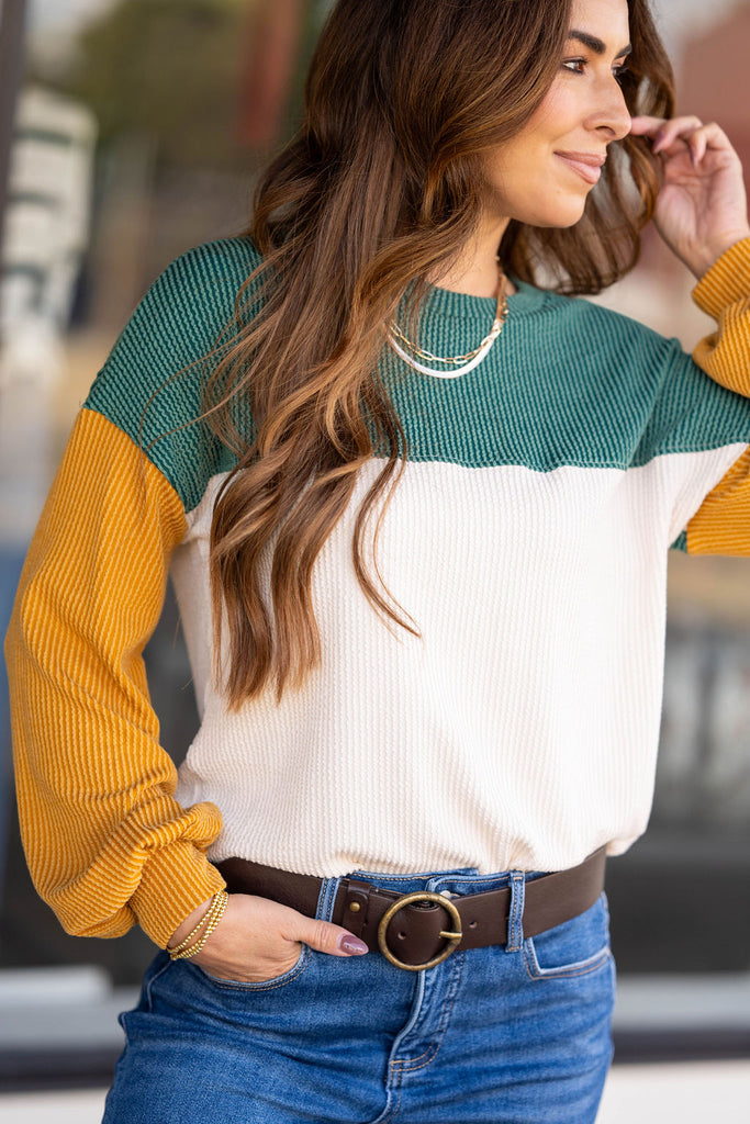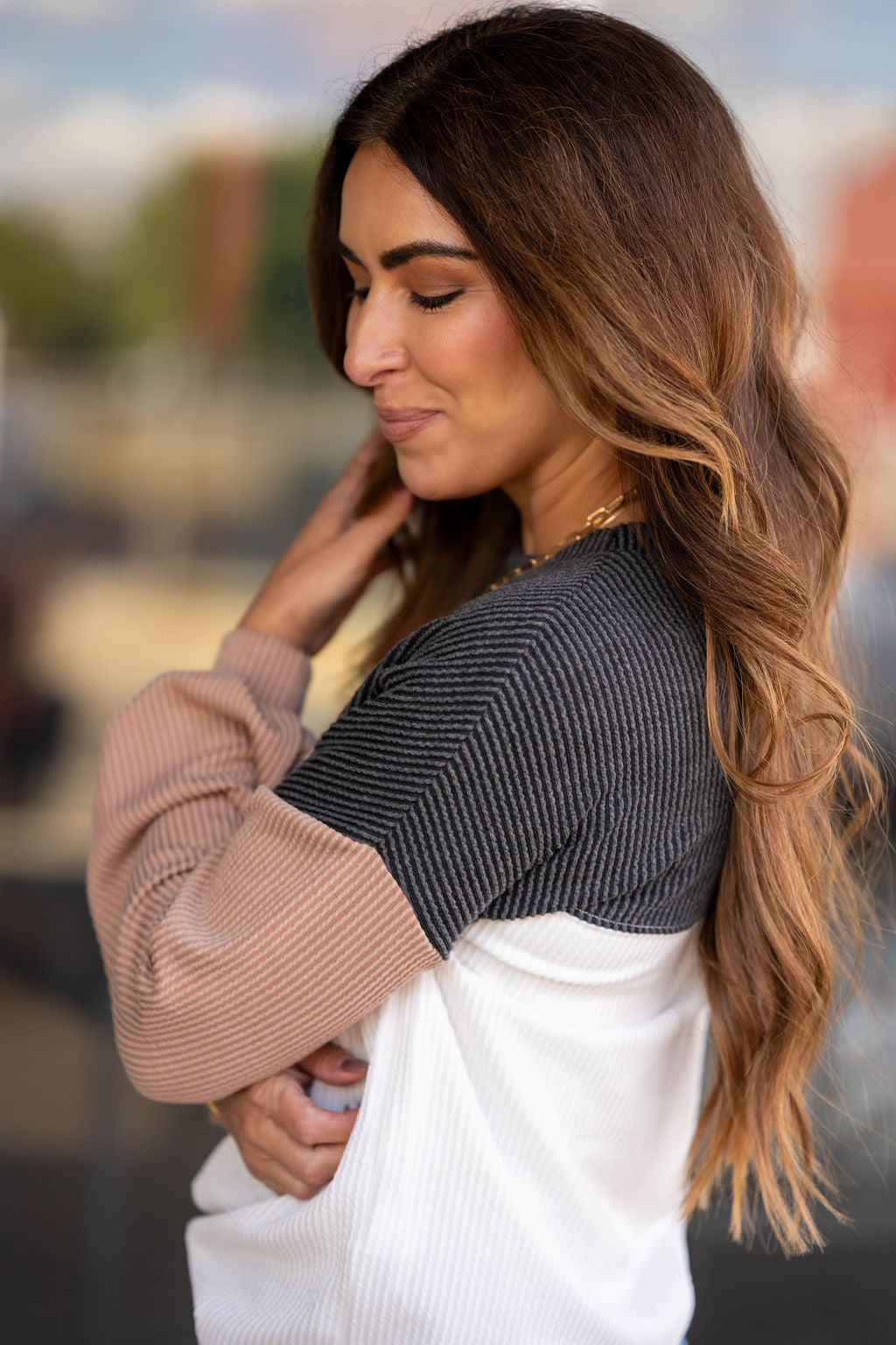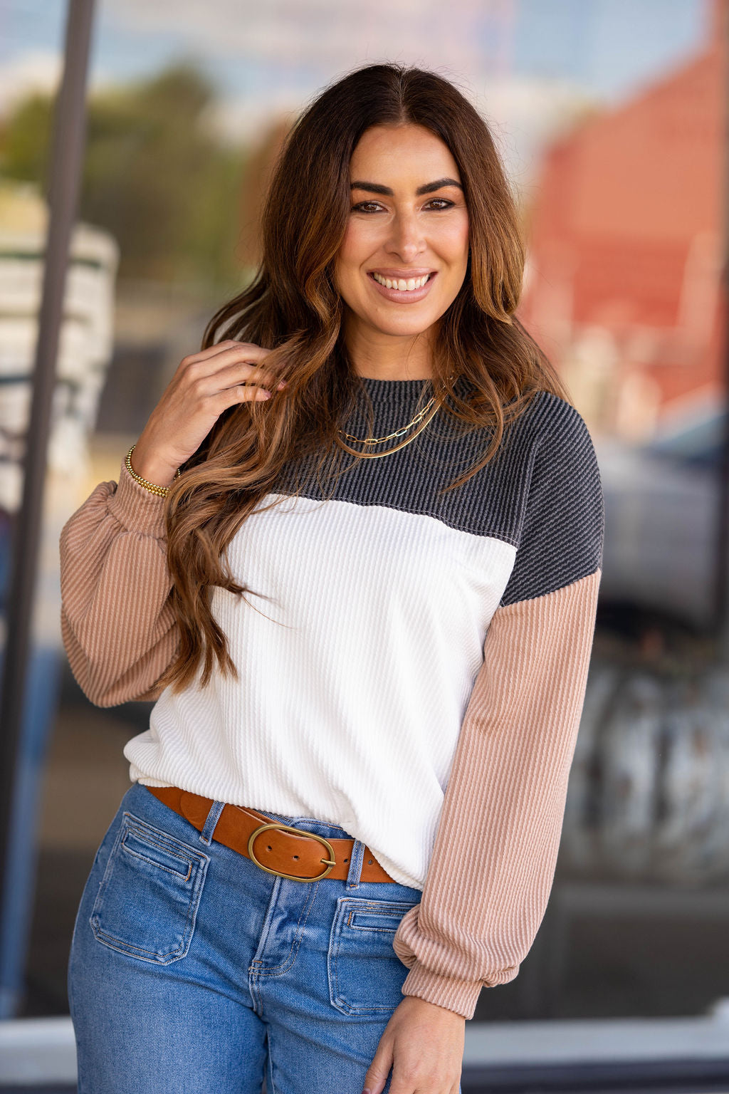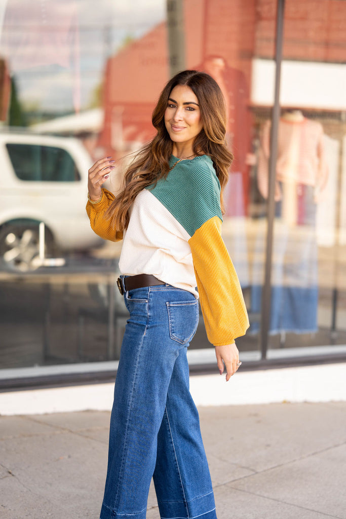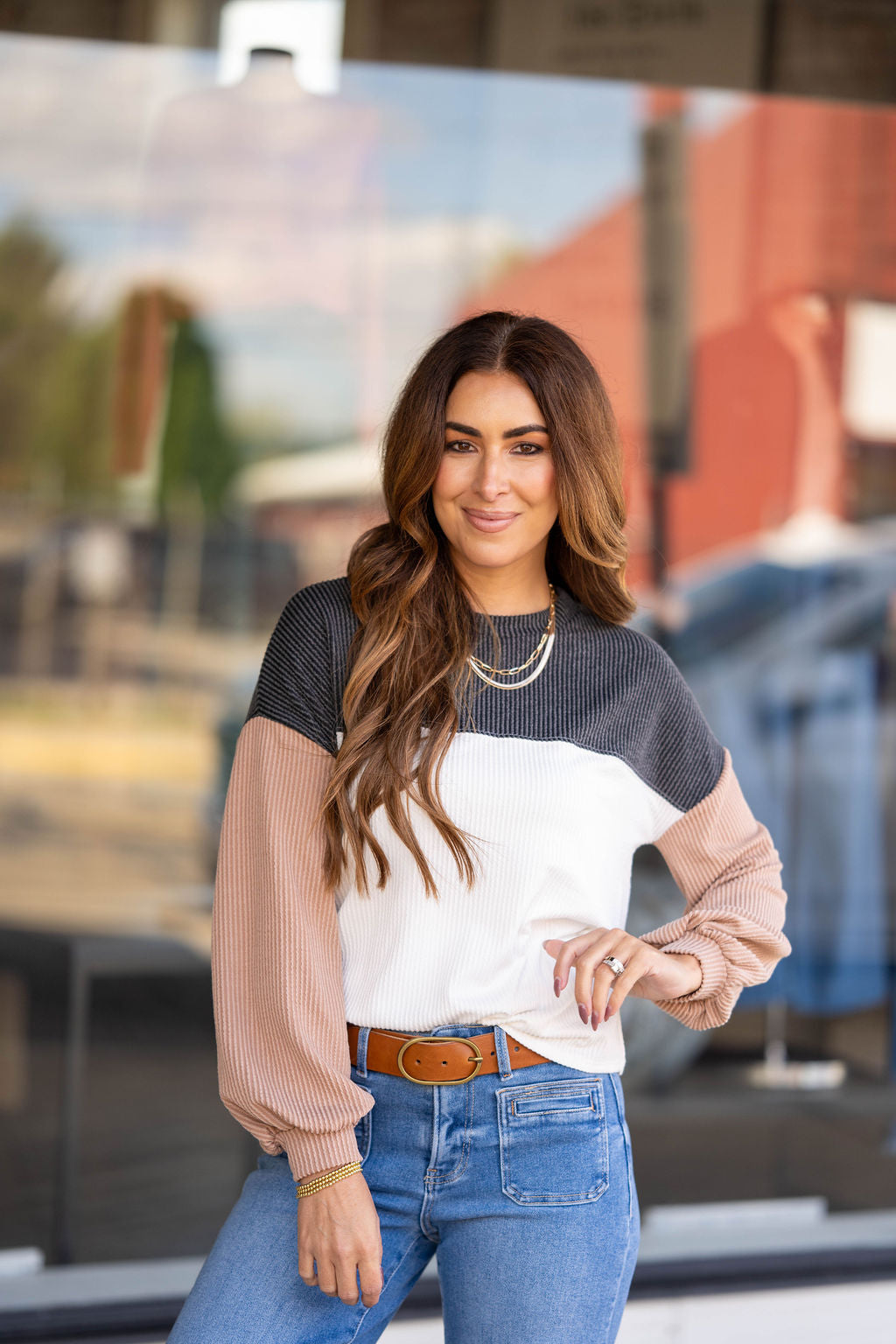 Playful yet polished, this color-blocked top brings effortless charm to your everyday style. The lightweight textured fabric and soft balloon sleeves make it the perfect go-to for casual outings, coffee runs, or weekend plans year-round.