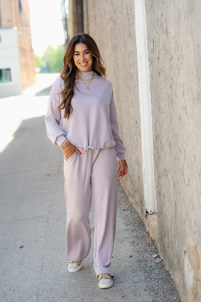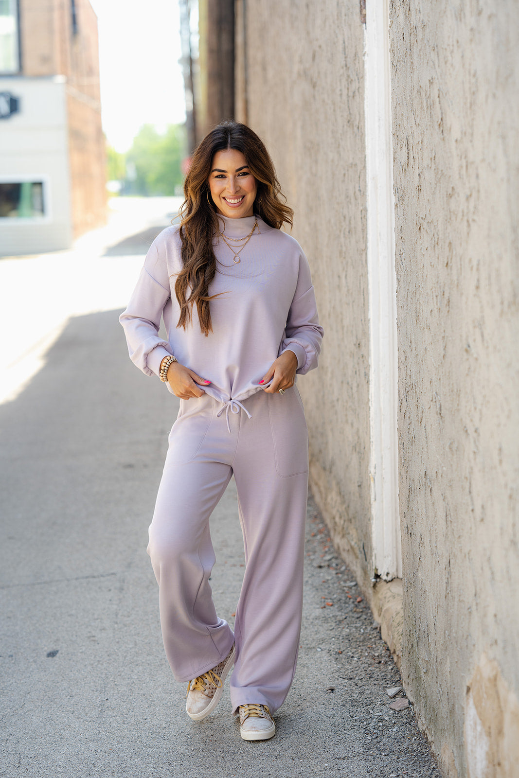 Your new go-to sweatshirt has arrived! Soft and lightweight, this can be worn with shorts in the warmer months or leggings, denim, or joggers in the cooler ones! We love that this can take you from the gym to busy days on-the-go! The mock neckline and tie bottom detailing give this such a fun vibe. The scuba material makes this such a comfy piece to have and this pairs perfectly with our Wide Leg Drawstring Scuba Pants for a complete set!