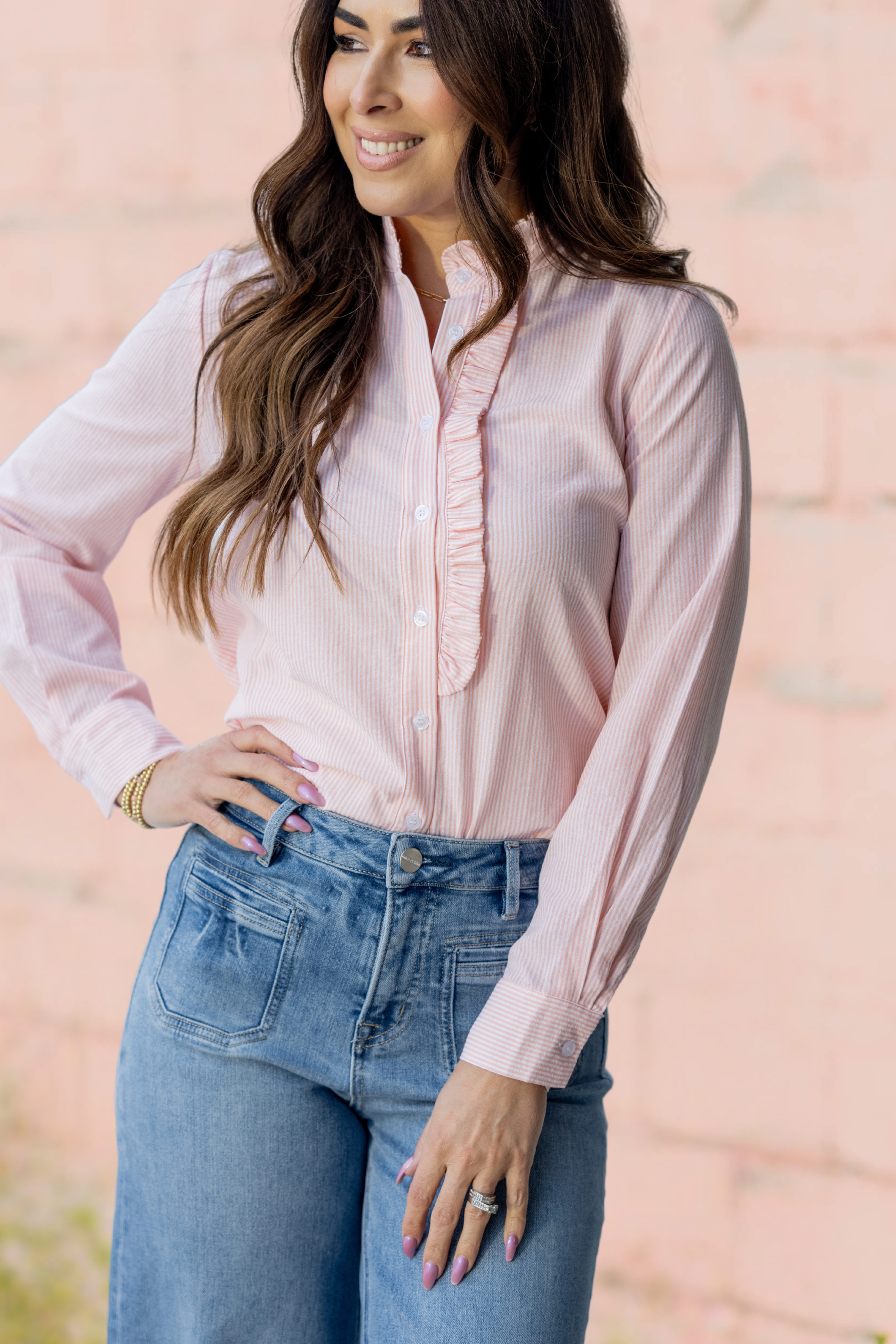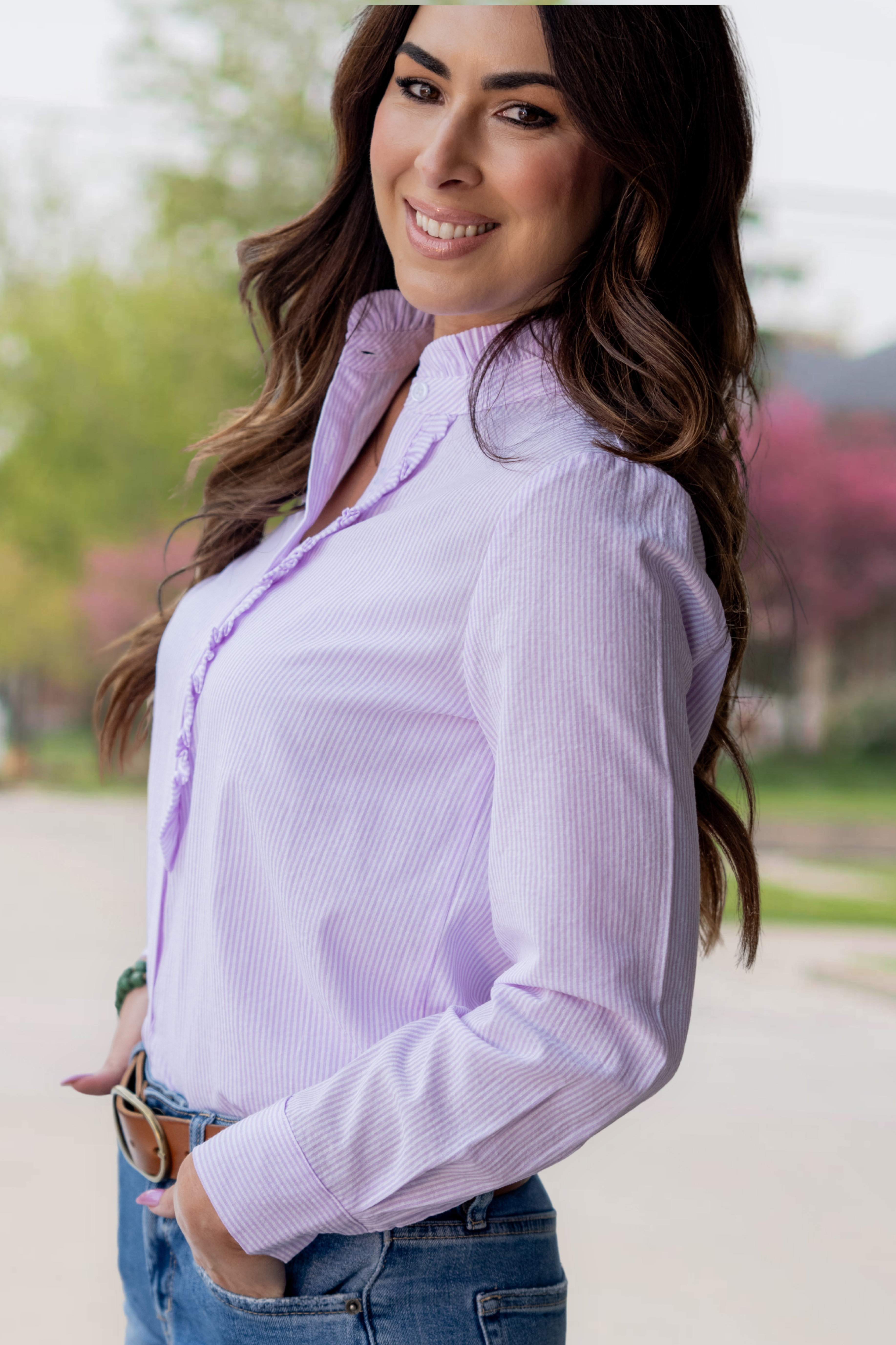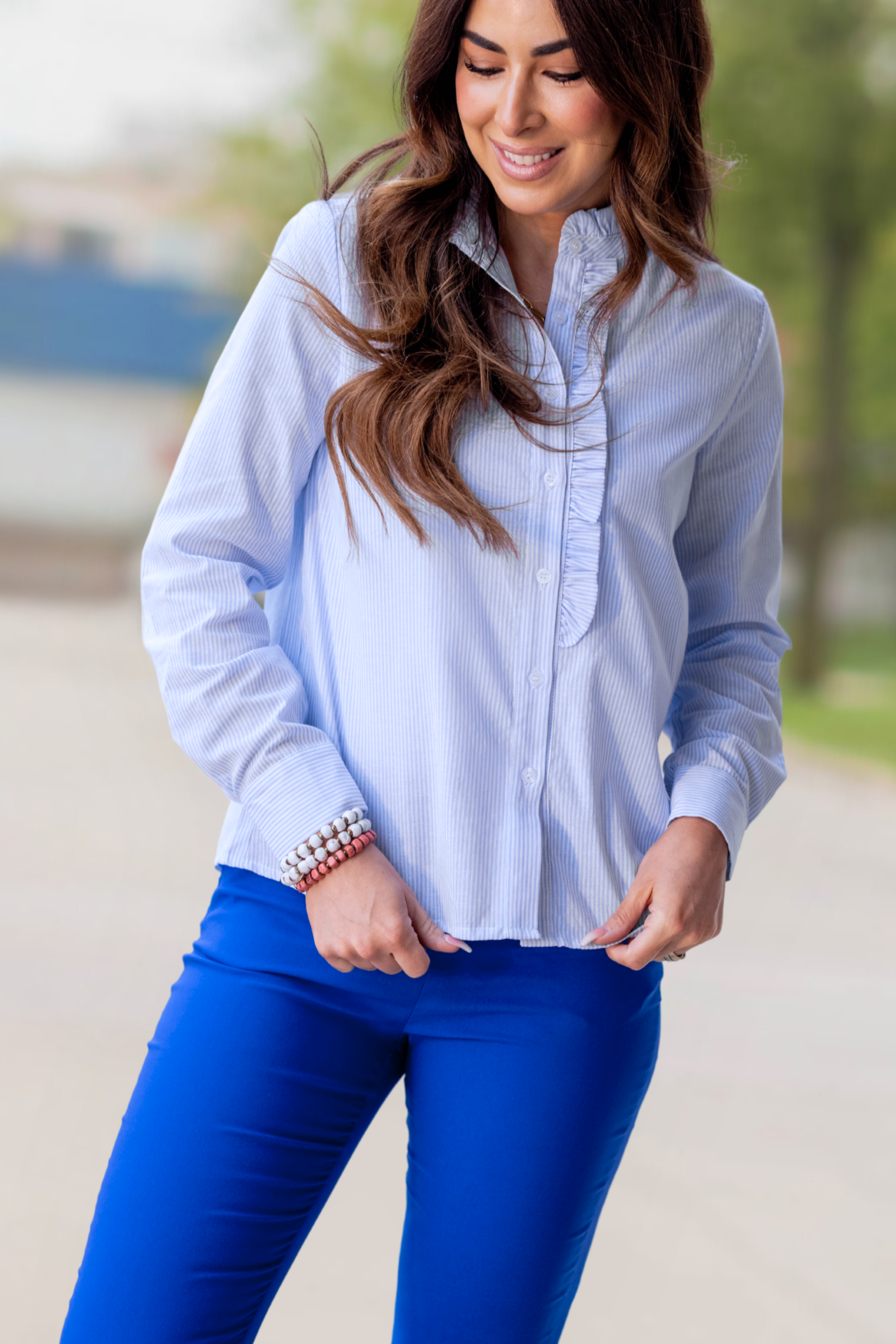 Crisp, polished, and subtly feminine — this striped button-down blouse features a delicate ruffle placket that adds just the right amount of charm.