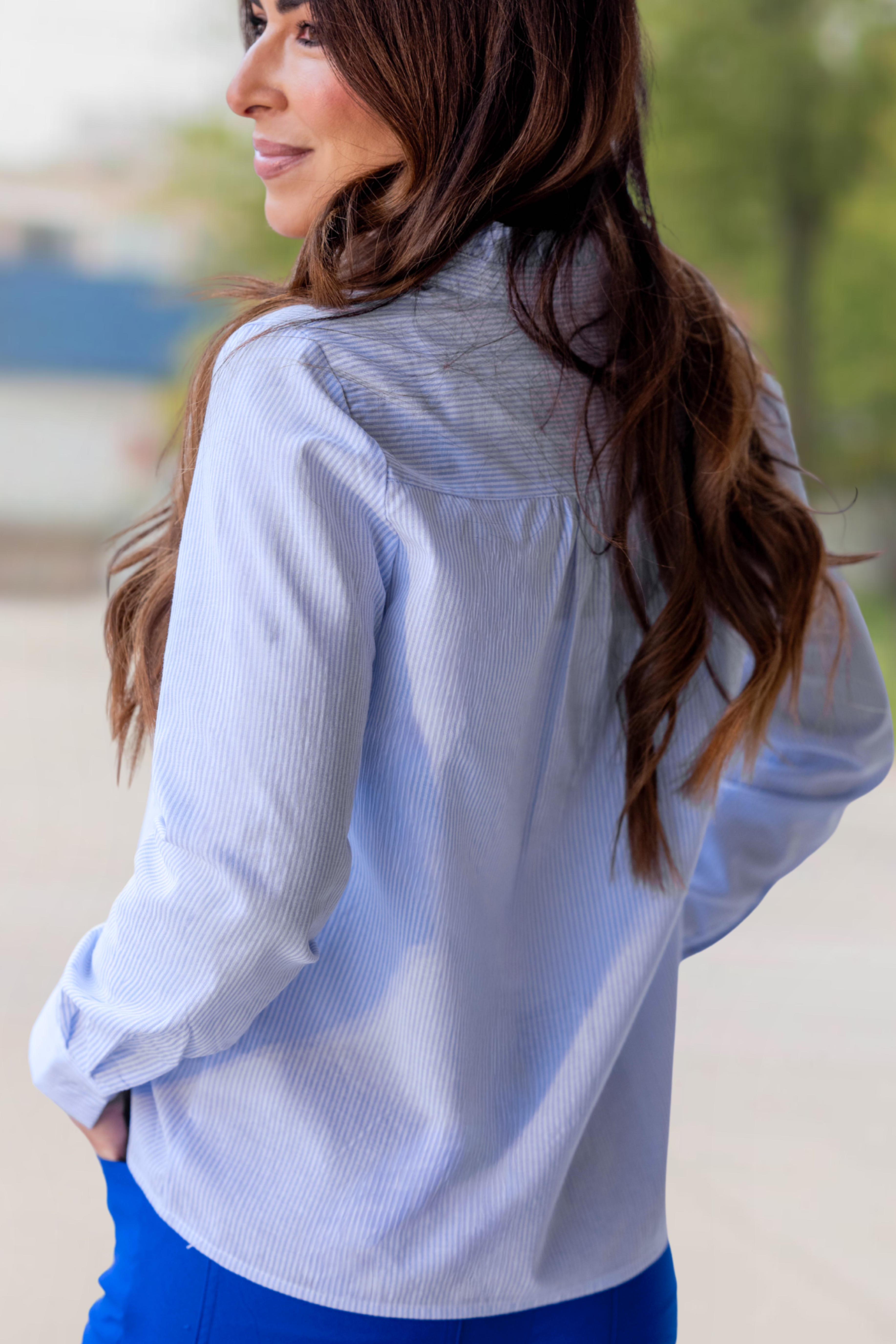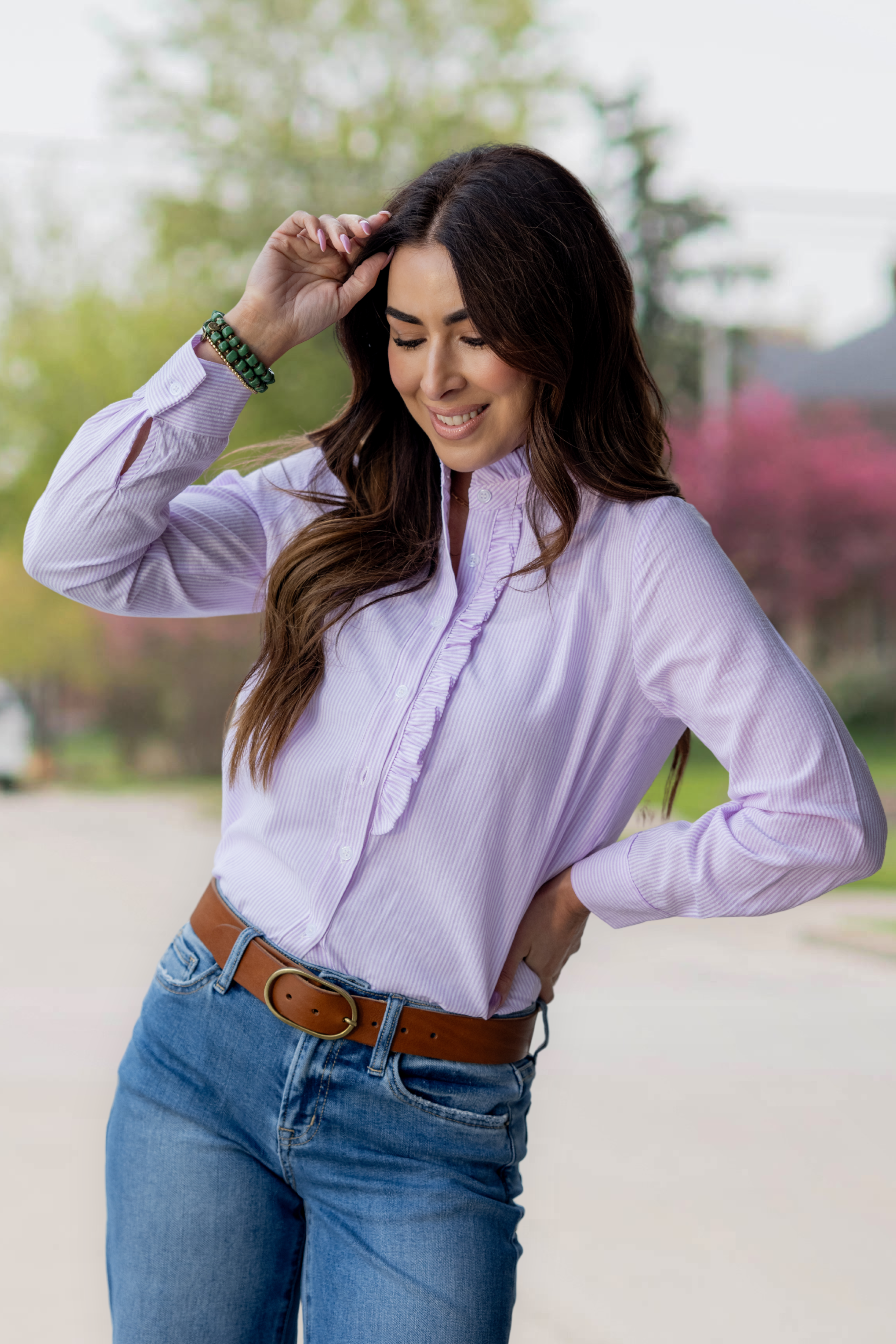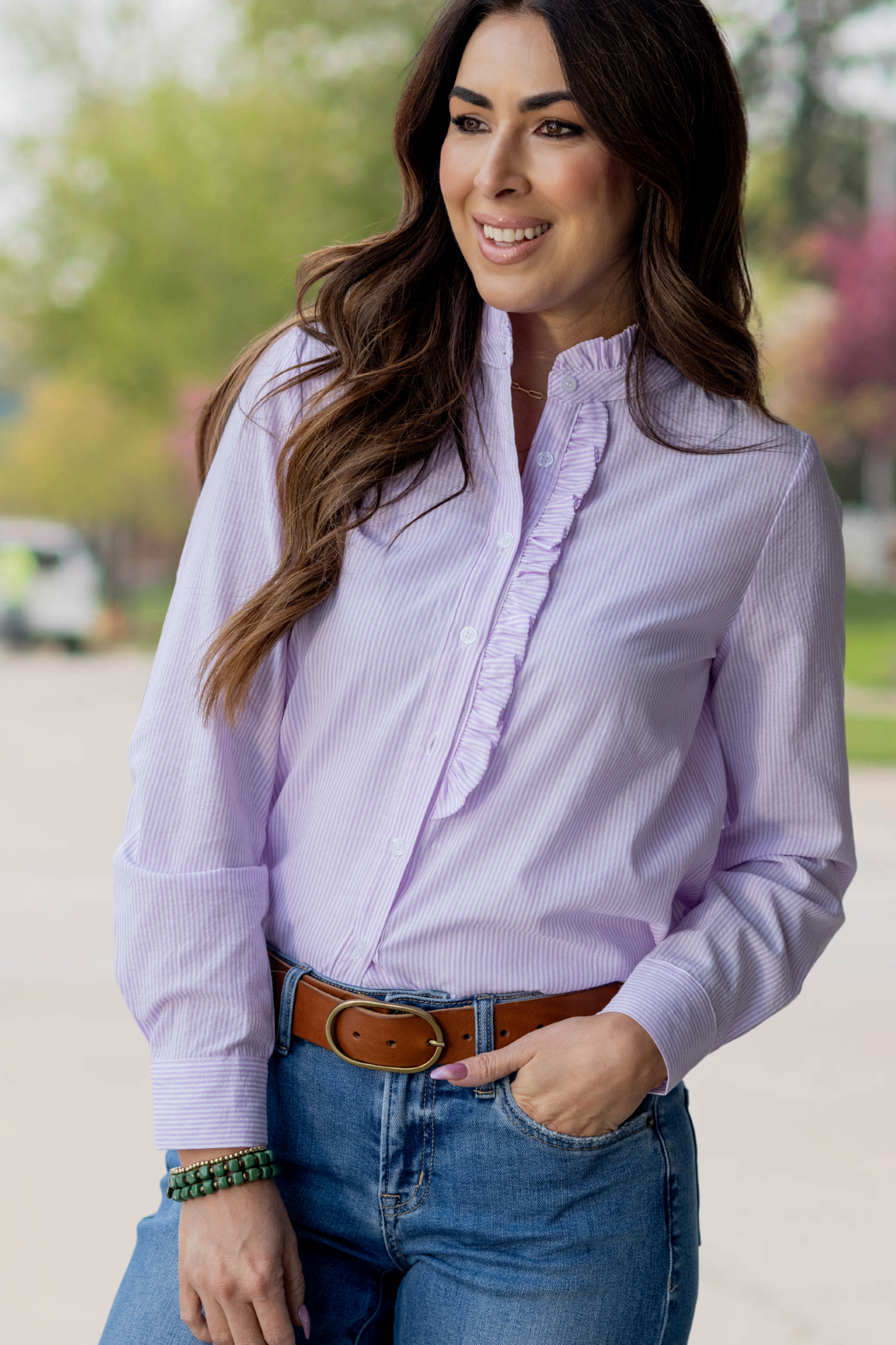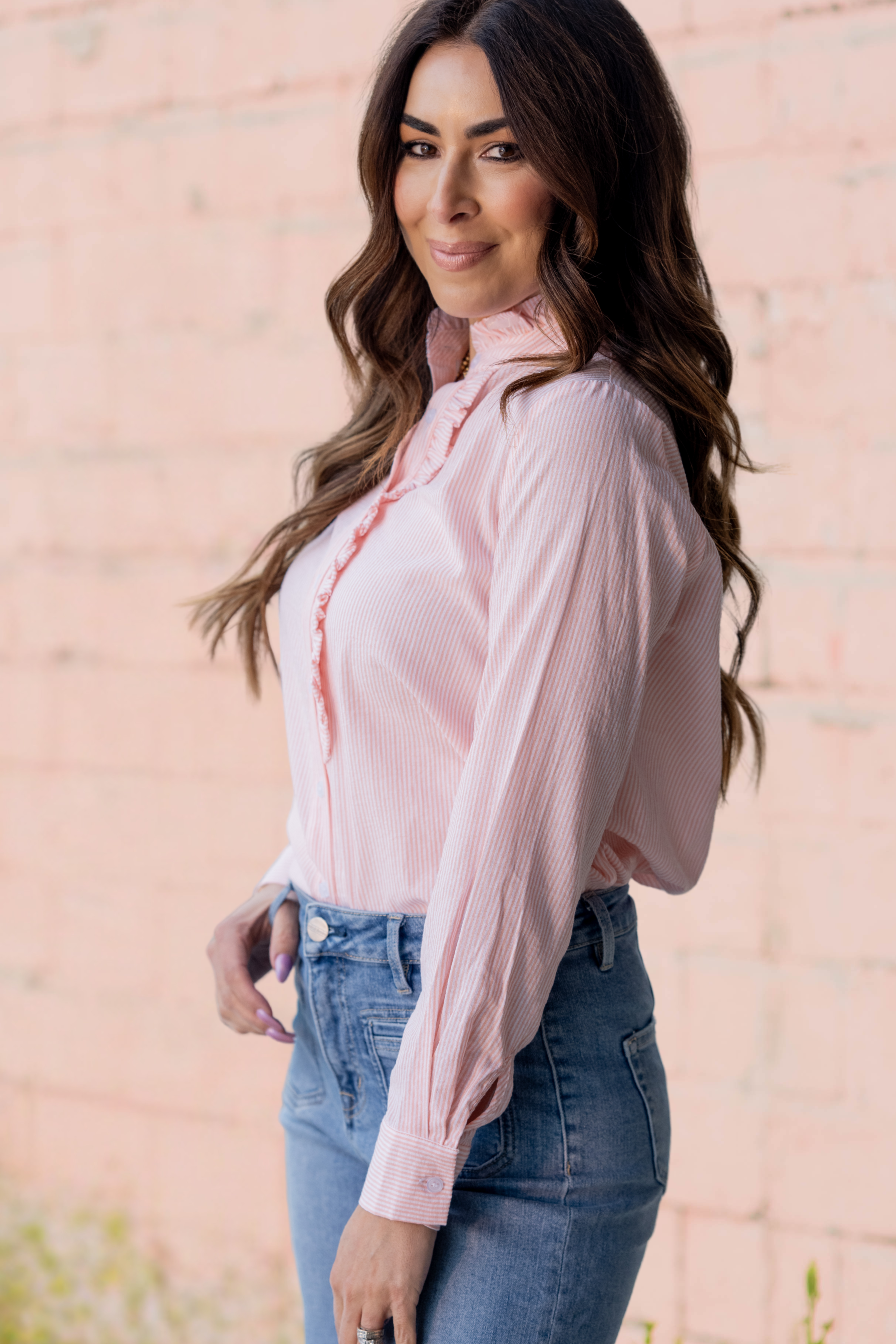 Crisp, polished, and subtly feminine — this striped button-down blouse features a delicate ruffle placket that adds just the right amount of charm.