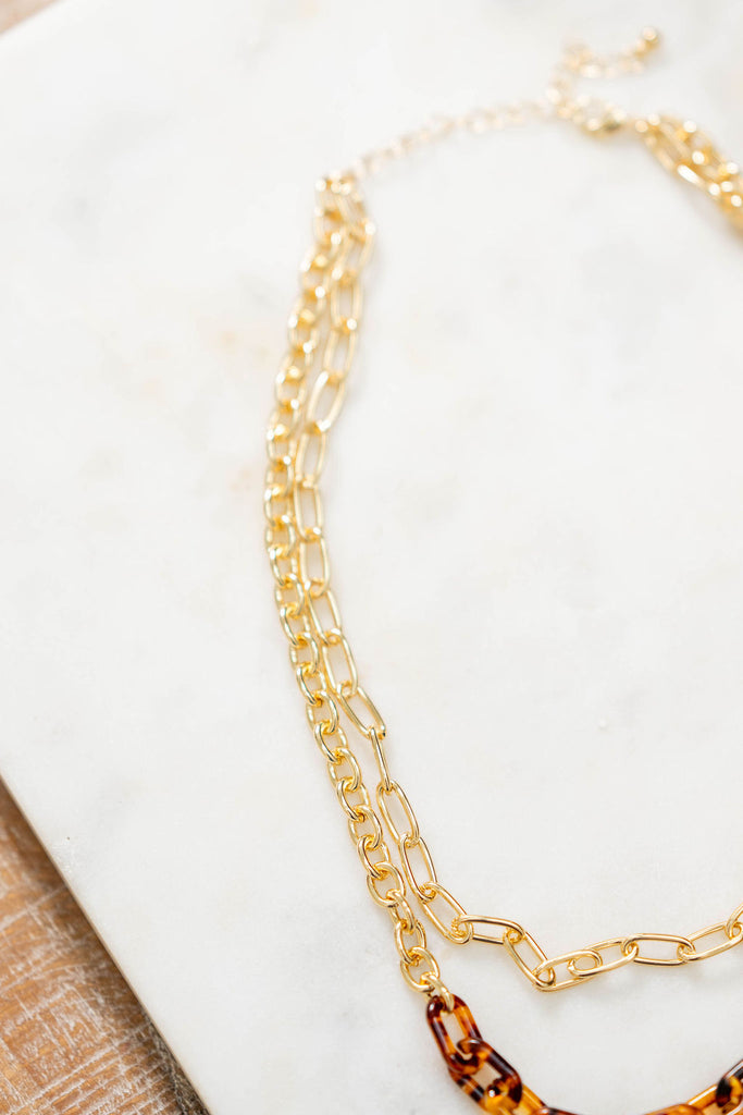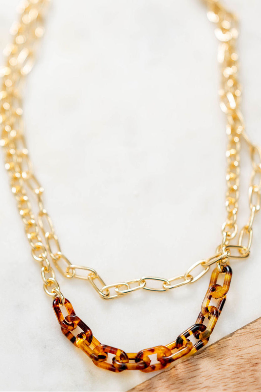 This necklace combines glossy gold links with a rich tortoise chain for the perfect layered look. It’s bold enough to stand out on its own but versatile enough to pair with everyday essentials. A statement piece that brings warmth, texture, and effortless style to any outfit.