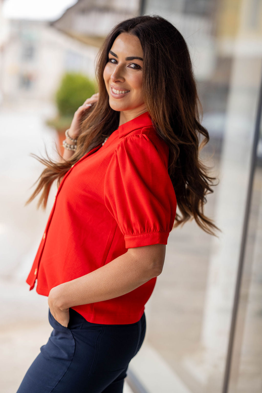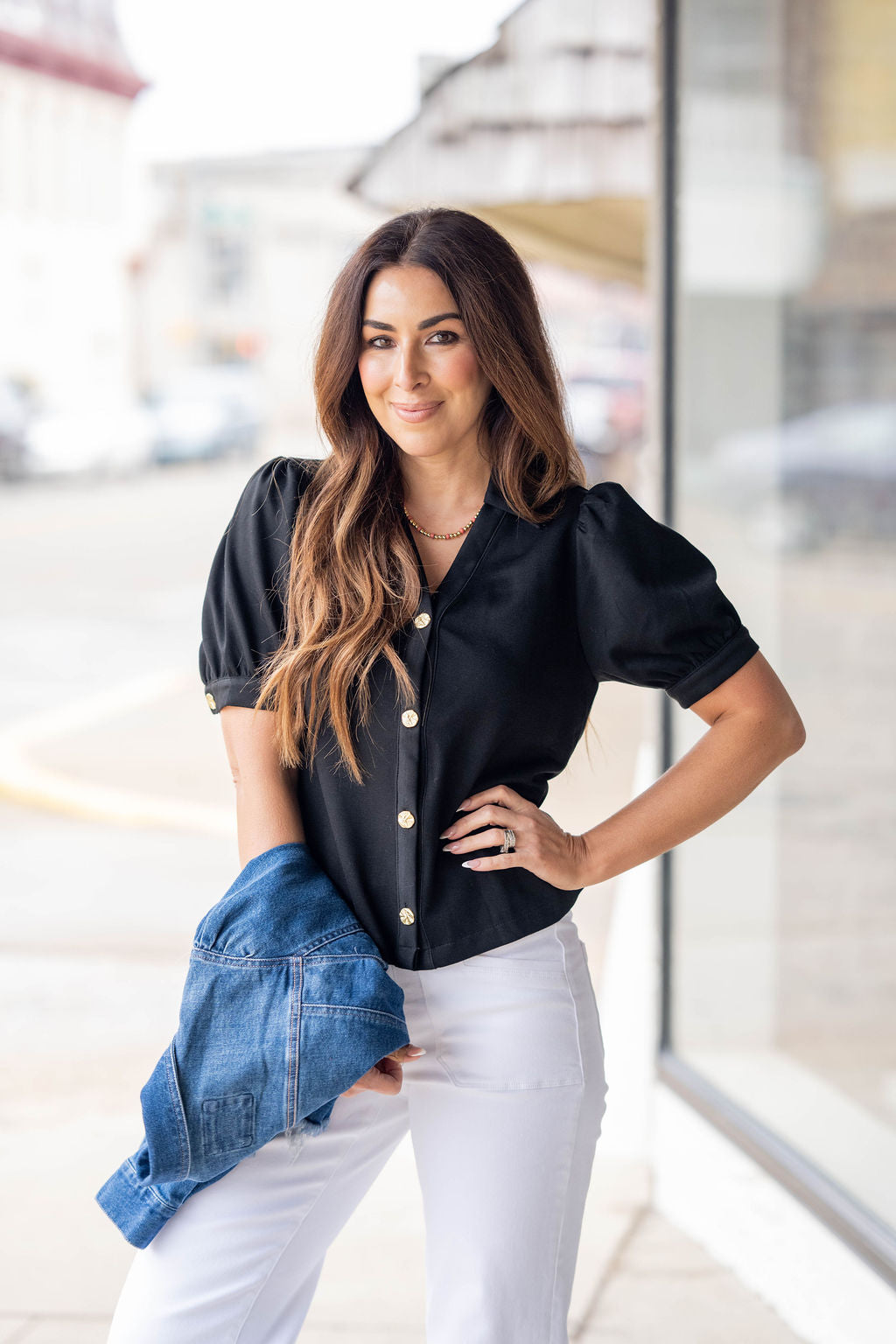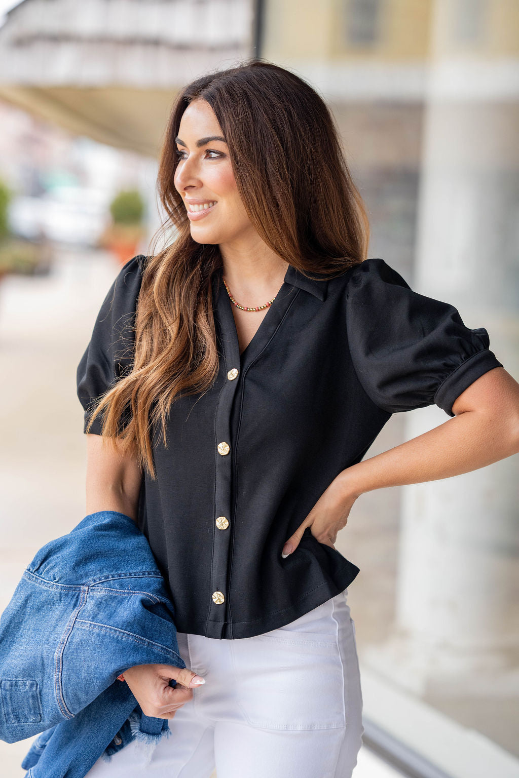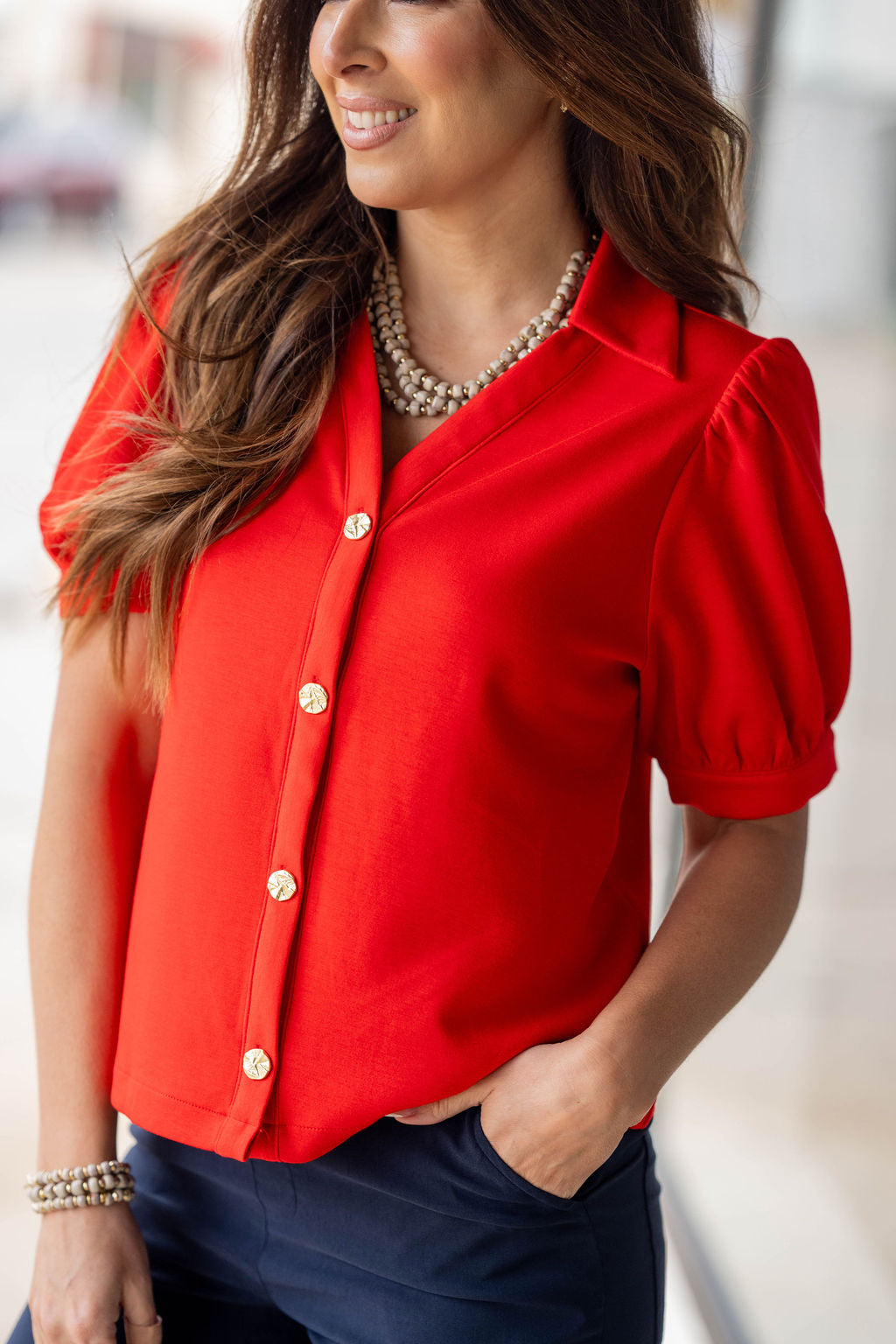 Chic, polished, and effortlessly feminine — this button-front top is a timeless piece that instantly elevates your look. Featuring a flattering relaxed silhouette, delicate puff sleeves, and eye-catching gold button details, this top blends classic style with modern charm.