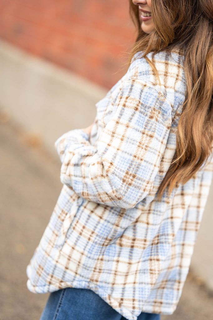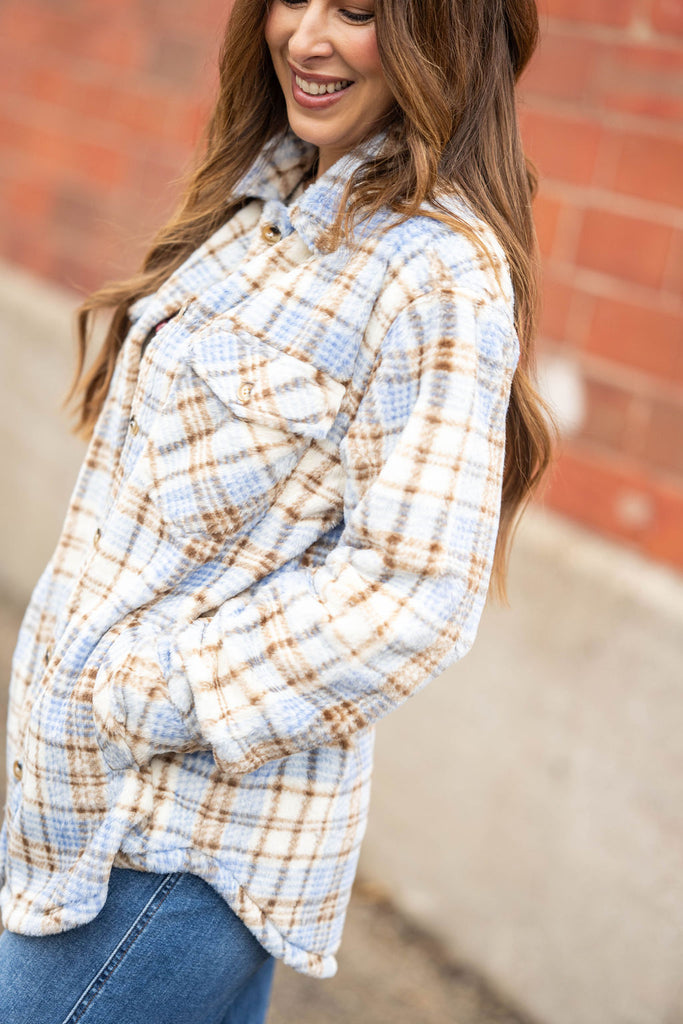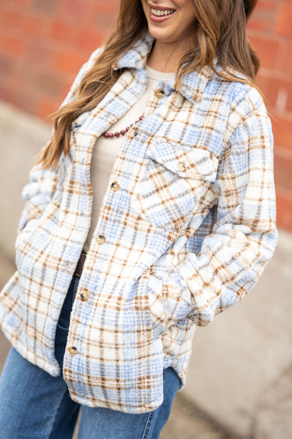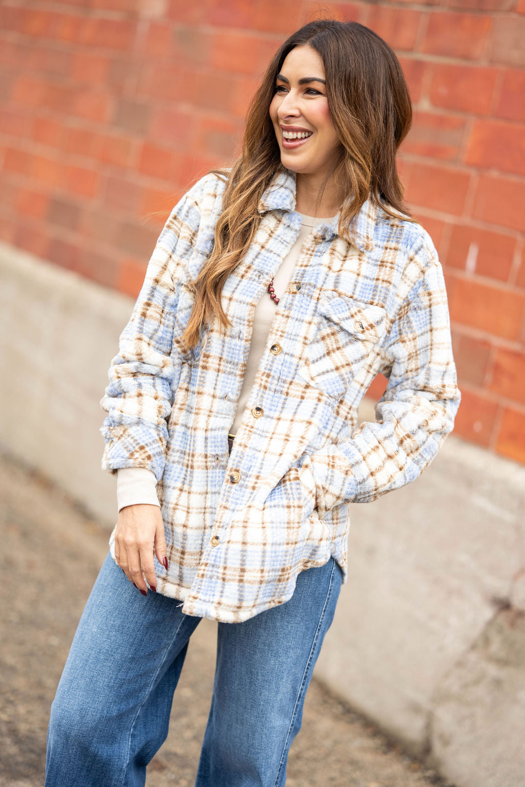 Wrap yourself in softness with this ultra-cozy plaid shacket, designed in a dreamy mix of winter blues and warm caramel tones. The plush, fuzzy texture feels like a hug, while the relaxed fit makes it perfect for layering over your everyday favorites.