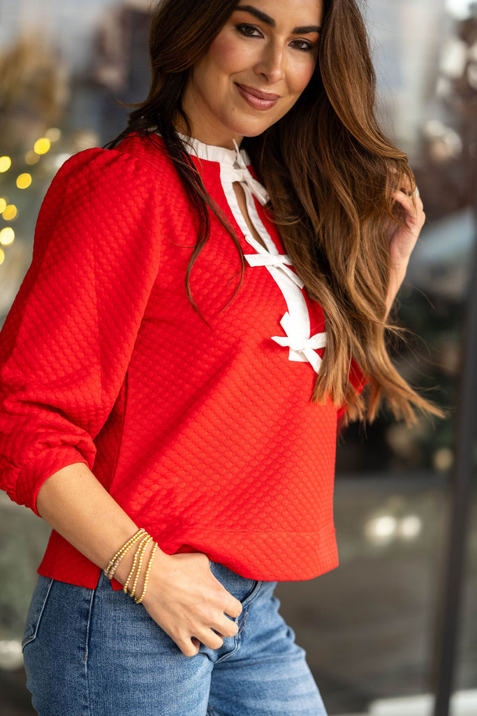 Bow Accented Bold Textured 3/4 Sleeve Sweatshirt