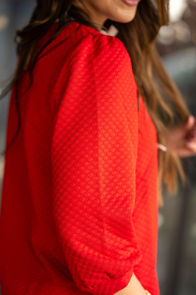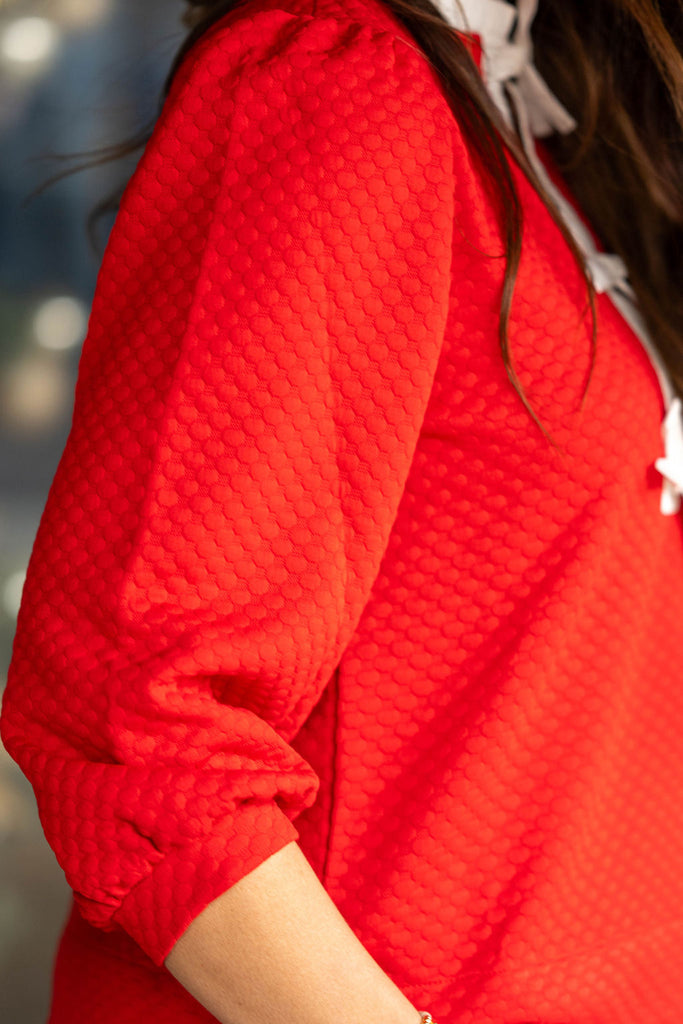 Sweatshirts don’t have to be boring! The bold texture makes the bow accents really pop and the 3/4 sleeves give this a chic vibe! Pair with a fun skirt, your favorite denim, some joggers, or some bold-colored Betsey’s Jeggings! Chilly? Add a vest or shacket with ease! This can be dressed up or down for everyday wear.