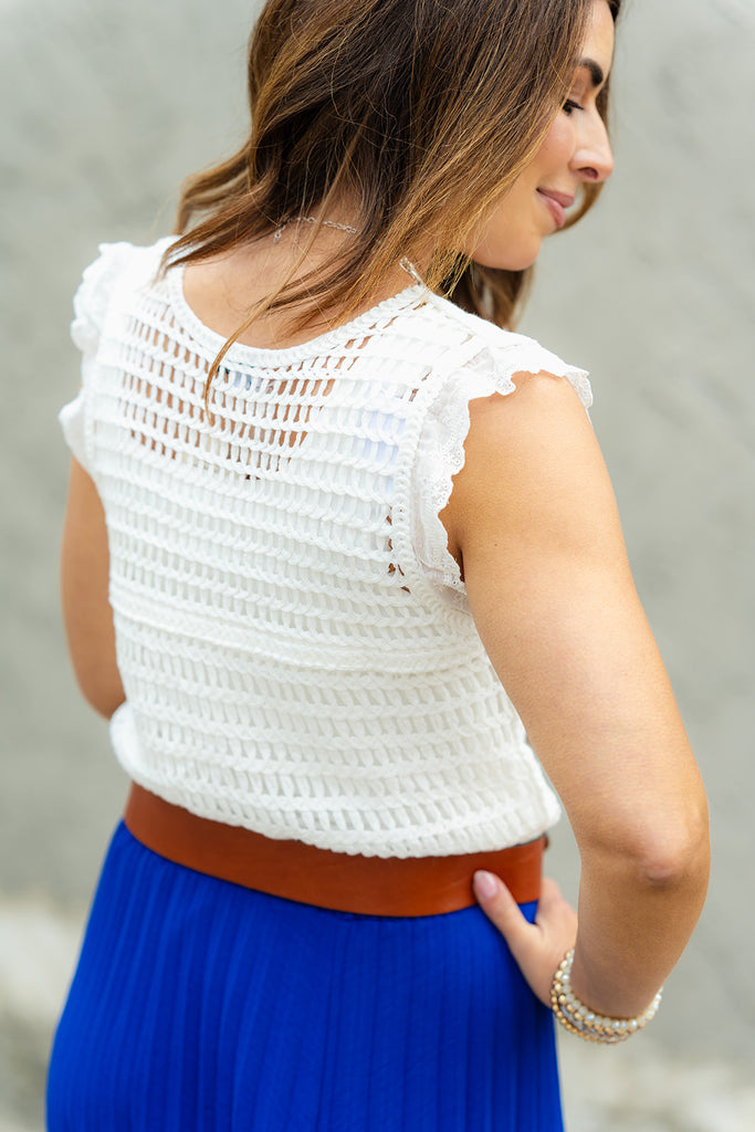 Knit tops aren’t just for the cooler months! This tank can easily be paired with shorts or a skirt for the warmer ones too! We love the crocheted look with the button detailing and eyelet trim of this tank! Add a cardigan, blazer, or jacket for the cooler months.