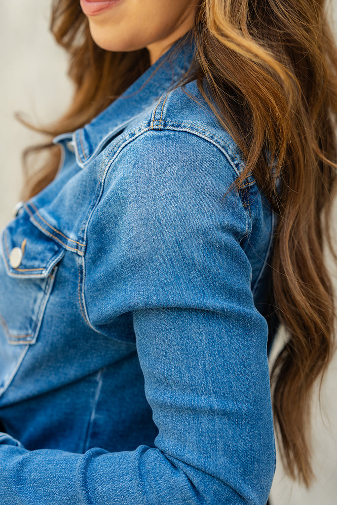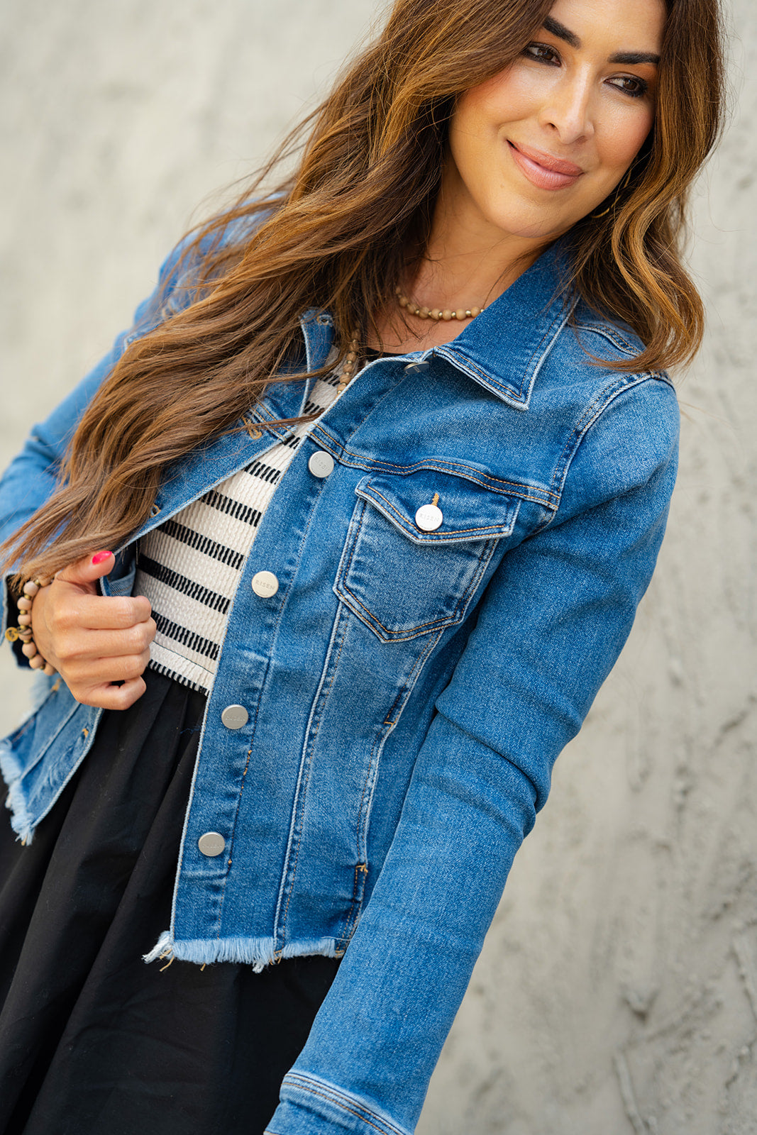 Denim jackets have always been a staple piece in your wardrobe but this one is a must have! The frayed bottom and distressed look gives it that little bit of "edge"! With the perfect amount of stretch, this also makes this piece ideal for everyday wear. Pair with anything from a sundress, to a blouse, to a graphic tee and leggings combo! The possibilities are endless with this one!