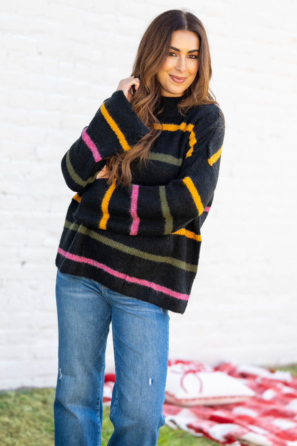 This super soft sweater features a fun wide sleeve and bold-colored stripes! Pair with leggings, denim, joggers, or with a fun pair of our Betsey's Jeggings! Don't forget your favorite accessories to complete the look!